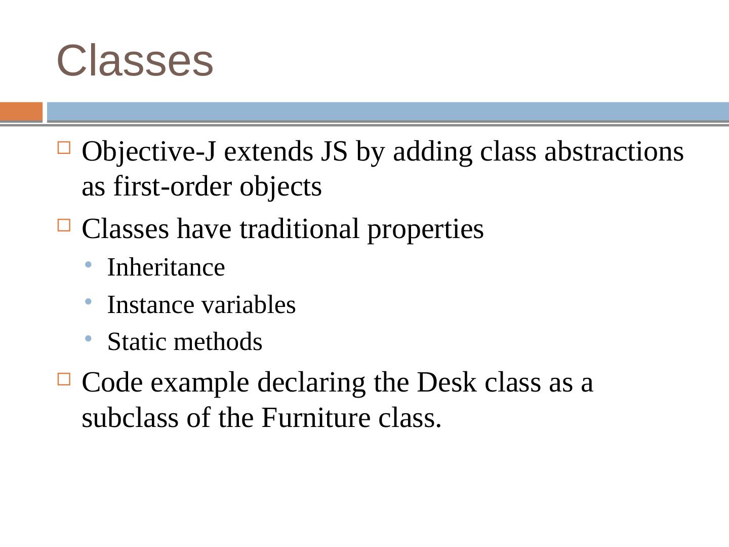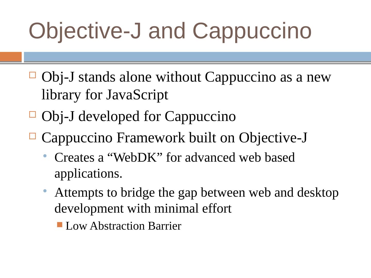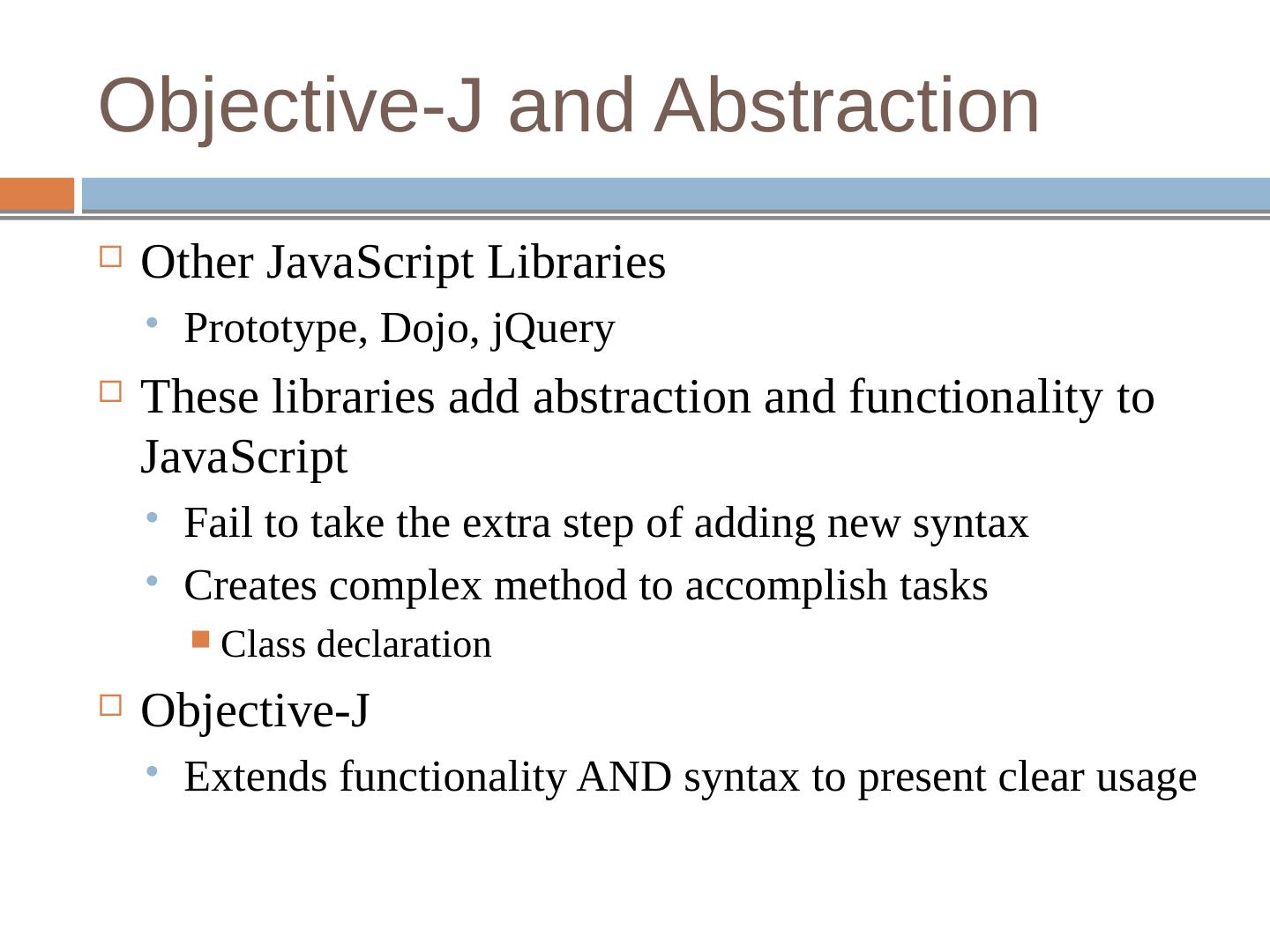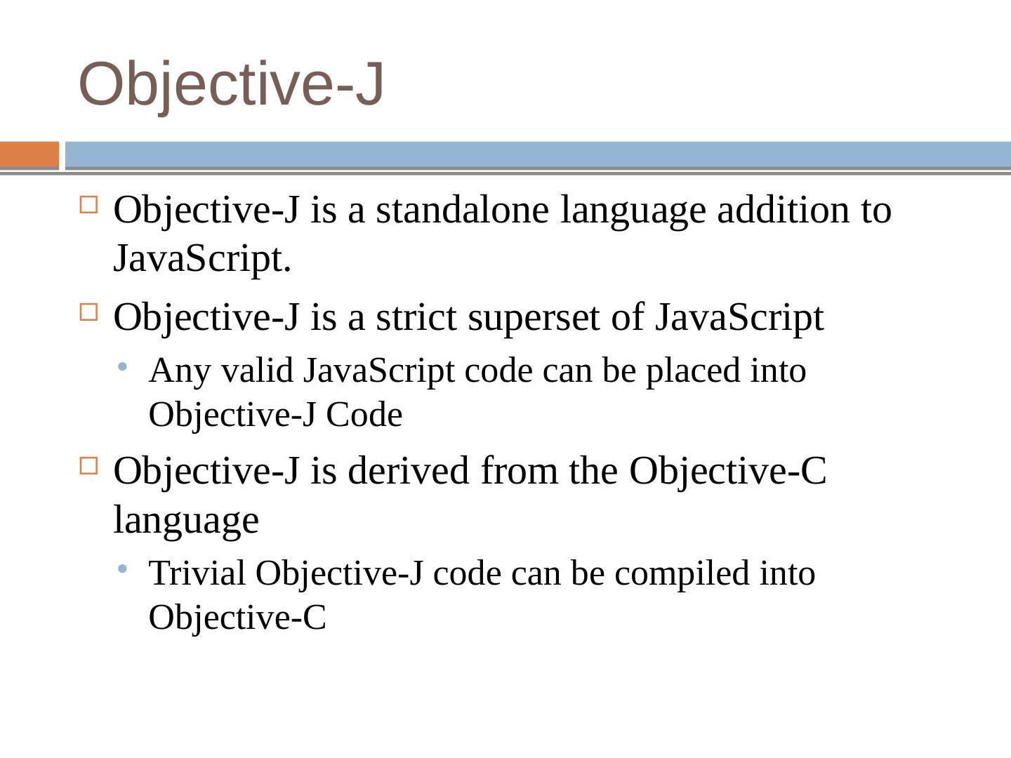 Objective-J is a strict superset of JavaScript. Any valid JavaScript code can be placed into Objective-J Code. Objective-J is derived from the Objective-C ...