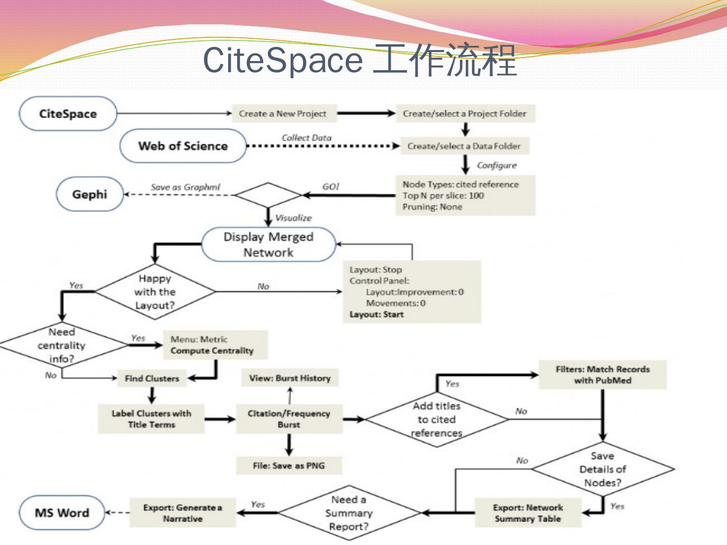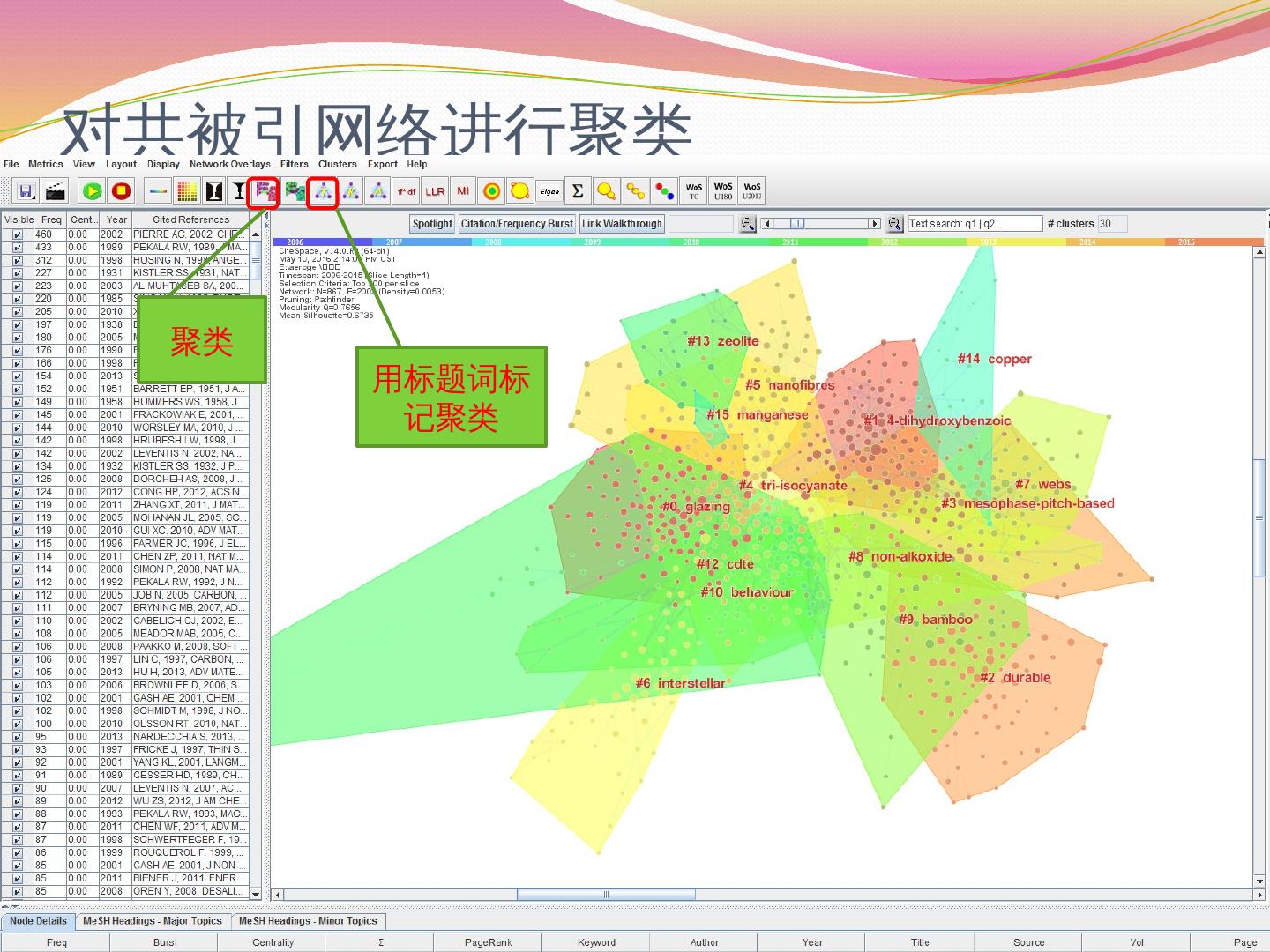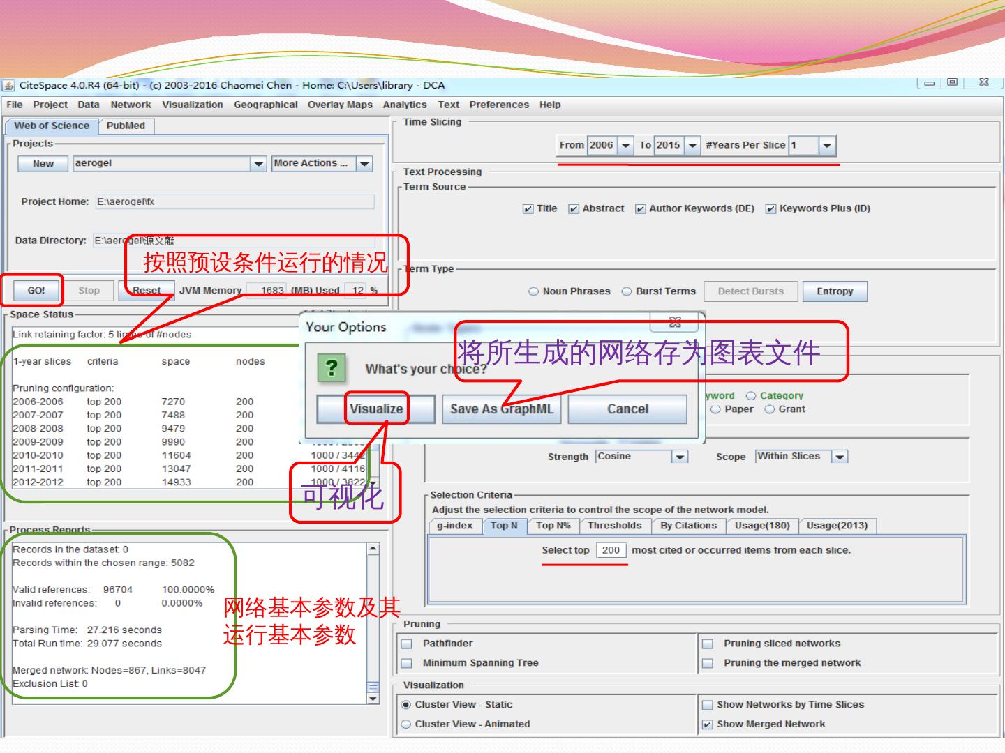 2、最小生成树. 3、修剪切片网. 4、修剪合并网. 视图显示形式. 使用CiteSpace进行文献的共被引分析. 分析结果保存. 数据文件夹. 按照预设条件运行的情况.