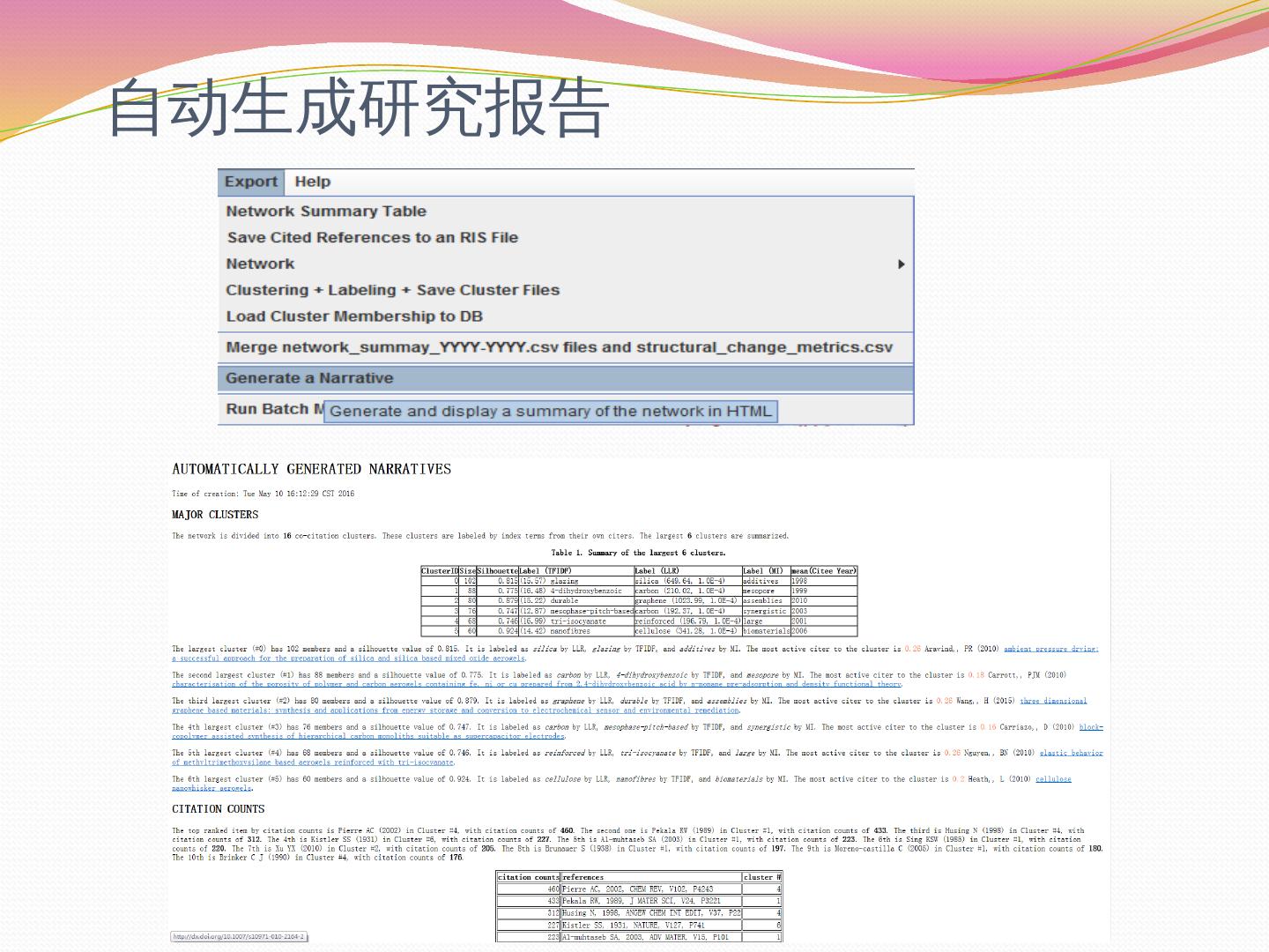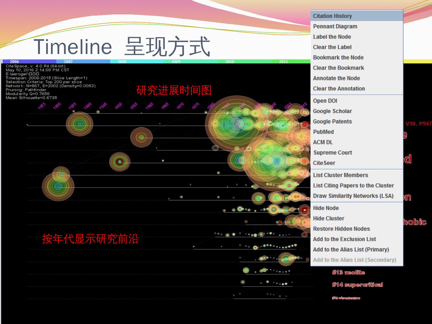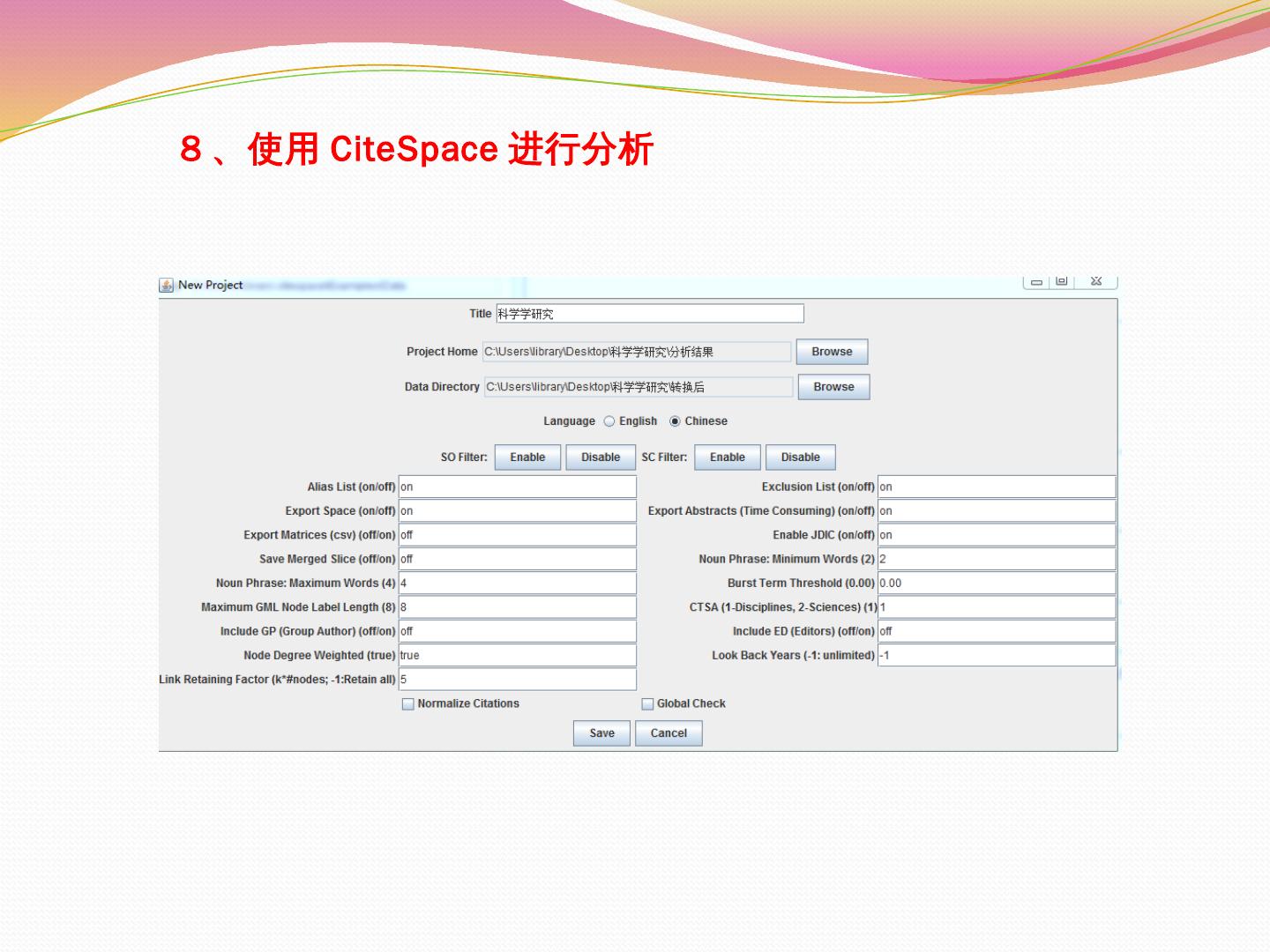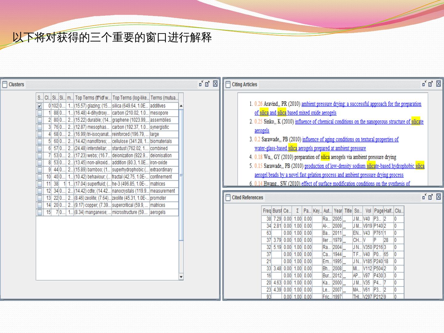 2、最小生成树. 3、修剪切片网. 4、修剪合并网. 视图显示形式. 使用CiteSpace进行文献的共被引分析. 分析结果保存. 数据文件夹. 按照预设条件运行的情况.