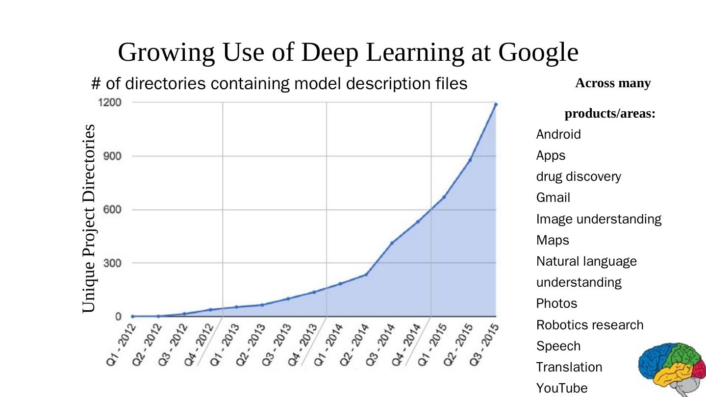 Examples of using these for solving real problems. TensorFlow: software infrastructure. Unique Project Directories. Growing Use of Deep Learning at Google.