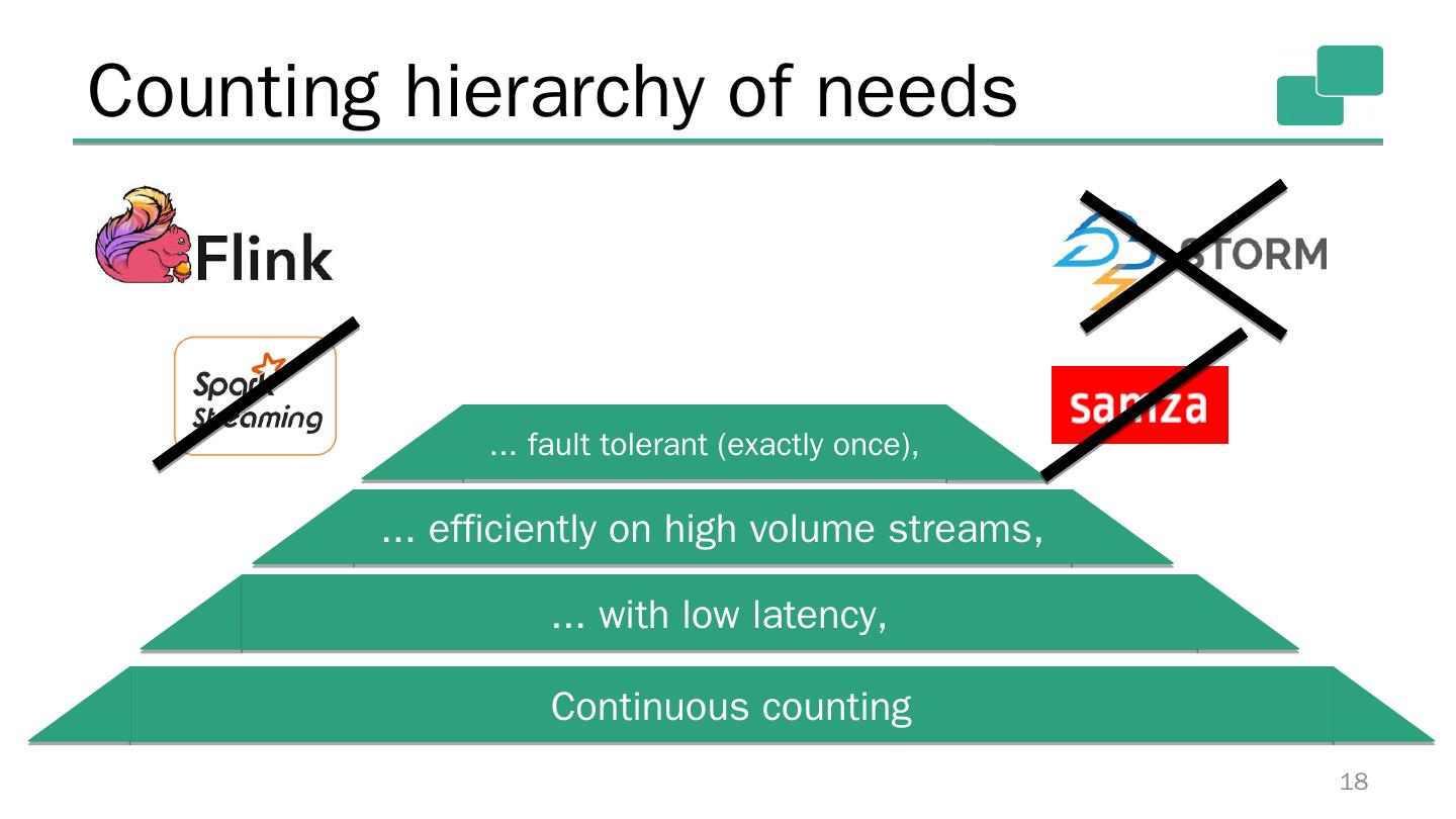 17 .Counting hierarchy of needs 17 Continuous counting ... with low latency, ... efficiently on high volume streams,
