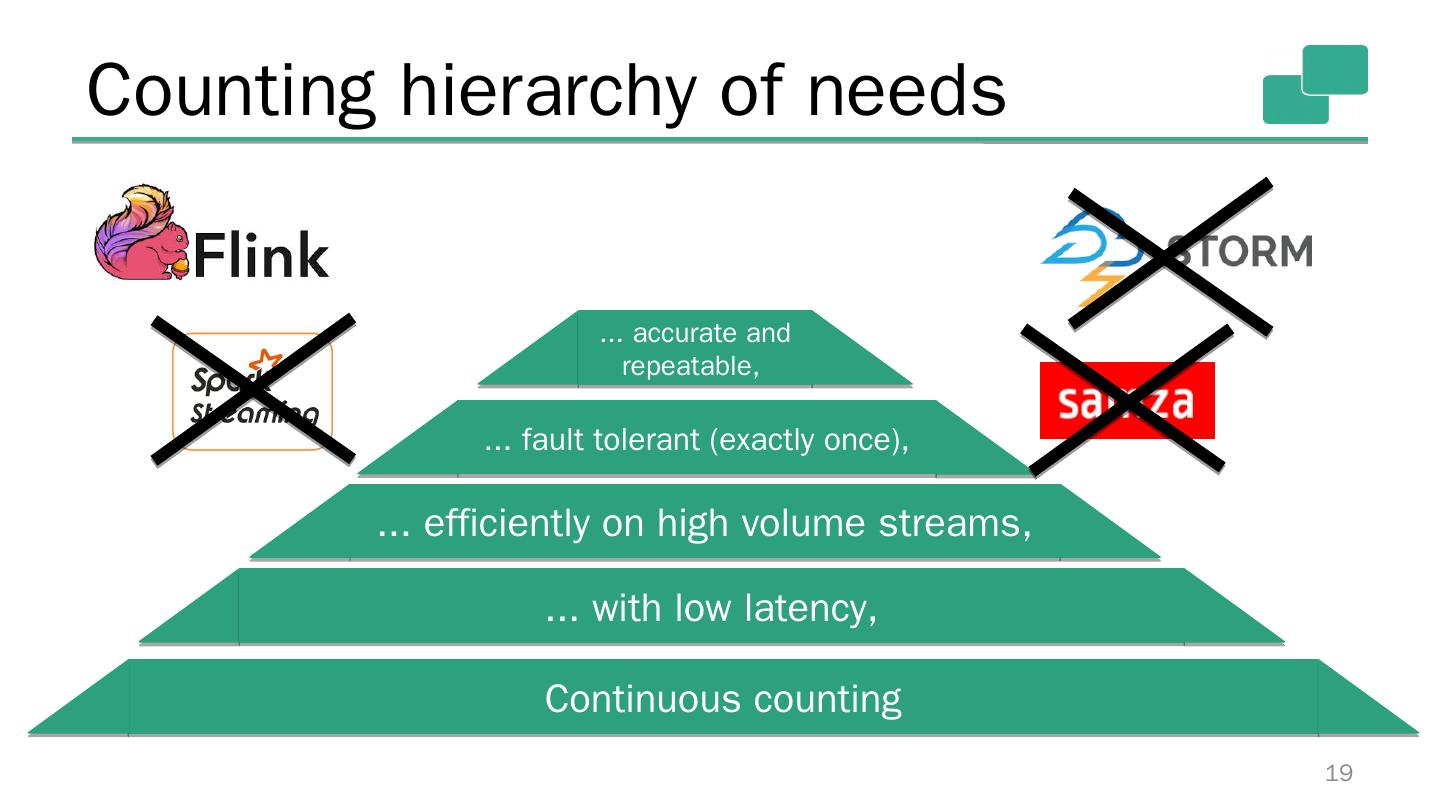 18 .Counting hierarchy of needs 18 Continuous counting ... with low latency, ... efficiently on high volume streams, ... fault tolerant (exactly once),