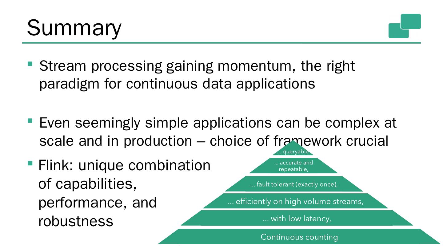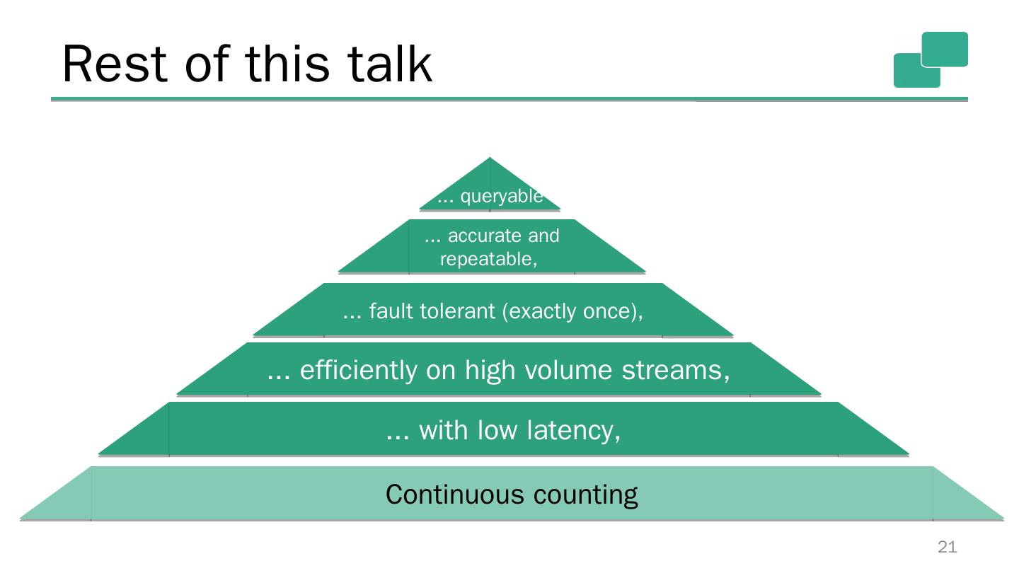 20 .Counting hierarchy of needs 20 Continuous counting ... with low latency, ... efficiently on high volume streams, ... fault tolerant (exactly once), ... accurate and repeatable, ... queryable 1.1+
