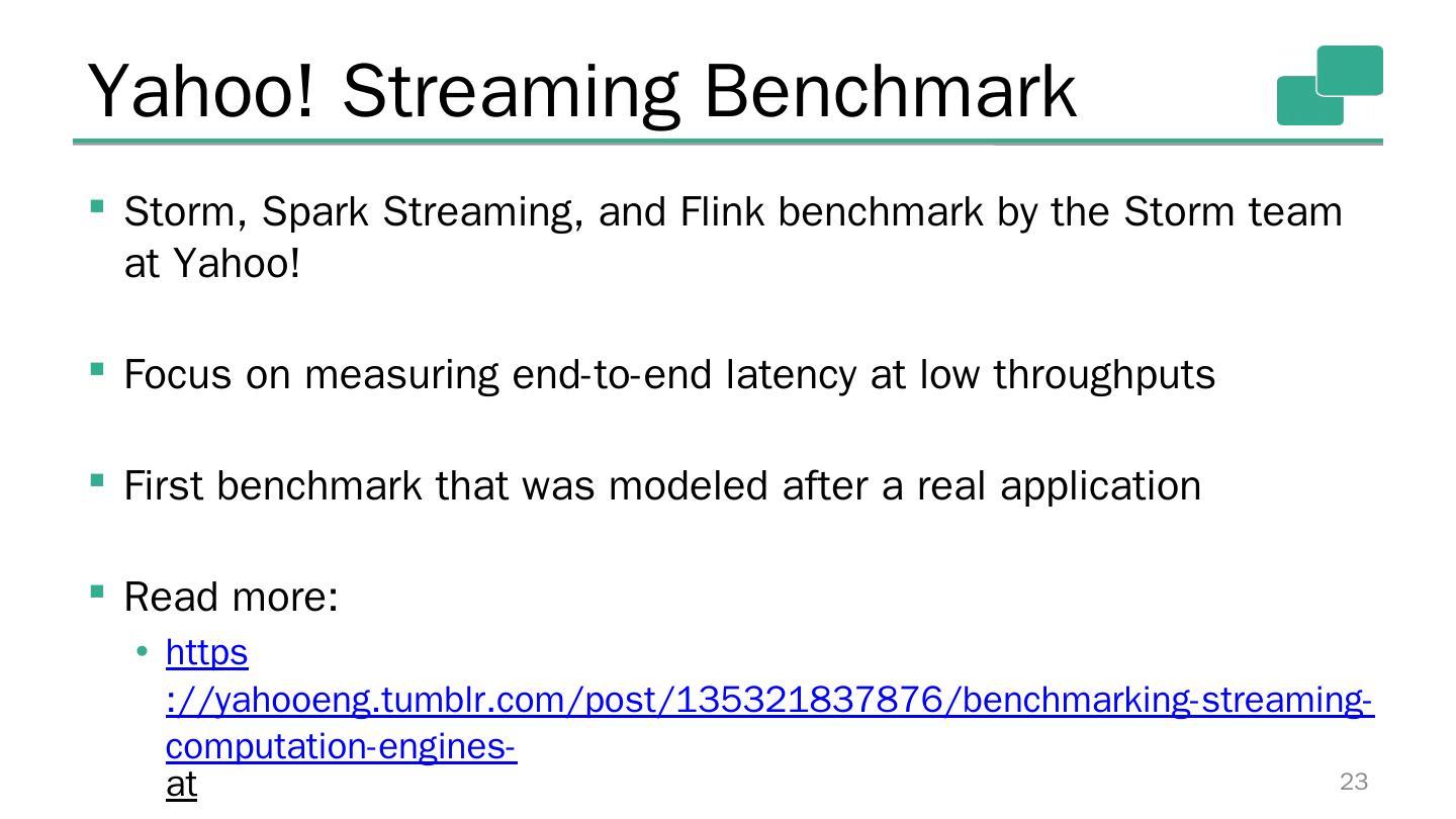 23 .Yahoo! Streaming Benchmark 23 Storm, Spark Streaming, and Flink benchmark by the Storm team at Yahoo! Focus on measuring end-to-end latency at low throughputs First benchmark that was modeled after a real application Read more: https ://yahooeng.tumblr.com/post/135321837876/benchmarking-streaming-computation-engines- at
