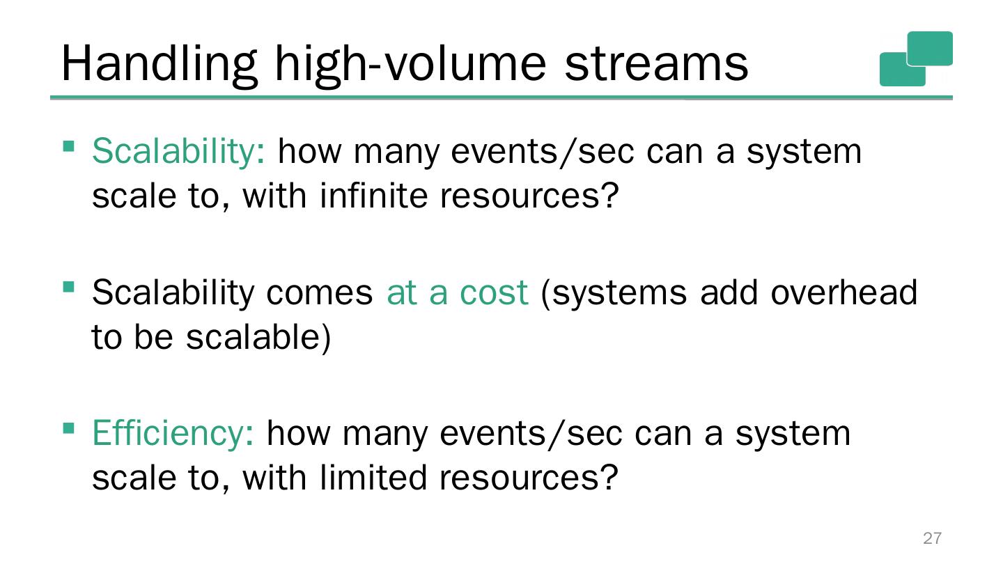 27 .Handling high-volume streams Scalability: how many events/sec can a system scale to, with infinite resources? Scalability comes at a cost (systems add overhead to be scalable) Efficiency: how many events/sec can a system scale to , with limited resources? 27