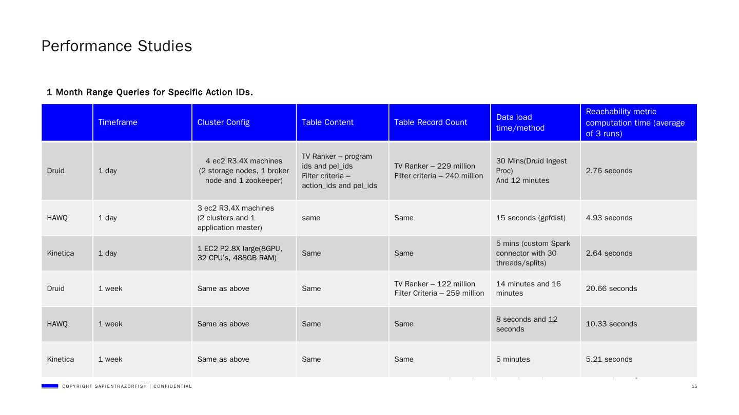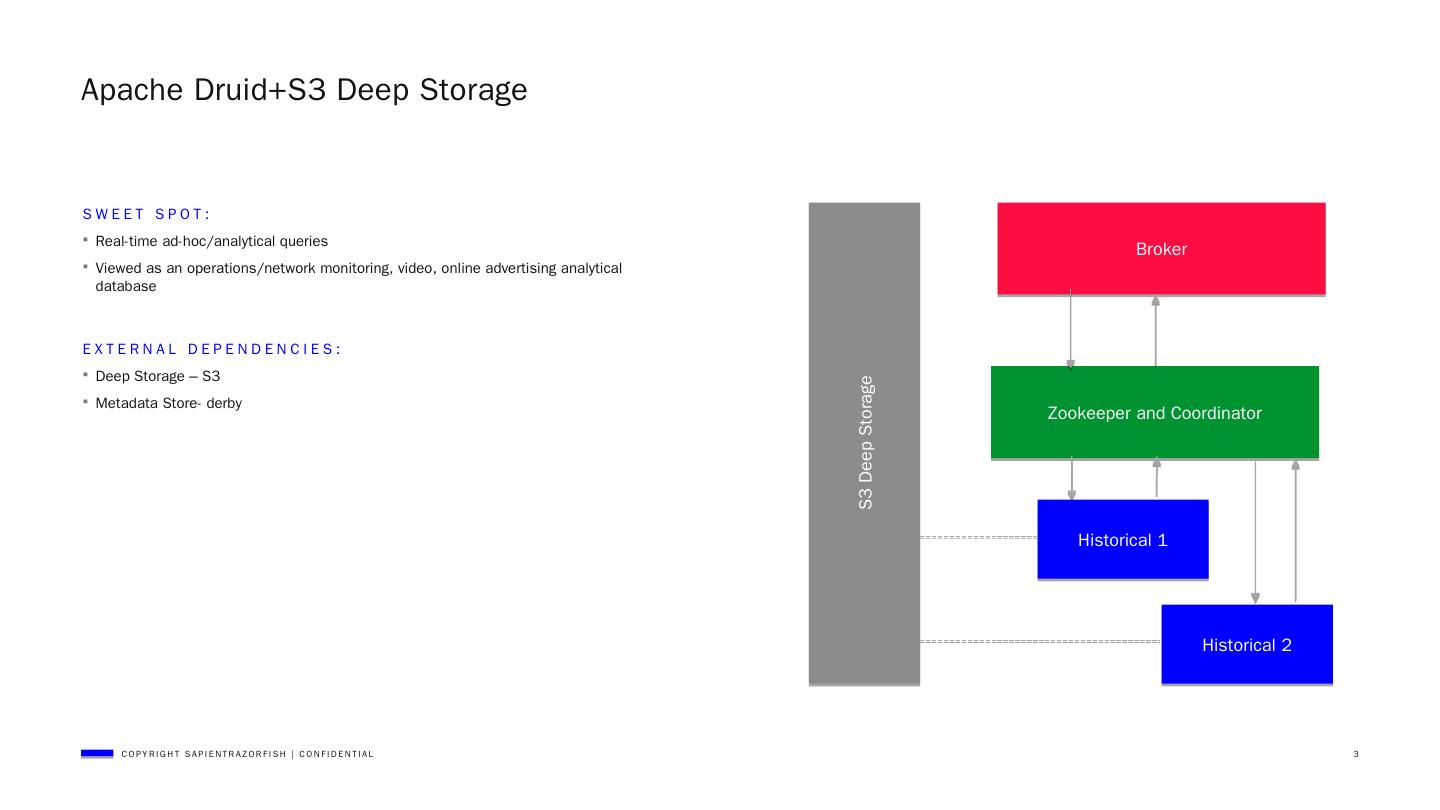 Apache Druid+S3 Deep Storage. Sweet spot: Real-time ad-hoc/analytical queries; Viewed as an operations/network monitoring, video, online advertising ...