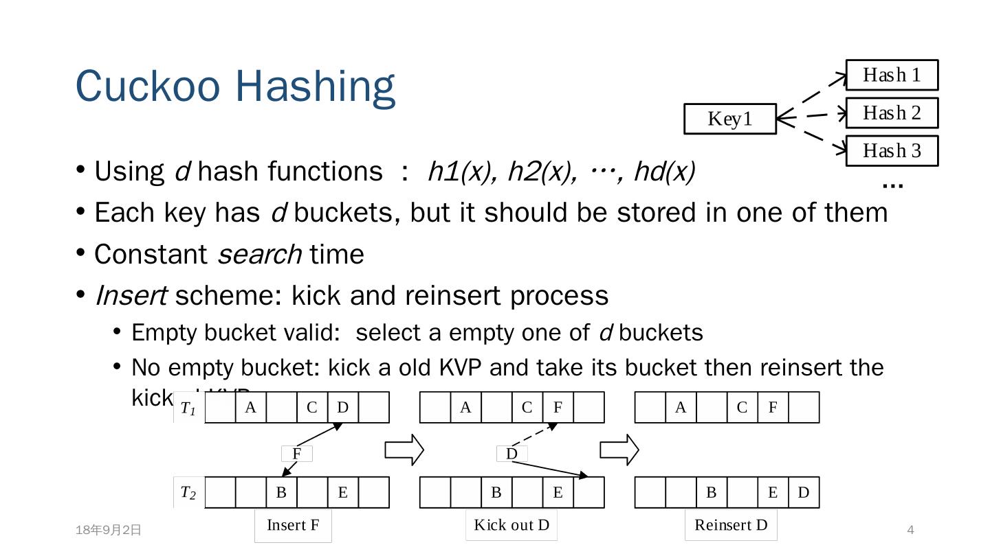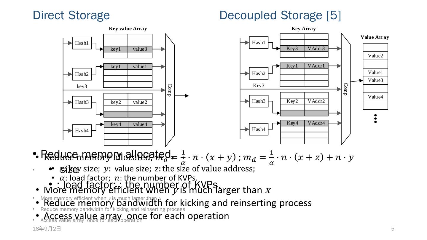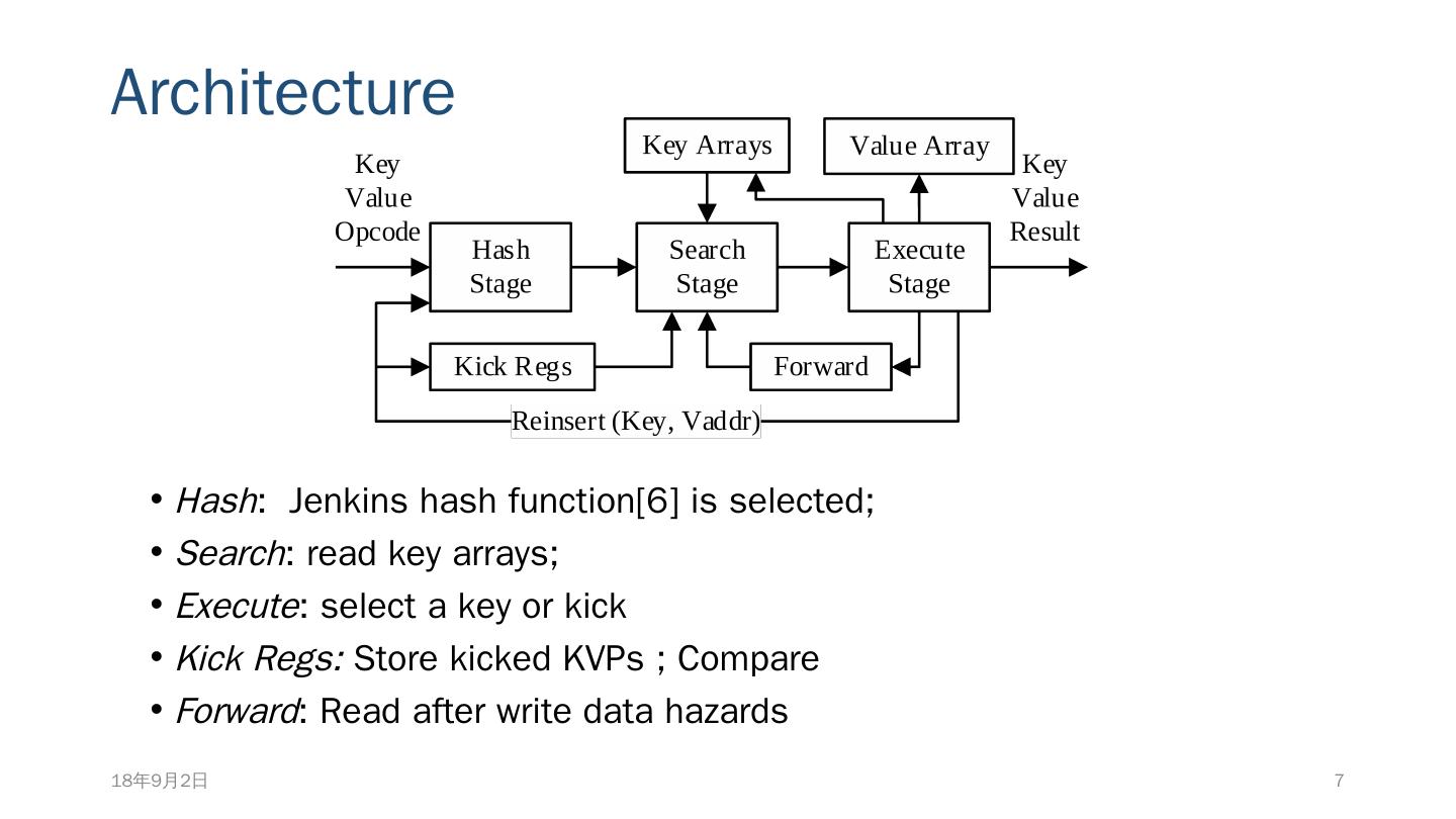Hash: Jenkins hash function[6] is selected;; Search: read key arrays;; Execute: select a key or kick; Kick Regs: Store kicked KVPs ; Compare; Forward: Read after ...