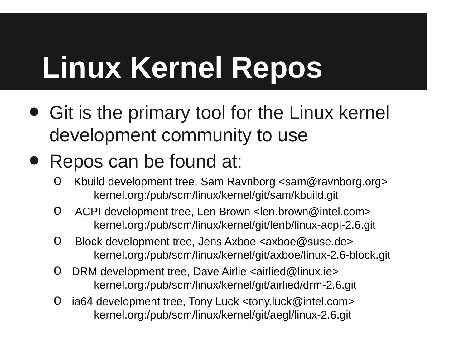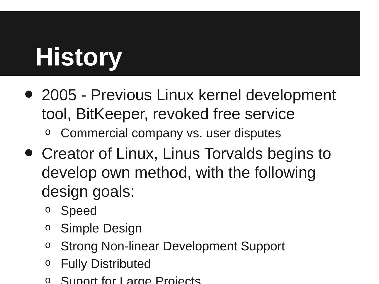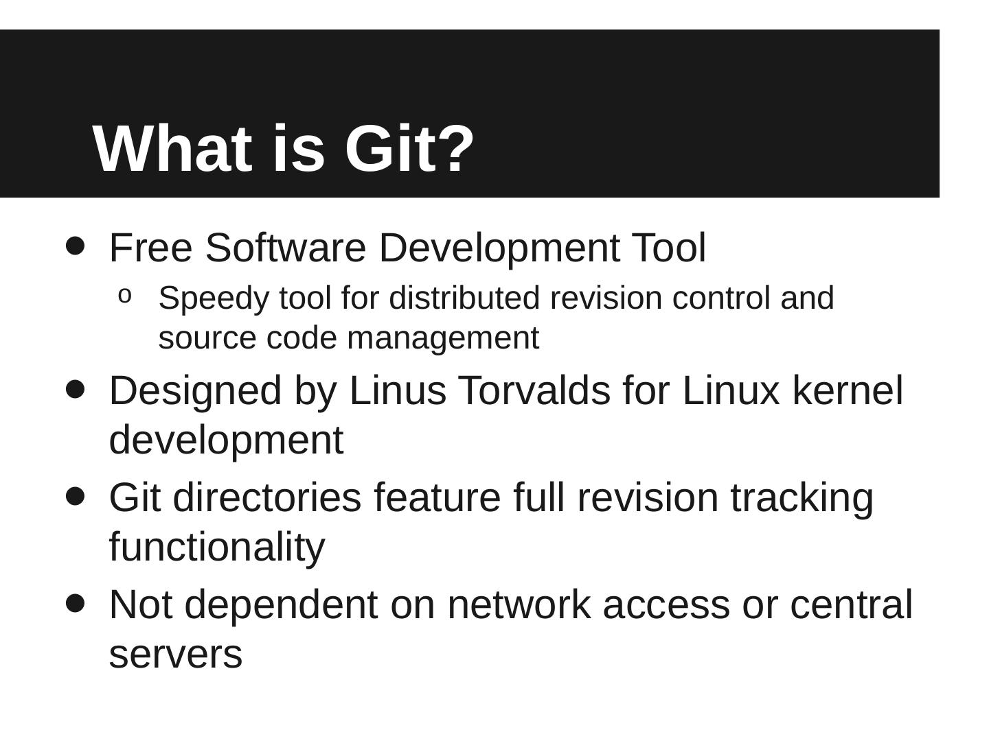 Designed by Linus Torvalds for Linux kernel development; Git directories feature full revision tracking functionality; Not dependent on network access or central ...