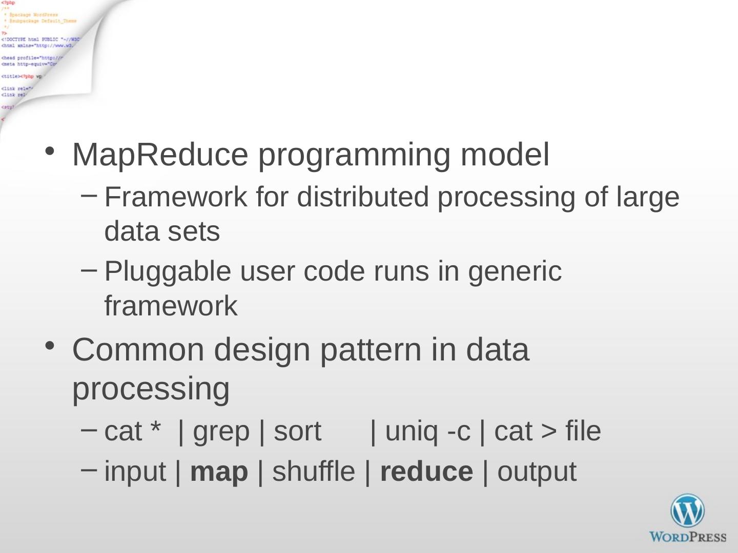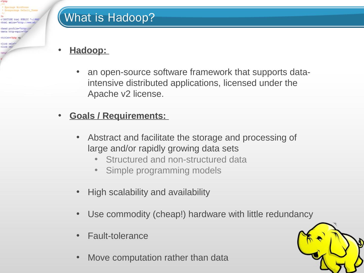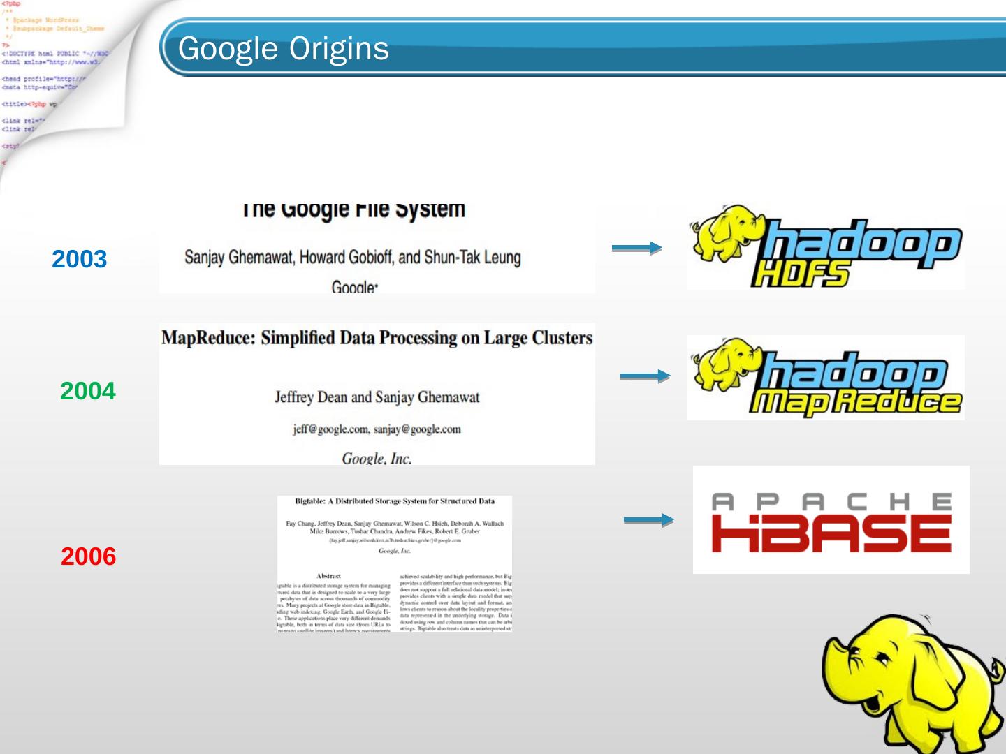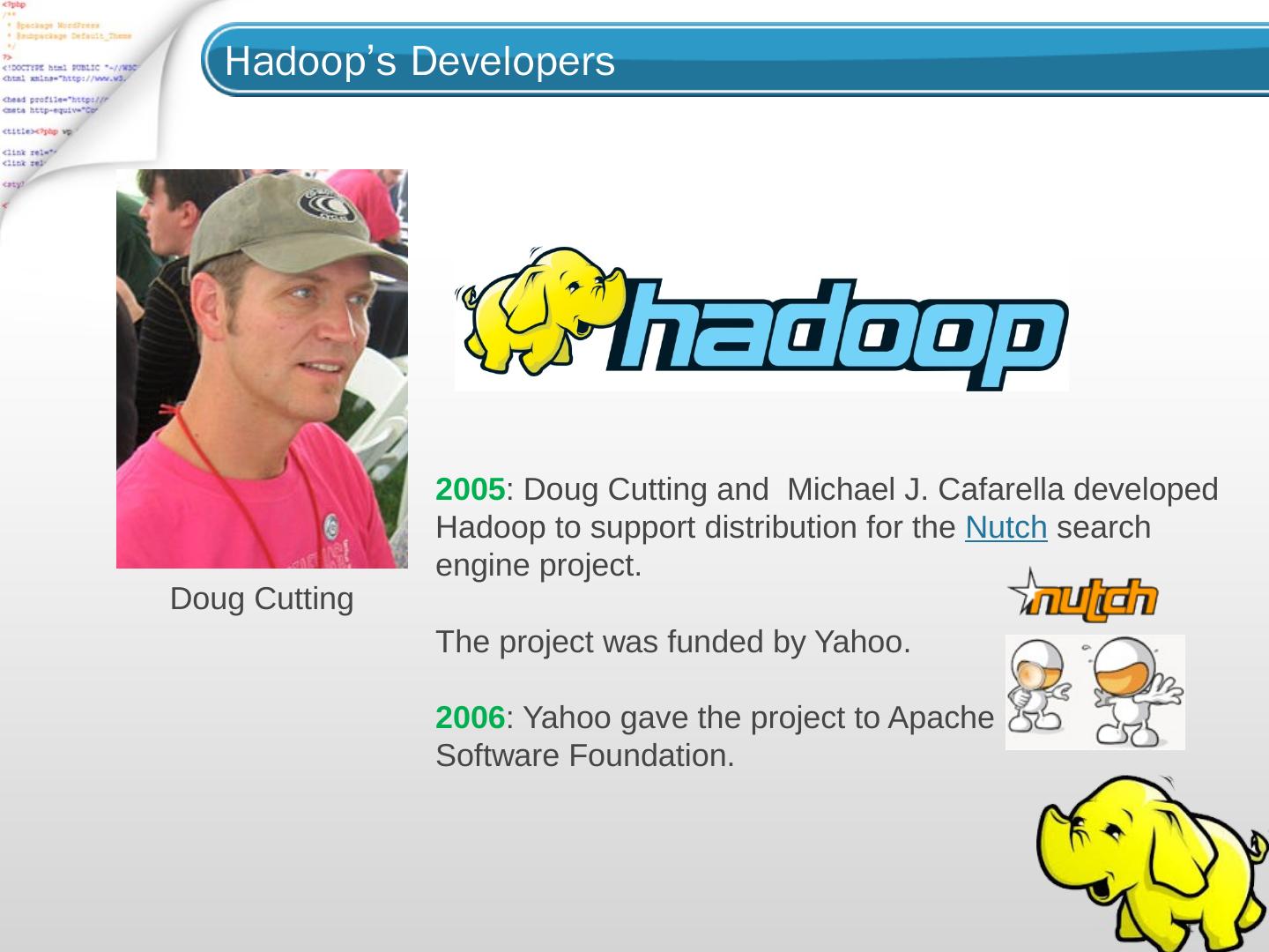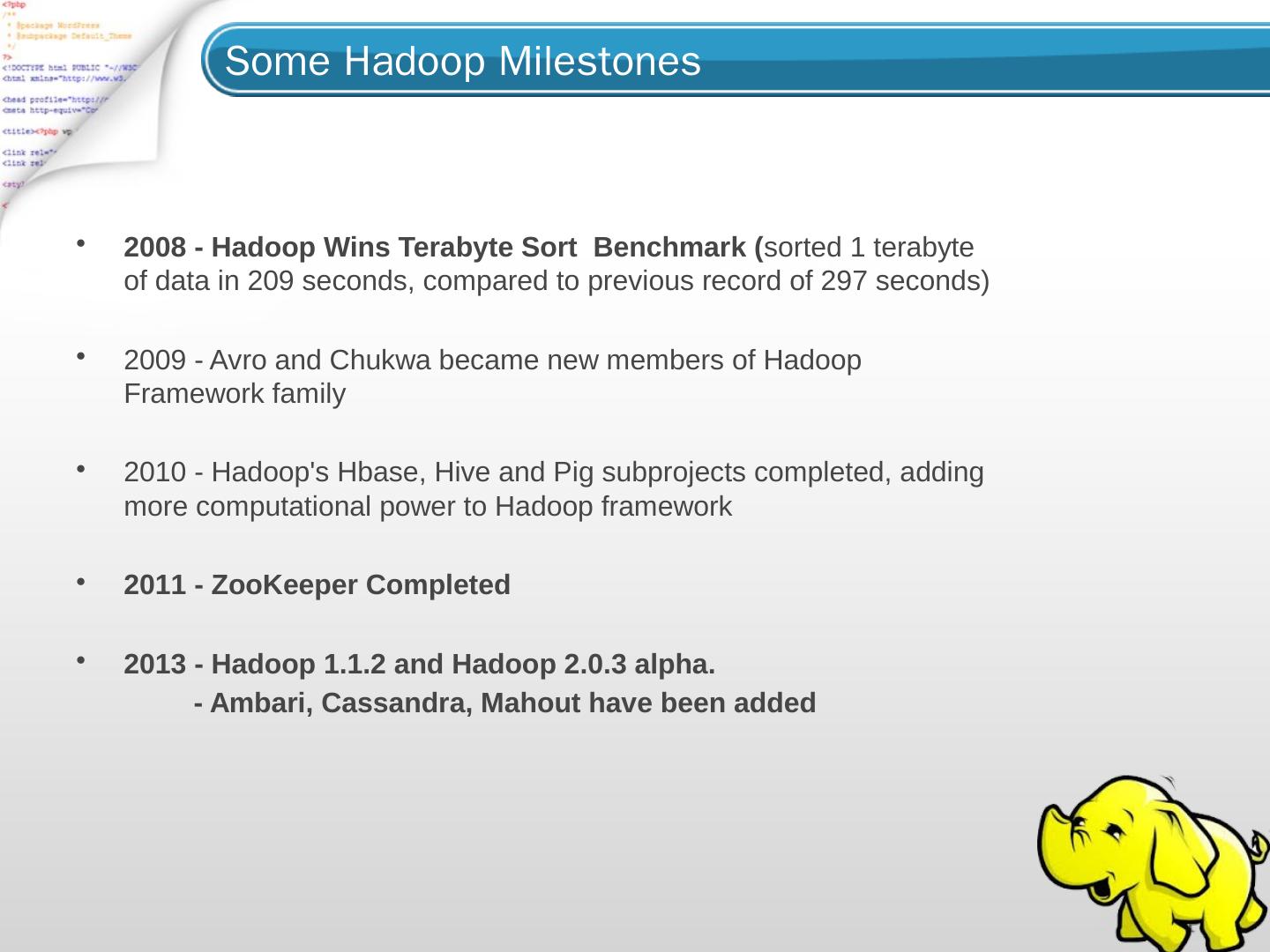 Apache top level project, open-source implementation of frameworks for reliable, ... 2010 - Hadoop's Hbase, Hive and Pig subprojects completed, adding more ...