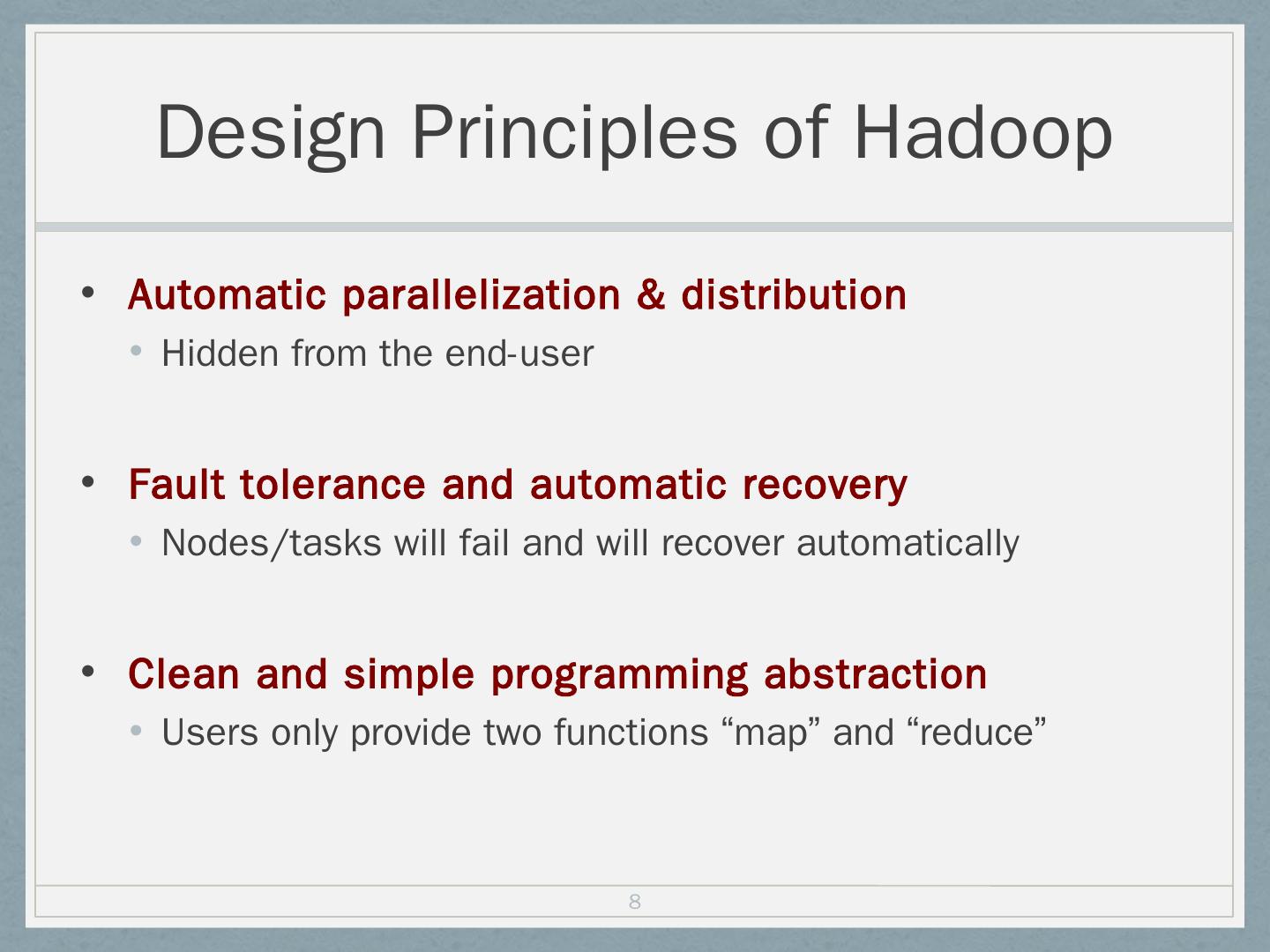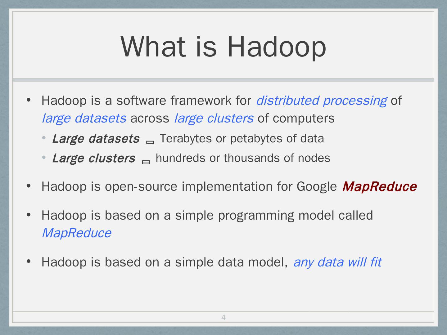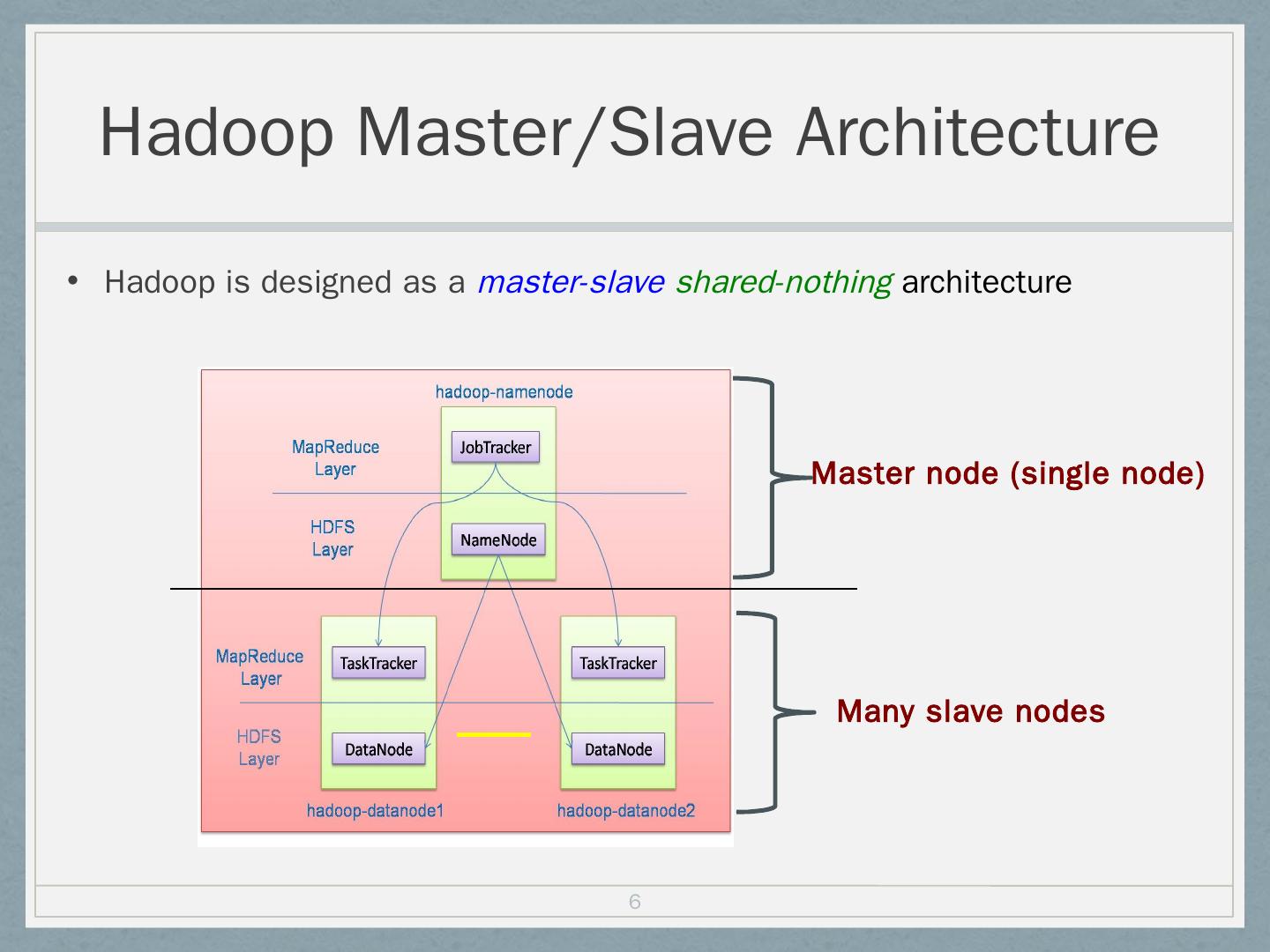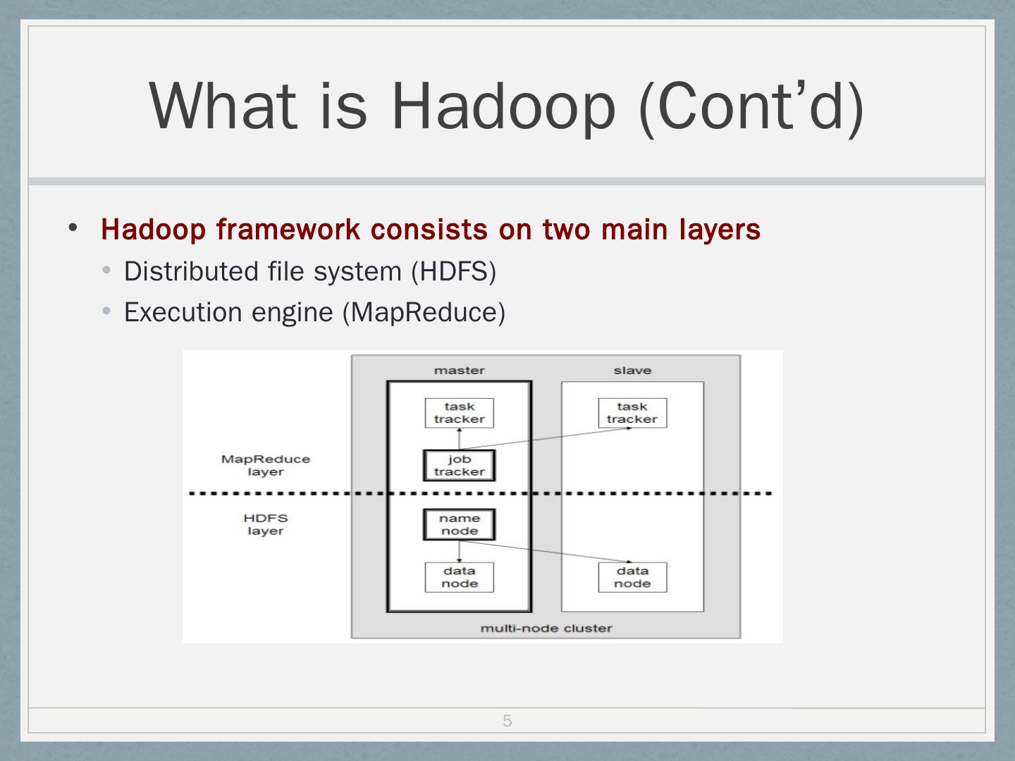 Distributed file system (HDFS); Execution engine (MapReduce). 5. Hadoop Master/Slave Architecture. Hadoop is designed as a master-slave shared-nothing ...