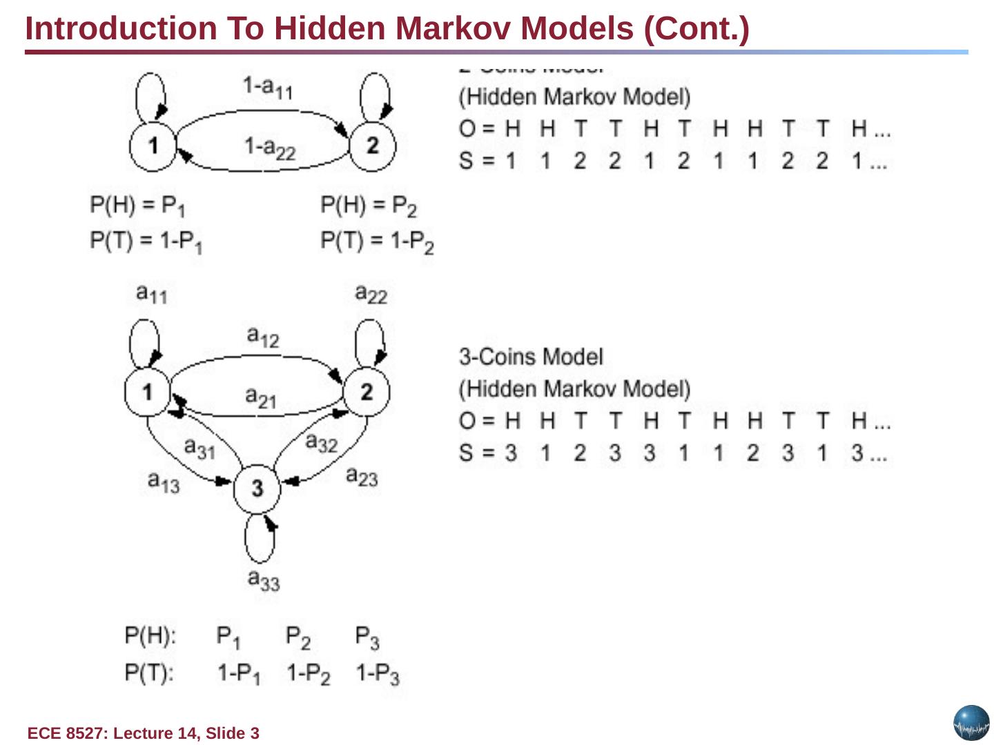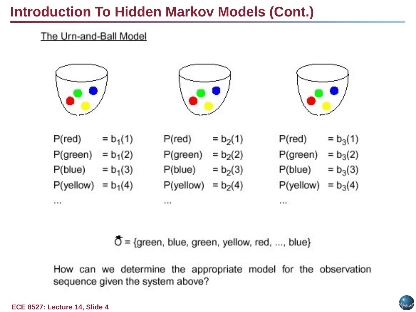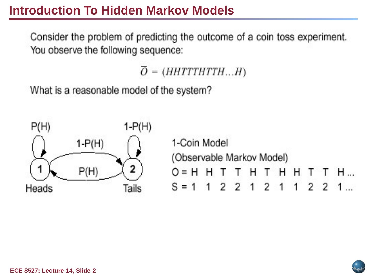 LECTURE 14: HIDDEN MARKOV MODELS – BASIC ELEMENTS. ECE 8527: Lecture 14, Slide 1. Introduction To Hidden Markov Models. ECE 8527: Lecture 14, ...