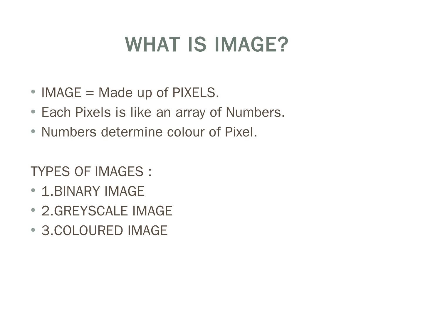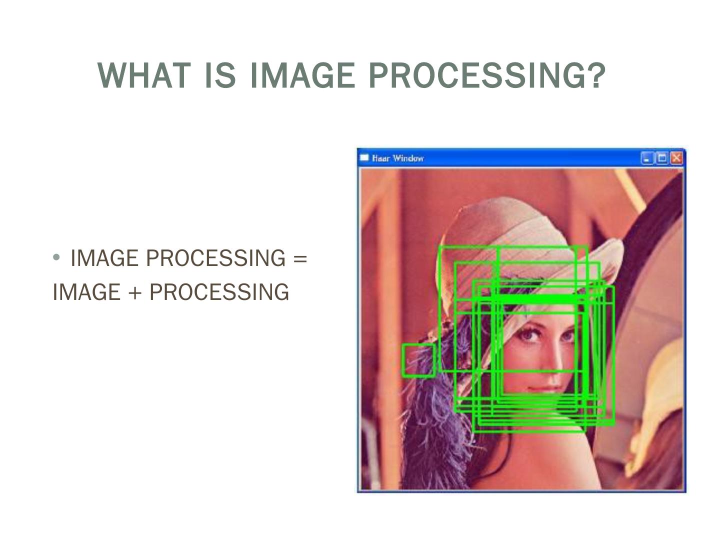 Image processing and opencv. WHAT IS IMAGE PROCESSING? IMAGE PROCESSING = IMAGE + PROCESSING. WHAT IS IMAGE? IMAGE = Made up of ...