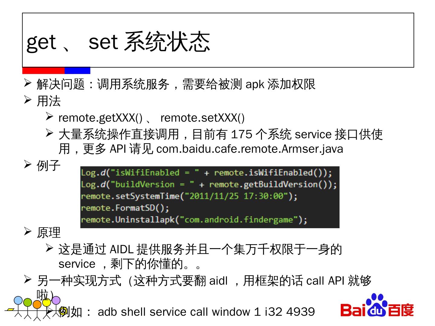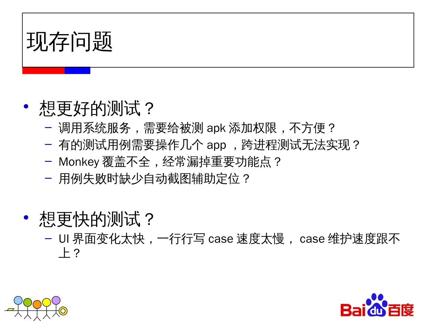 想更好的测试? 调用系统服务,需要给被测apk添加权限,不方便? 有的测试用例需要操作几个app,跨进程测试无法实现? Monkey覆盖不全,经常漏掉重要功能点 ...