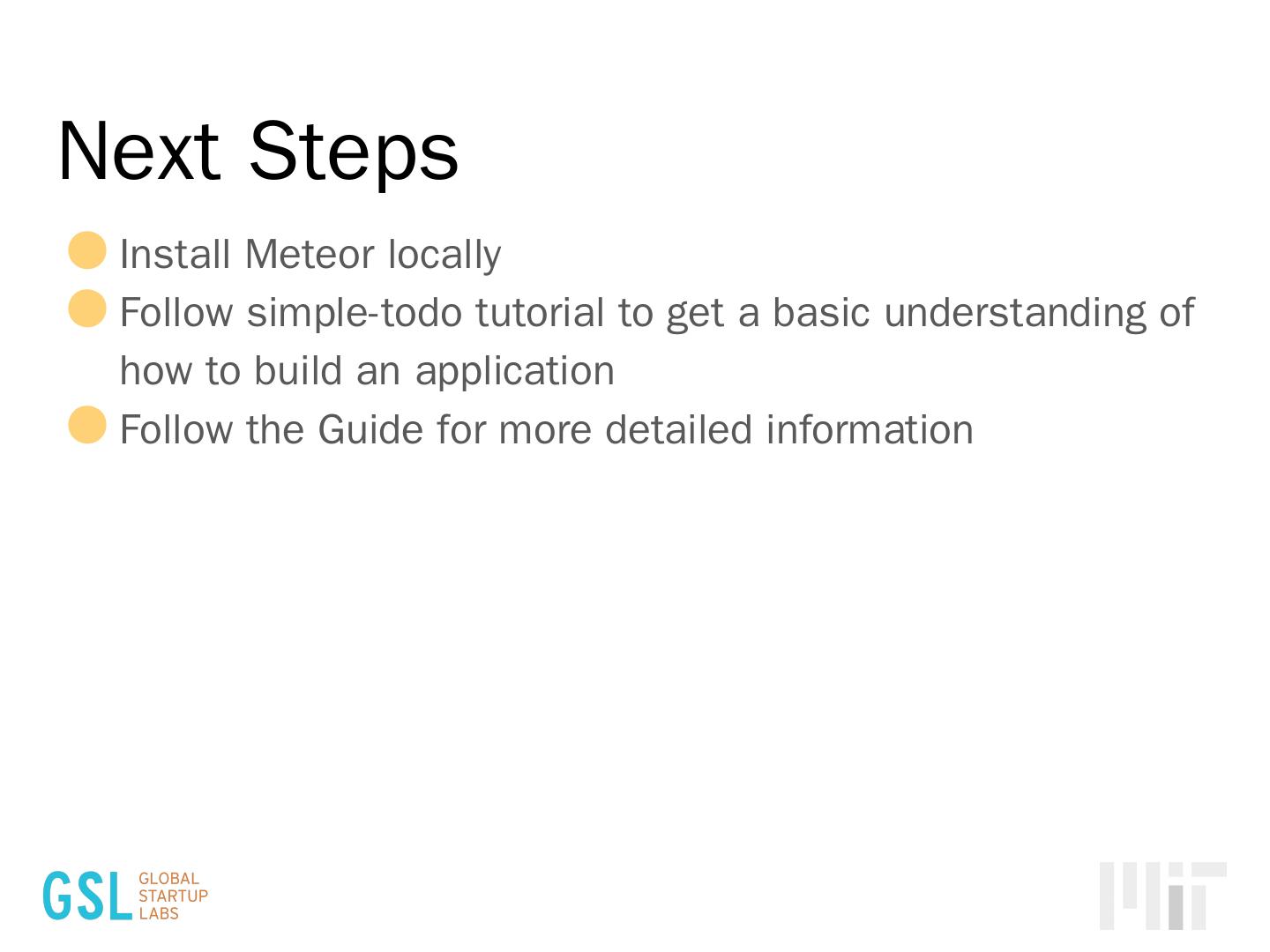 Methods. Containers. MongoDB (Database). https://meteor.com/install. Boilerplate code. Never need to start from scratch. There is a lot of repetition in building a ...