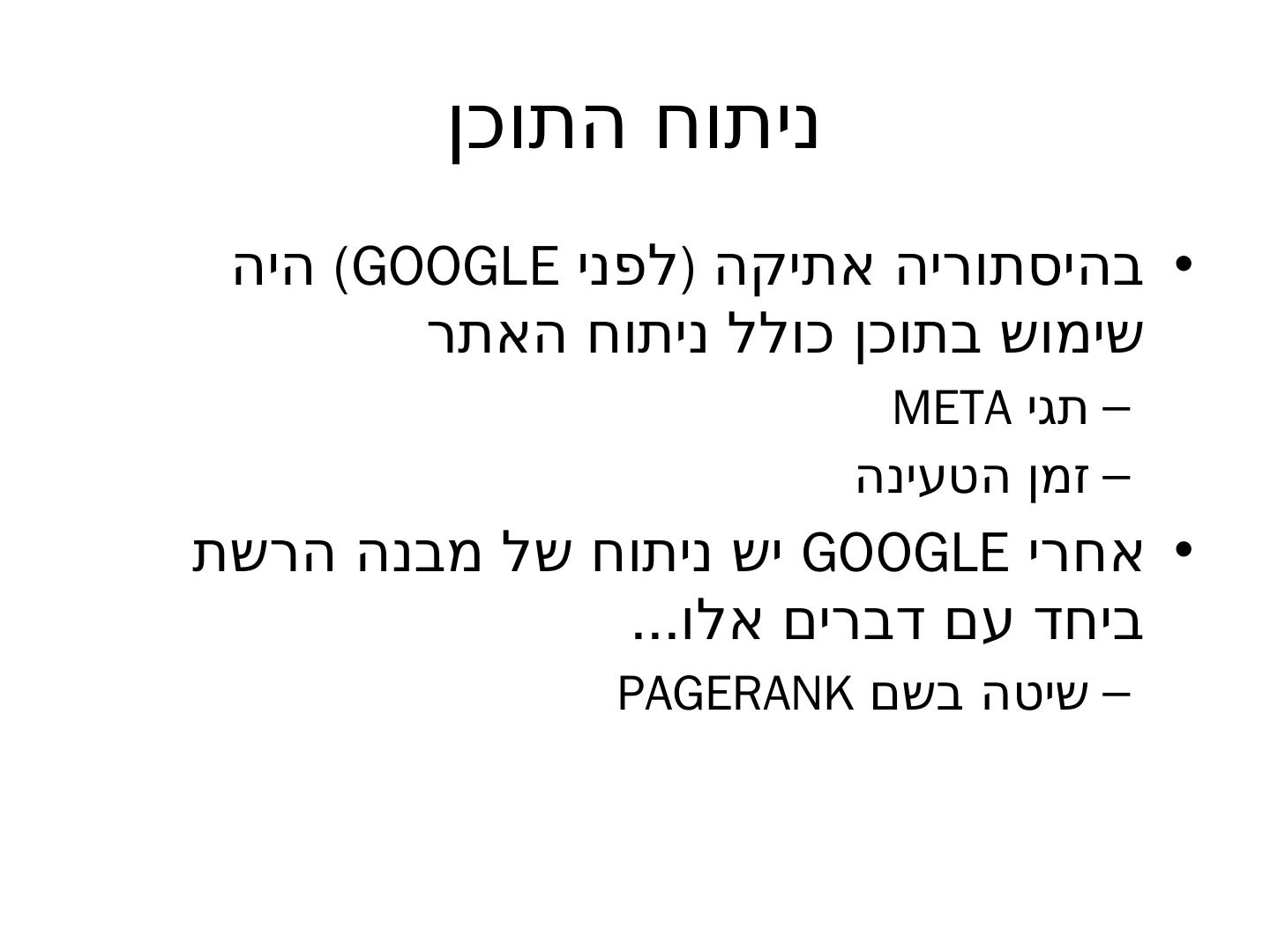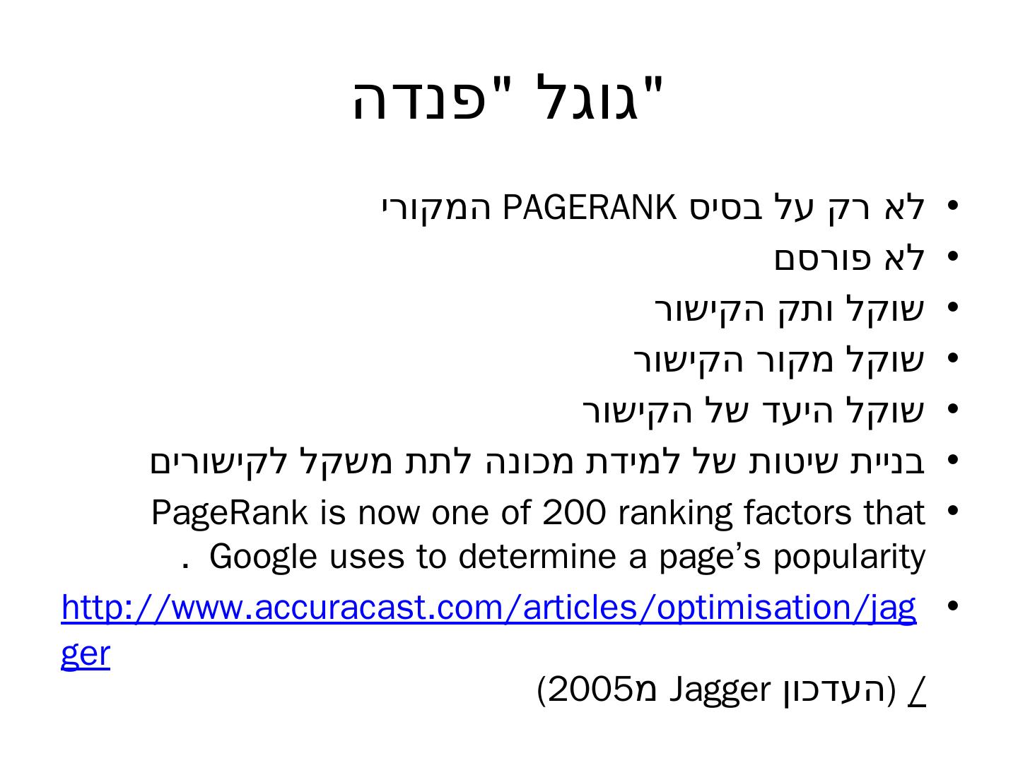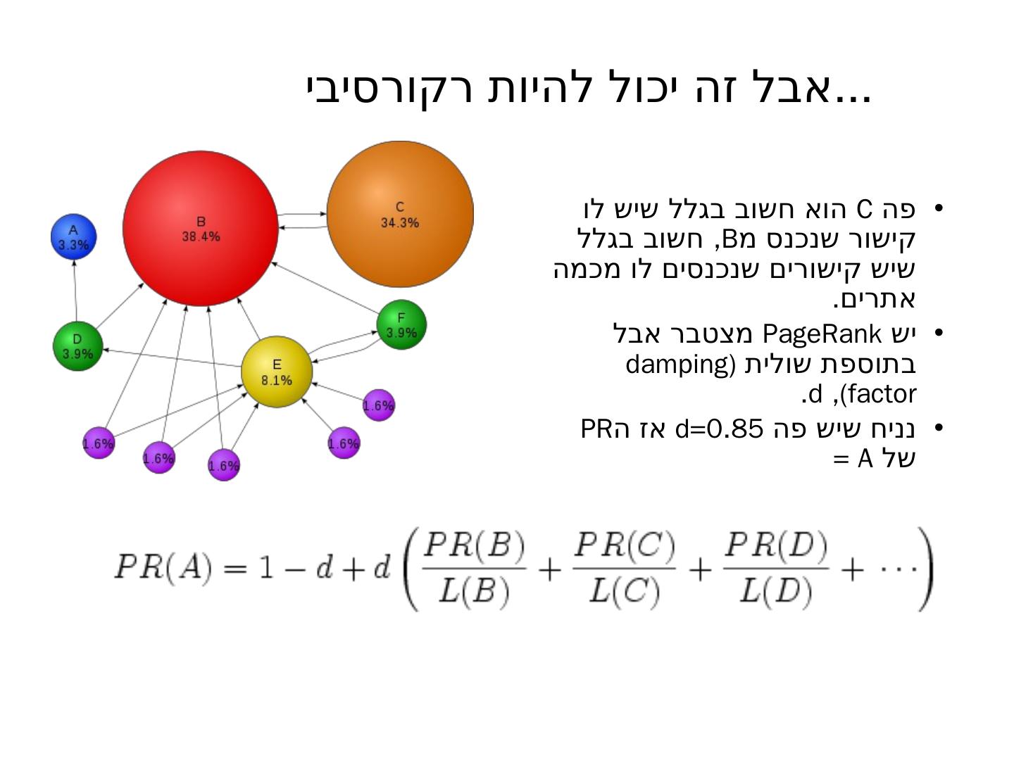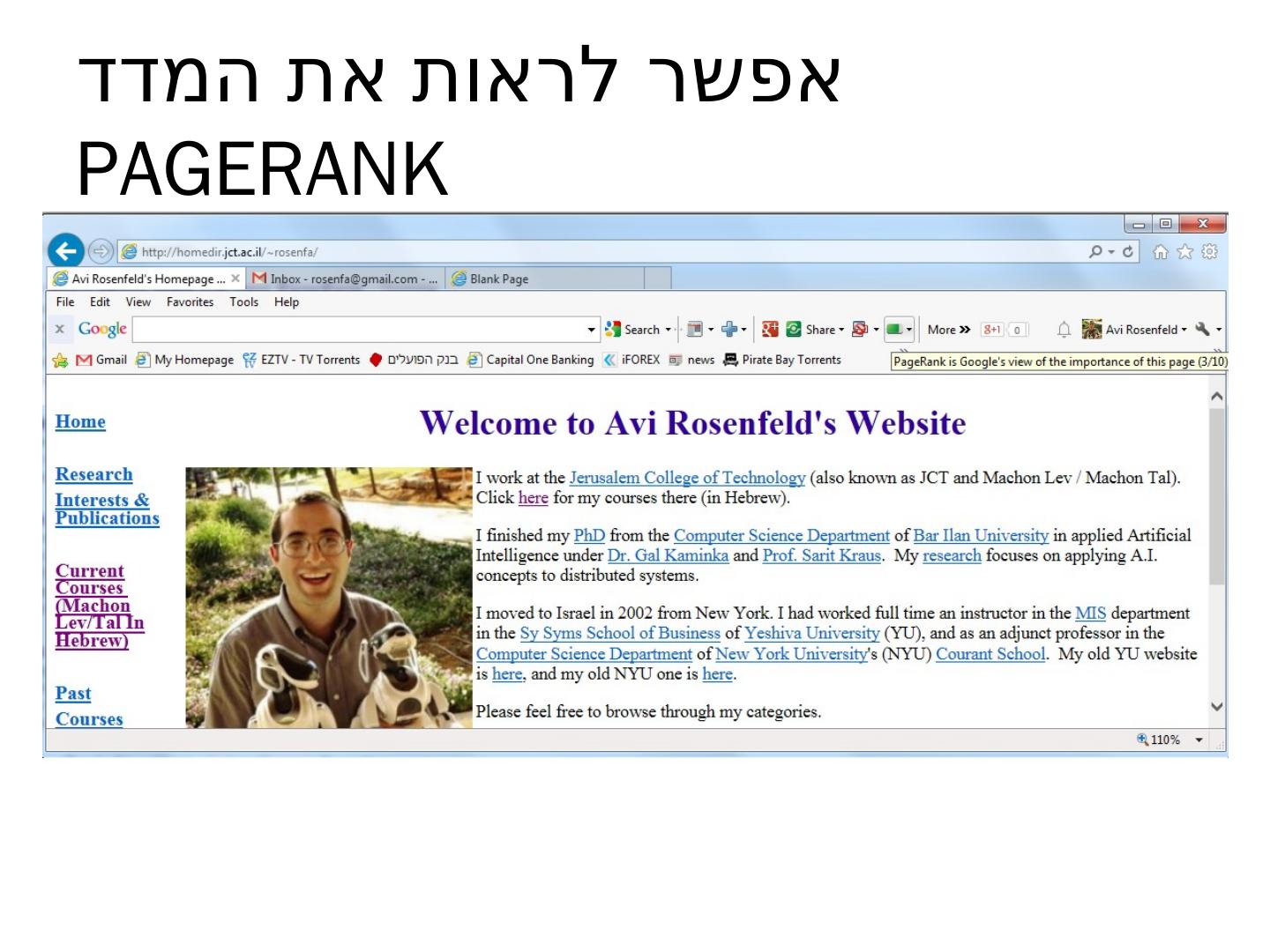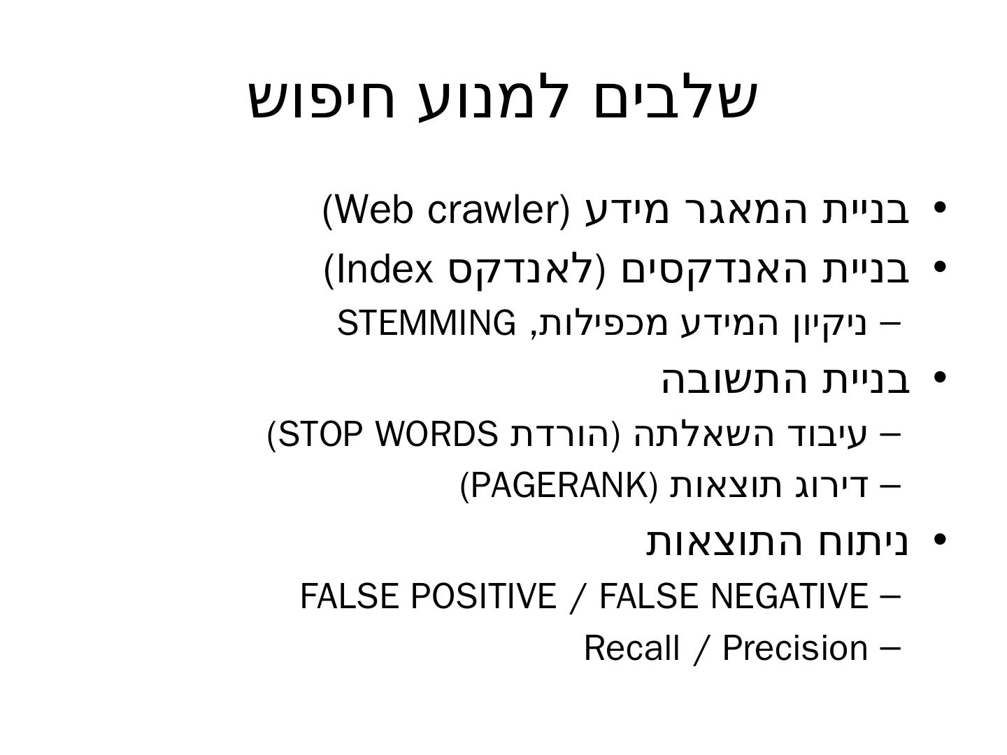 PageRank. ד"ר אבי רוזנפלד. שלבים למנוע חיפוש. בניית המאגר מידע (Web crawler); בניית האנדקסים (לאנדקס Index). ניקיון המידע מכפילות, STEMMING. בניית התשובה.