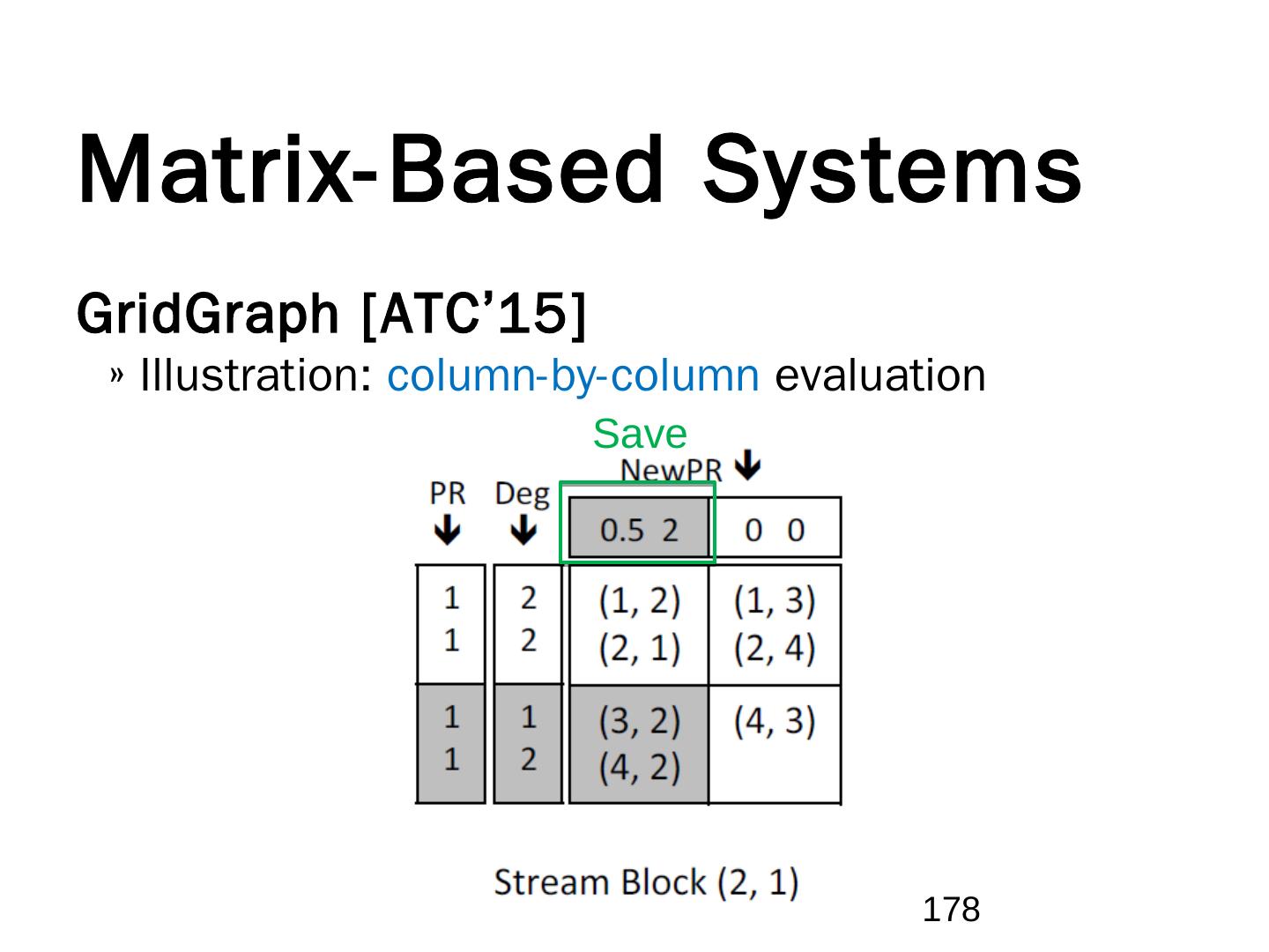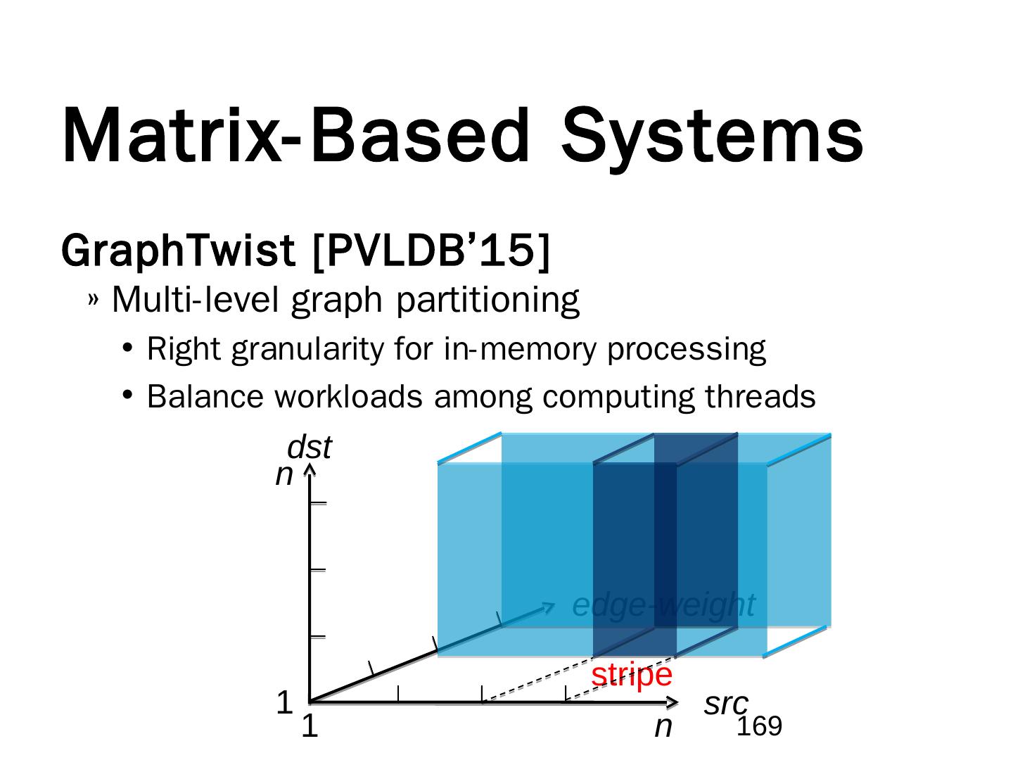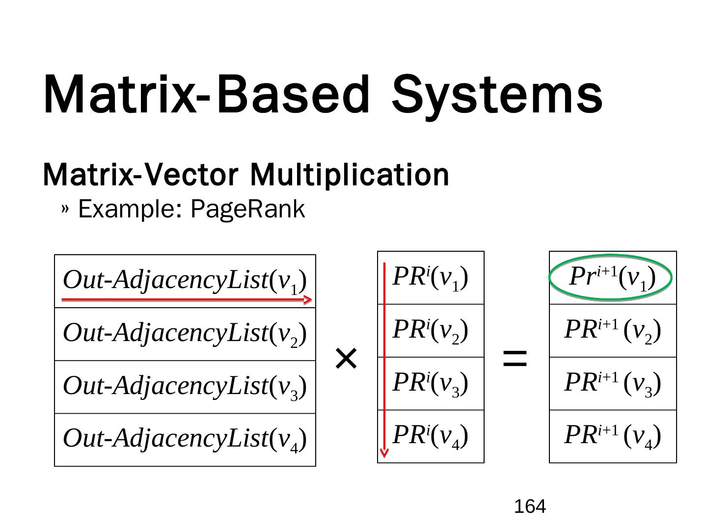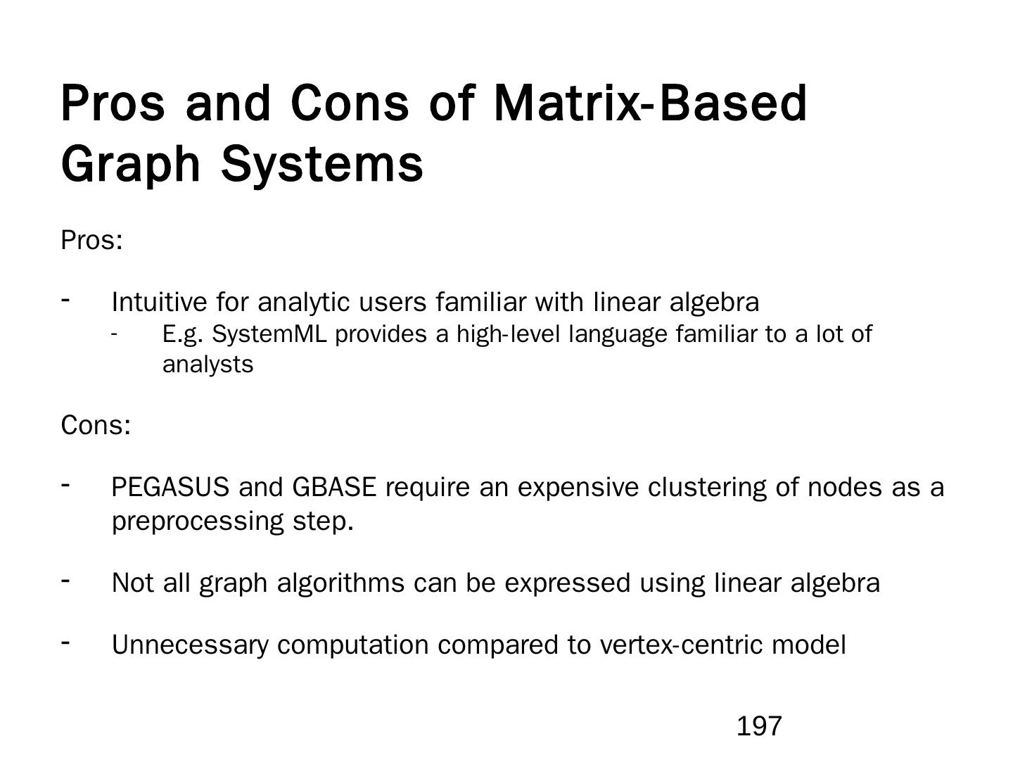 (single/multi-threaded). Pros and Cons of Matrix-Based Graph Systems. Pros: Intuitive for analytic users familiar with linear algebra. E.g. SystemML provides a ...