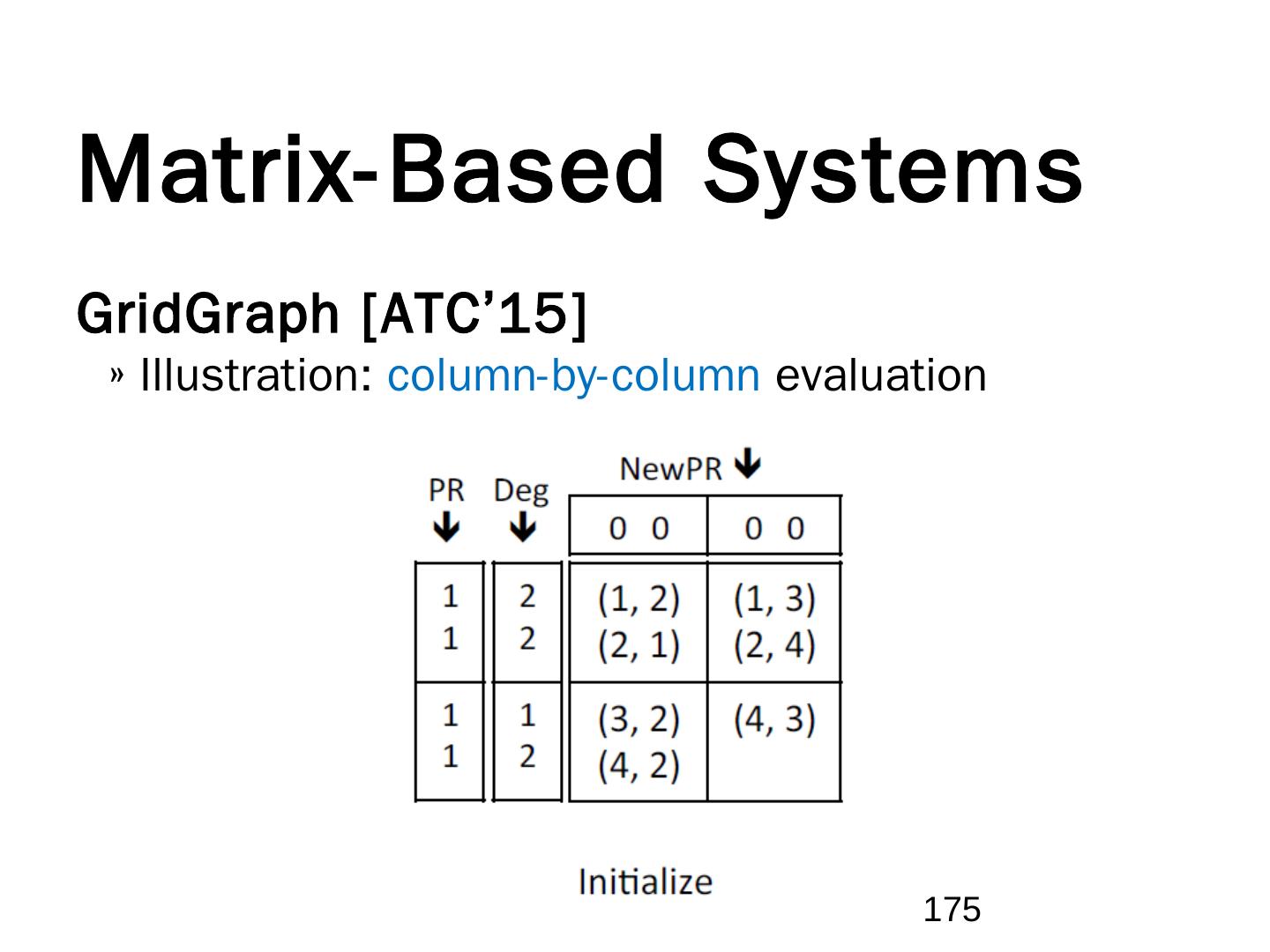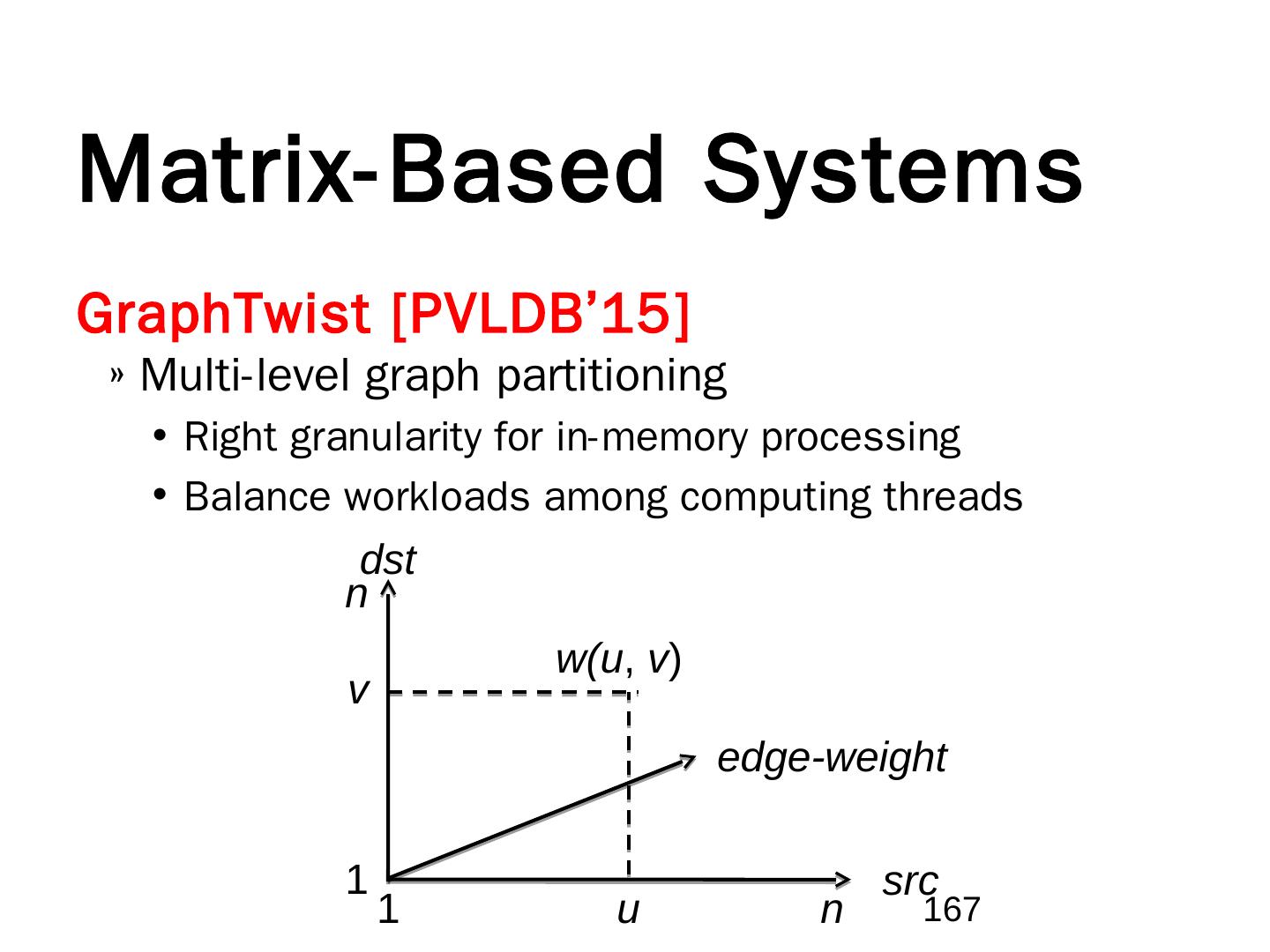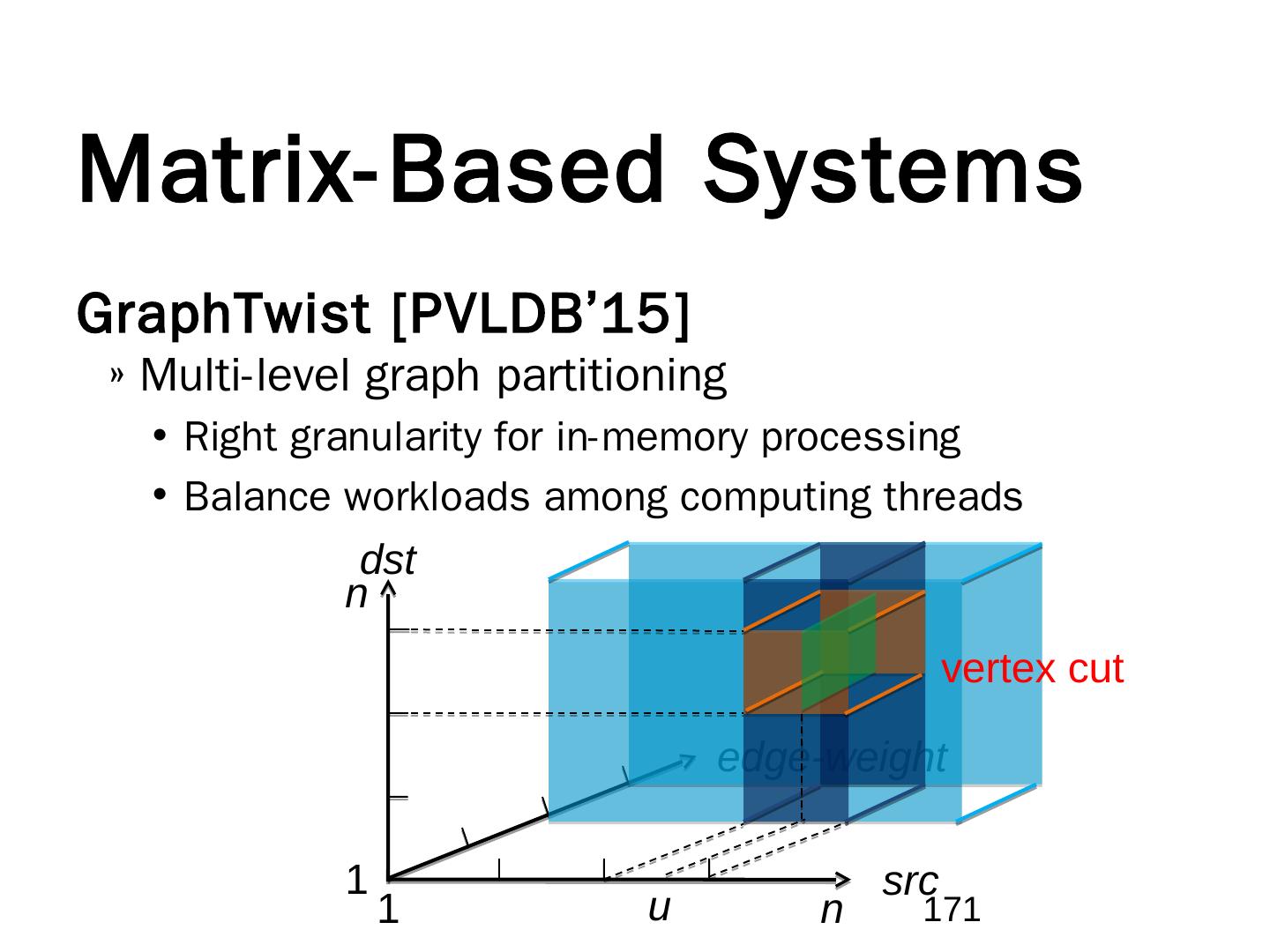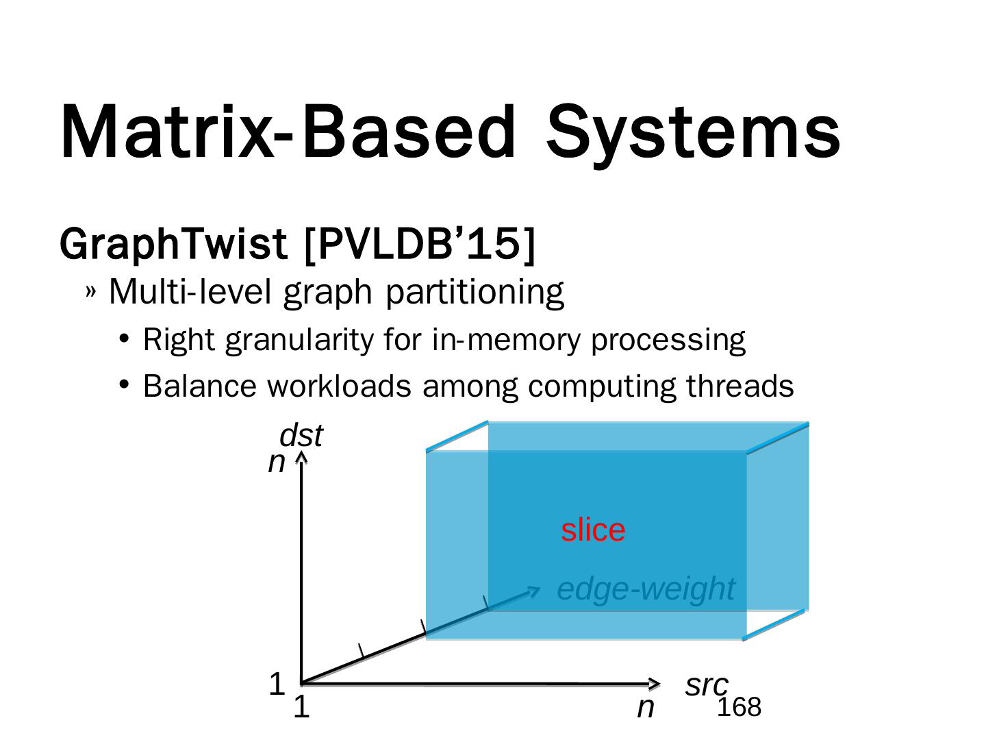 (single/multi-threaded). Pros and Cons of Matrix-Based Graph Systems. Pros: Intuitive for analytic users familiar with linear algebra. E.g. SystemML provides a ...