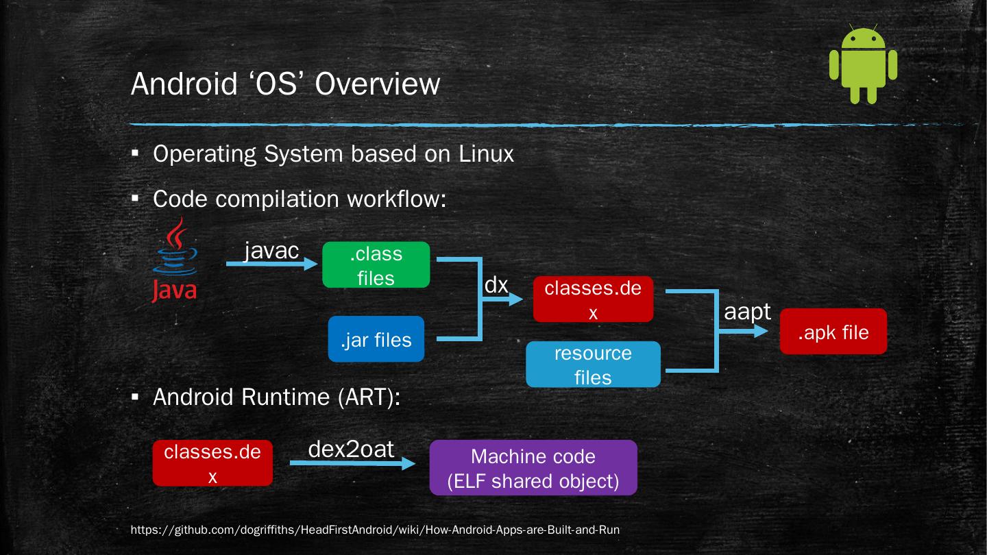 Try Kotlin or both Java & Kotlin. Android 'OS' Overview. Operating System based on Linux; Code compilation workflow: Android Runtime (ART): .class files. javac.
