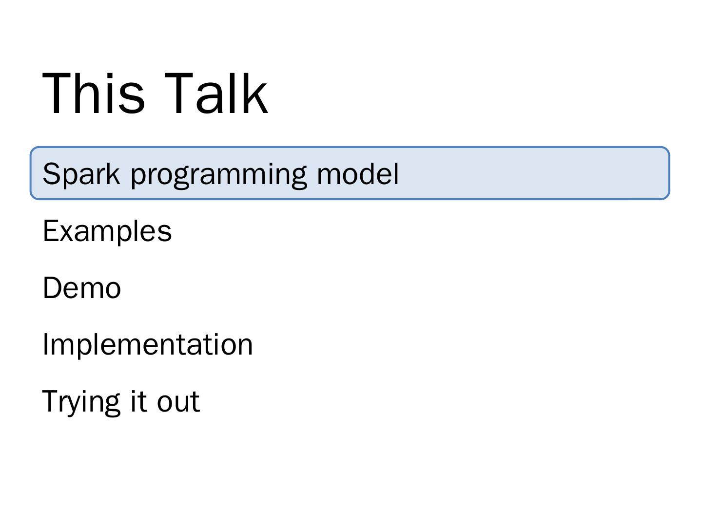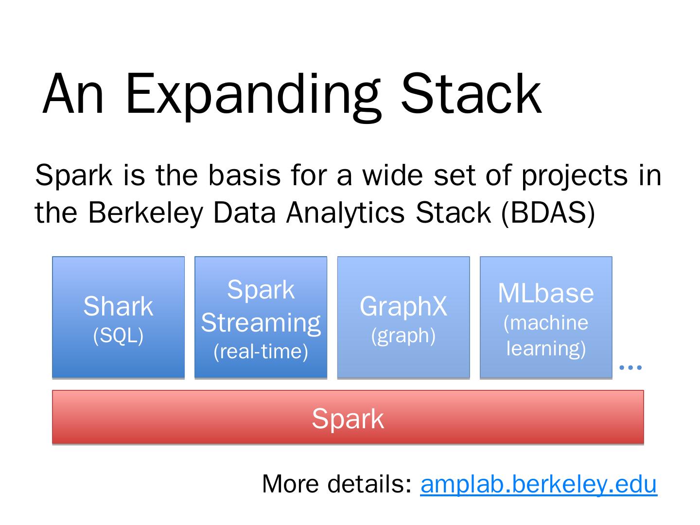 GraphX. (graph) … Shark (SQL). MLbase. (machine learning). More details: amplab.berkeley.edu. This Talk. Spark programming model. Examples. Demo.