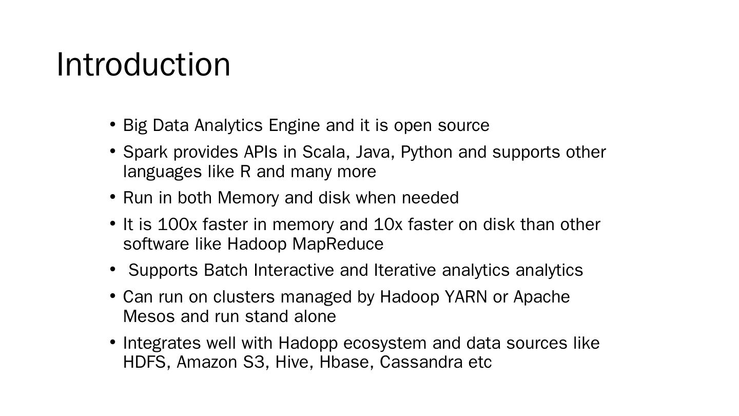 Big Data Analytics Engine and it is open source; Spark provides APIs in Scala, ... is a Spark module for structured data processing; Spark Streaming: It makes it ...