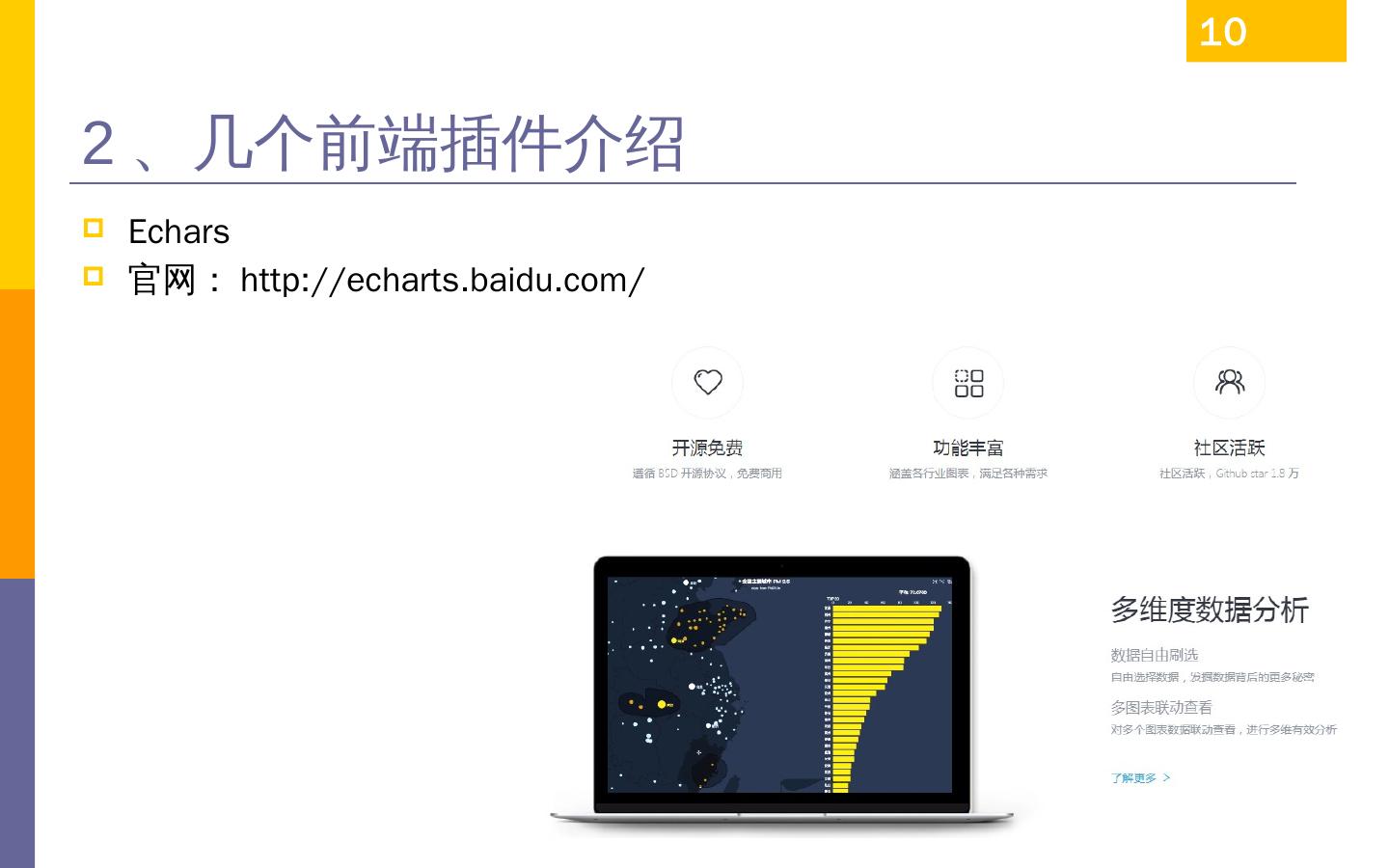 Echars; 官网:http://echarts.baidu.com/. 河南中医学院/ 阮晓龙/ 13938213680 / http://web.book.51xueweb.cn. 2、几个前端插件介绍. 11. D3.js; 官网:https://d3js.org/.