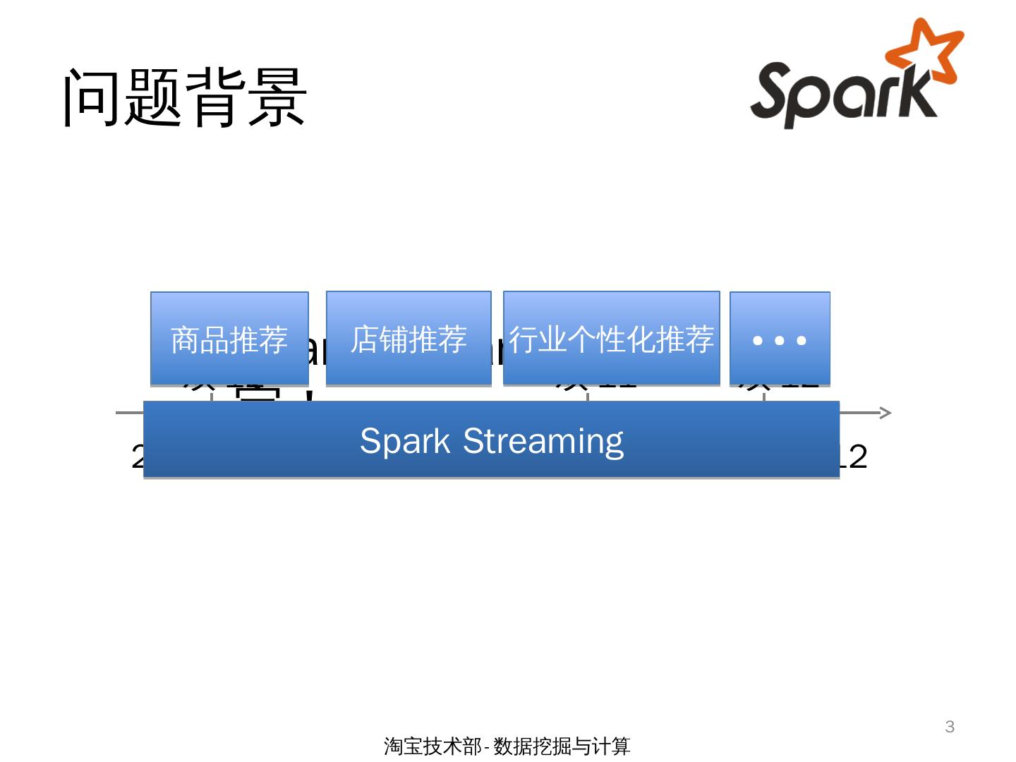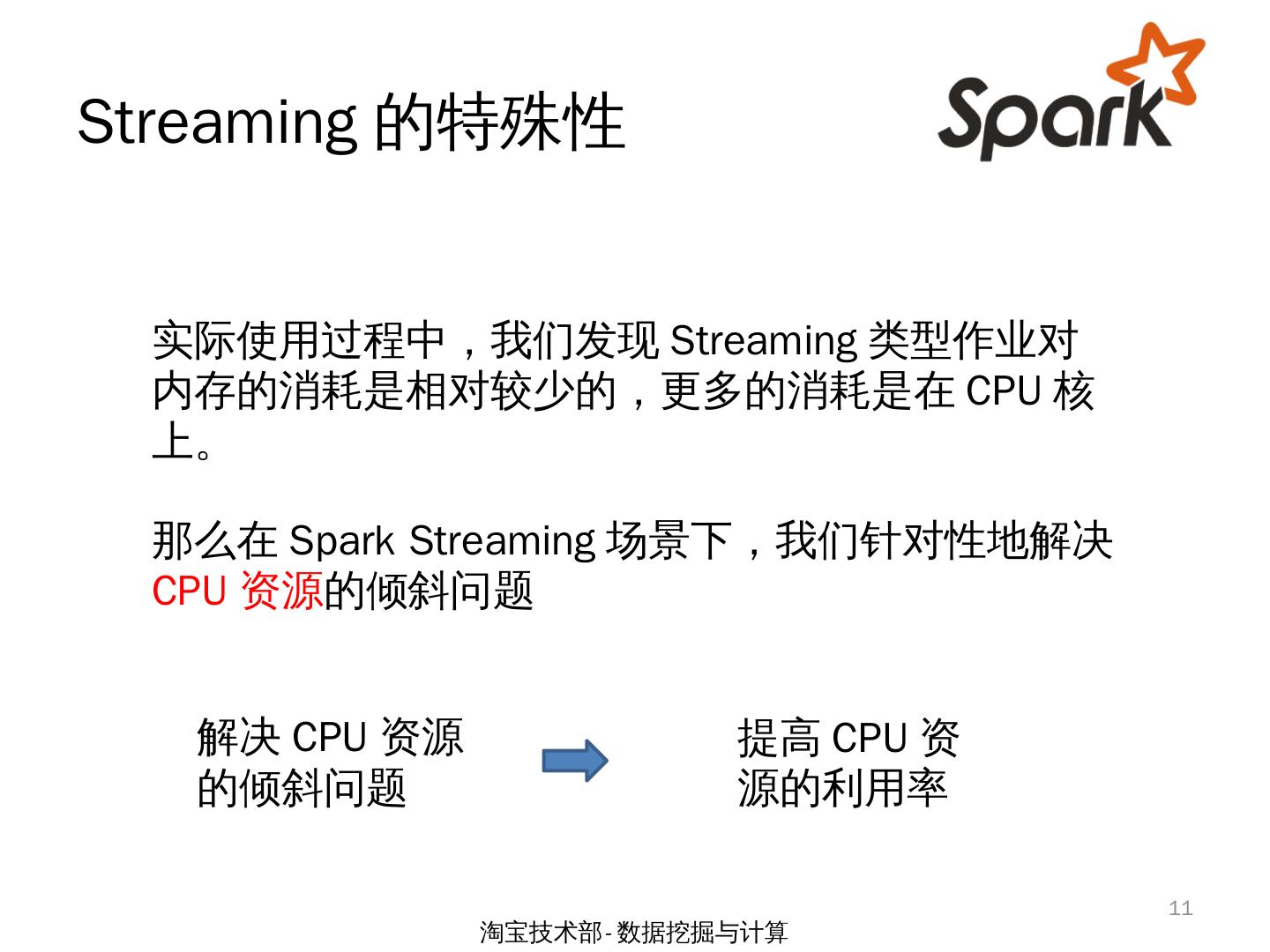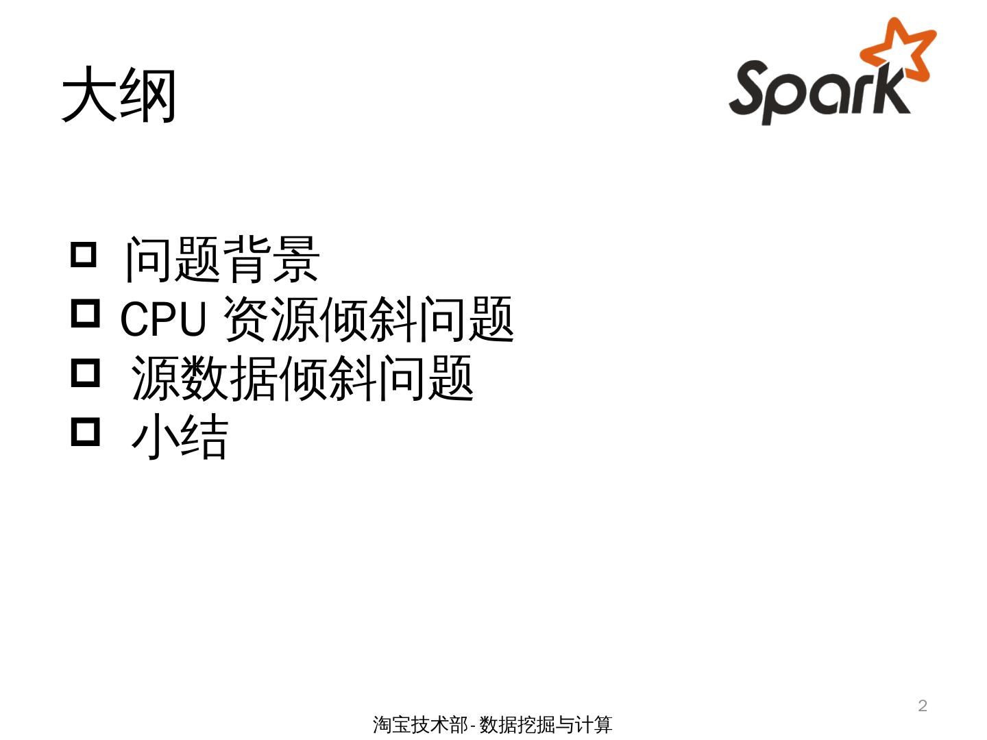 Spark Streaming 场景下两类倾斜问题的研究. by 余根茂. 淘宝技术部-数据挖掘与计算. 1. 大纲. 问题背景; CPU资源倾斜问题; 源数据倾斜问题; 小结. 2. 淘宝技术部- ...