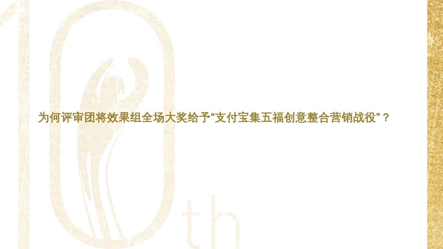 ... 中国可以在全世界引以为傲的类别,如“短视频”、“程序化创意”、“受众规划”、“电商TP”等。 ..... 为何评审团将效果组全场大奖给予“支付宝集五福创意整合营销战役”?