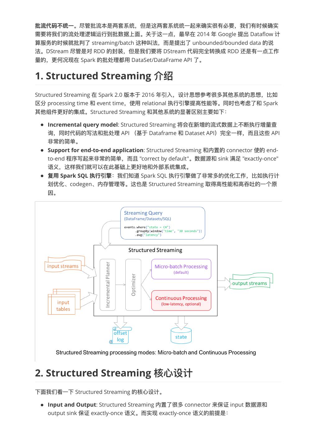 2 . 。尽管批流本是两套系统,但是这两套系统统⼀一起来确实很有必要,我们有时候确实 需要将我们的流处理理逻辑运⾏行行到批数据上⾯面。关于这⼀一点,最早在 2014 年年 Google 提出 Dataflow 计 算服务的时候就批判了了 streaming/batch 这种叫法,⽽而是提出了了 unbounded/bounded data 的说 法。DStream 尽管是对 RDD 的封装,但是我们要将 DStream 代码完全转换成 RDD 还是有⼀一点⼯工作 量量的,更更何况现在 Spark 的批处理理都⽤用 DataSet/DataFrame API 了了。 1. Structured Streaming Structured Streaming 在 Spark 2.0 版本于 2016 年年引⼊入,设计思想参考很多其他系统的思想,⽐比如 区分 processing time 和 event time,使⽤用 relational 执⾏行行引擎提⾼高性能等。同时也考虑了了和 Spark 其他组件更更好的集成。Structured Streaming 和其他系统的显著区别主要如下: Incremental query model: Structured Streaming 将会在新增的流式数据上不不断执⾏行行增量量查 询,同时代码的写法和批处理理 API (基于 Dataframe 和 Dataset API)完全⼀一样,⽽而且这些 API ⾮非常的简单。 Support for end-to-end application: Structured Streaming 和内置的 connector 使的 end- to-end 程序写起来⾮非常的简单,⽽而且 "correct by default"。数据源和 sink 满⾜足 "exactly-once" 语义,这样我们就可以在此基础上更更好地和外部系统集成。 Spark SQL :我们知道 Spark SQL 执⾏行行引擎做了了⾮非常多的优化⼯工作,⽐比如执⾏行行计 划优化、codegen、内存管理理等。这也是 Structured Streaming 取得⾼高性能和⾼高吞吐的⼀一个原 因。 2. Structured Streaming 下⾯面我们看⼀一下 Structured Streaming 的核⼼心设计。 Input and Output: Structured Streaming 内置了了很多 connector 来保证 input 数据源和 output sink 保证 exactly-once 语义。⽽而实现 exactly-once 语义的前提是: