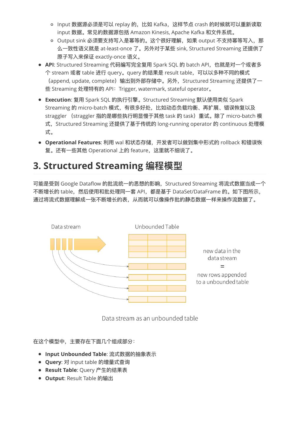 3 . Input 数据源必须是可以 replay 的,⽐比如 Kafka,这样节点 crash 的时候就可以重新读取 input 数据。常⻅见的数据源包括 Amazon Kinesis, Apache Kafka 和⽂文件系统。 Output sink 必须要⽀支持写⼊入是幂等的。这个很好理理解,如果 output 不不⽀支持幂等写⼊入,那 么⼀一致性语义就是 at-least-once 了了。另外对于某些 sink, Structured Streaming 还提供了了 原⼦子写⼊入来保证 exactly-once 语义。 API: Structured Streaming 代码编写完全复⽤用 Spark SQL 的 batch API,也就是对⼀一个或者多 个 stream 或者 table 进⾏行行 query。query 的结果是 result table,可以以多种不不同的模式 (append, update, complete)输出到外部存储中。另外,Structured Streaming 还提供了了⼀一 些 Streaming 处理理特有的 API:Trigger, watermark, stateful operator。 Execution: 复⽤用 Spark SQL 的执⾏行行引擎。Structured Streaming 默认使⽤用类似 Spark Streaming 的 micro-batch 模式,有很多好处,⽐比如动态负载均衡、再扩展、错误恢复以及 straggler (straggler 指的是哪些执⾏行行明显慢于其他 task 的 task)重试。除了了 micro-batch 模 式,Structured Streaming 还提供了了基于传统的 long-running operator 的 continuous 处理理模 式。 Operational Features: 利利⽤用 wal 和状态存储,开发者可以做到集中形式的 rollback 和错误恢 复。还有⼀一些其他 Operational 上的 feature,这⾥里里就不不细说了了。 3. Structured Streaming 可能是受到 Google Dataflow 的批流统⼀一的思想的影响,Structured Streaming 将流式数据当成⼀一个 不不断增⻓长的 table,然后使⽤用和批处理理同⼀一套 API,都是基于 DataSet/DataFrame 的。如下图所示, 通过将流式数据理理解成⼀一张不不断增⻓长的表,从⽽而就可以像操作批的静态数据⼀一样来操作流数据了了。 在这个模型中,主要存在下⾯面⼏几个组成部分: Input Unbounded Table: 流式数据的抽象表示 Query: 对 input table 的增量量式查询 Result Table: Query 产⽣生的结果表 Output: Result Table 的输出