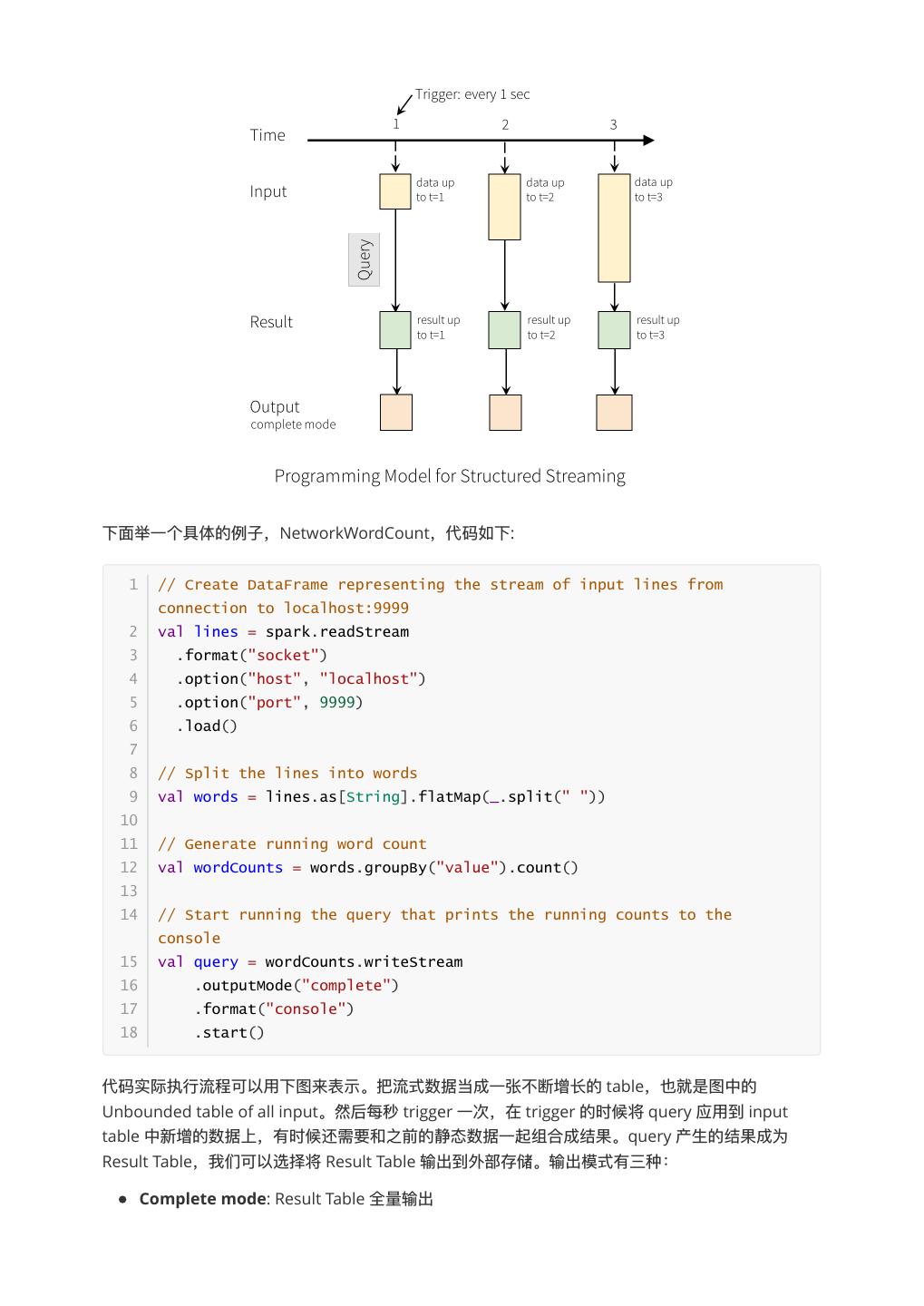 4 .下⾯面举⼀一个具体的例例⼦子,NetworkWordCount,代码如下: 1 // Create DataFrame representing the stream of input lines from connection to localhost:9999 2 val lines = spark.readStream 3 .format("socket") 4 .option("host", "localhost") 5 .option("port", 9999) 6 .load() 7 8 // Split the lines into words 9 val words = lines.as[String].flatMap(_.split(" ")) 10 11 // Generate running word count 12 val wordCounts = words.groupBy("value").count() 13 14 // Start running the query that prints the running counts to the console 15 val query = wordCounts.writeStream 16 .outputMode("complete") 17 .format("console") 18 .start() 代码实际执⾏行行流程可以⽤用下图来表示。把流式数据当成⼀一张不不断增⻓长的 table,也就是图中的 Unbounded table of all input。然后每秒 trigger ⼀一次,在 trigger 的时候将 query 应⽤用到 input table 中新增的数据上,有时候还需要和之前的静态数据⼀一起组合成结果。query 产⽣生的结果成为 Result Table,我们可以选择将 Result Table 输出到外部存储。输出模式有三种: Complete mode: Result Table 全量量输出