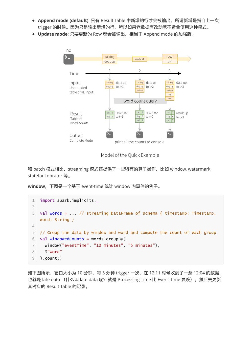 5 . Append mode (default): 只有 Result Table 中新增的⾏行行才会被输出,所谓新增是指⾃自上⼀一次 trigger 的时候。因为只是输出新增的⾏行行,所以如果⽼老老数据有改动就不不适合使⽤用这种模式。 Update mode: 只要更更新的 Row 都会被输出,相当于 Append mode 的加强版。 和 batch 模式相⽐比,streaming 模式还提供了了⼀一些特有的算⼦子操作,⽐比如 window, watermark, statefaul oprator 等。 window,下图是⼀一个基于 event-time 统计 window 内事件的例例⼦子。 1 import spark.implicits._ 2 3 val words = ... // streaming DataFrame of schema { timestamp: Timestamp, word: String } 4 5 // Group the data by window and word and compute the count of each group 6 val windowedCounts = words.groupBy( 7 window("eventTime", "10 minutes", "5 minutes"), 8 $"word" 9 ).count() 如下图所示,窗⼝口⼤大⼩小为 10 分钟,每 5 分钟 trigger ⼀一次。在 12:11 时候收到了了⼀一条 12:04 的数据, 也就是 late data (什什么叫 late data 呢?就是 Processing Time ⽐比 Event Time 要晚),然后去更更新 其对应的 Result Table 的记录。