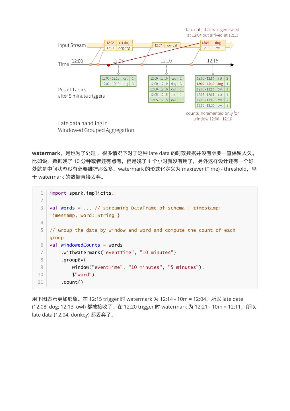 6 .watermark,是也为了了处理理 ,很多情况下对于这种 late data 的时效数据并没有必要⼀一直保留留太久。 ⽐比如说,数据晚了了 10 分钟或者还有点有,但是晚了了 1 个⼩小时就没有⽤用了了,另外这样设计还有⼀一个好 处就是中间状态没有必要维护那么多。watermark 的形式化定义为 max(eventTime) - threshold,早 于 watermark 的数据直接丢弃。 1 import spark.implicits._ 2 3 val words = ... // streaming DataFrame of schema { timestamp: Timestamp, word: String } 4 5 // Group the data by window and word and compute the count of each group 6 val windowedCounts = words 7 .withWatermark("eventTime", "10 minutes") 8 .groupBy( 9 window("eventTime", "10 minutes", "5 minutes"), 10 $"word") 11 .count() ⽤用下图表示更更加形象。在 12:15 trigger 时 watermark 为 12:14 - 10m = 12:04,所以 late date (12:08, dog; 12:13, owl) 都被接收了了。在 12:20 trigger 时 watermark 为 12:21 - 10m = 12:11,所以 late data (12:04, donkey) 都丢弃了了。