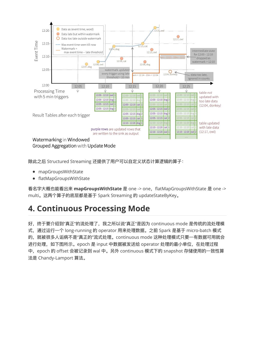 7 .除此之后 Structured Streaming 还提供了了⽤用户可以⾃自定义状态计算逻辑的算⼦子: mapGroupsWithState flatMapGroupsWithState 看名字⼤大概也能看出来 mapGroupsWithState 是 one -> one,flatMapGroupsWithState 是 one -> multi。这两个算⼦子的底层都是基于 Spark Streaming 的 updateStateByKey。 4. Continuous Processing Mode 好,终于要介绍到“真正”的流处理理了了,我之所以说“真正”是因为 continuous mode 是传统的流处理理模 式,通过运⾏行行⼀一个 long-running 的 operator ⽤用来处理理数据。之前 Spark 是基于 micro-batch 模式 的,就被很多⼈人诟病不不是“真正的”流式处理理。continuous mode 这种处理理模式只要⼀一有数据可⽤用就会 进⾏行行处理理,如下图所示。epoch 是 input 中数据被发送给 operator 处理理的最⼩小单位,在处理理过程 中,epoch 的 offset 会被记录到 wal 中。另外 continuous 模式下的 snapshot 存储使⽤用的⼀一致性算 法是 Chandy-Lamport 算法。