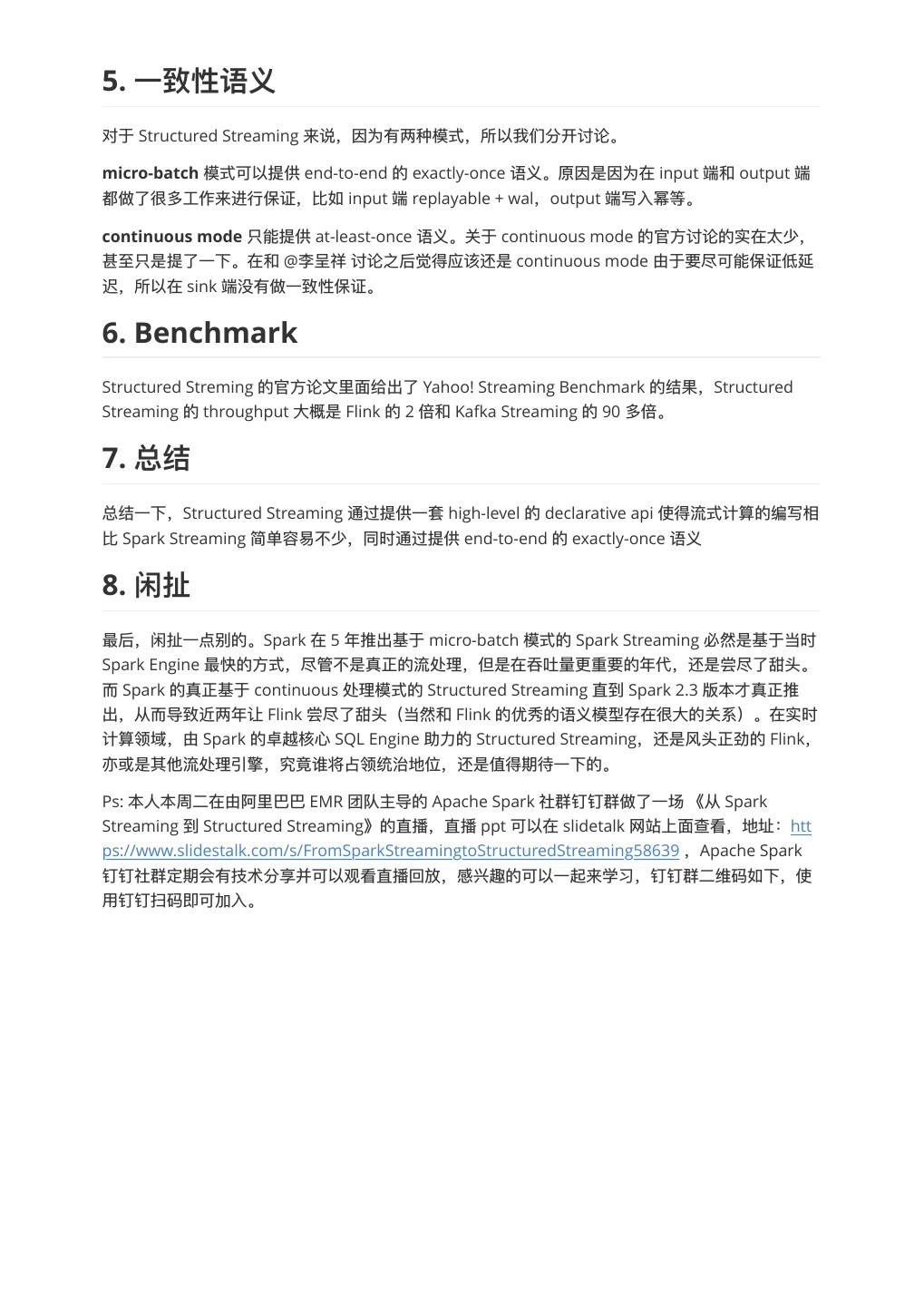 9 .5. ⼀一 对于 Structured Streaming 来说,因为有两种模式,所以我们分开讨论。 micro-batch 模式可以提供 end-to-end 的 exactly-once 语义。原因是因为在 input 端和 output 端 都做了了很多⼯工作来进⾏行行保证,⽐比如 input 端 replayable + wal,output 端写⼊入幂等。 continuous mode 只能提供 at-least-once 语义。关于 continuous mode 的官⽅方讨论的实在太少, 甚⾄至只是提了了⼀一下。在和 @李李呈祥 讨论之后觉得应该还是 continuous mode 由于要尽可能保证低延 迟,所以在 sink 端没有做⼀一致性保证。 6. Benchmark Structured Streming 的官⽅方论⽂文⾥里里⾯面给出了了 Yahoo! Streaming Benchmark 的结果,Structured Streaming 的 throughput ⼤大概是 Flink 的 2 倍和 Kafka Streaming 的 90 多倍。 7. 总结⼀一下,Structured Streaming 通过提供⼀一套 high-level 的 declarative api 使得流式计算的编写相 ⽐比 Spark Streaming 简单容易易不不少,同时通过提供 end-to-end 的 exactly-once 语义 8. 最后,闲扯⼀一点别的。Spark 在 5 年年推出基于 micro-batch 模式的 Spark Streaming 必然是基于当时 Spark Engine 最快的⽅方式,尽管不不是真正的流处理理,但是在吞吐量量更更重要的年年代,还是尝尽了了甜头。 ⽽而 Spark 的真正基于 continuous 处理理模式的 Structured Streaming 直到 Spark 2.3 版本才真正推 出,从⽽而导致近两年年让 Flink 尝尽了了甜头(当然和 Flink 的优秀的语义模型存在很⼤大的关系)。在实时 计算领域,由 Spark 的卓越核⼼心 SQL Engine 助⼒力力的 Structured Streaming,还是⻛风头正劲的 Flink, 亦或是其他流处理理引擎,究竟谁将占领统治地位,还是值得期待⼀一下的。 Ps: 本⼈人本周⼆二在由阿⾥里里巴巴 EMR 团队主导的 Apache Spark 社群钉钉群做了了⼀一场 《从 Spark Streaming 到 Structured Streaming》的直播,直播 ppt 可以在 slidetalk ⽹网站上⾯面查看,地址:htt ps://www.slidestalk.com/s/FromSparkStreamingtoStructuredStreaming58639 ,Apache Spark 钉钉社群定期会有技术分享并可以观看直播回放,感兴趣的可以⼀一起来学习,钉钉群⼆二维码如下,使 ⽤用钉钉扫码即可加⼊入。