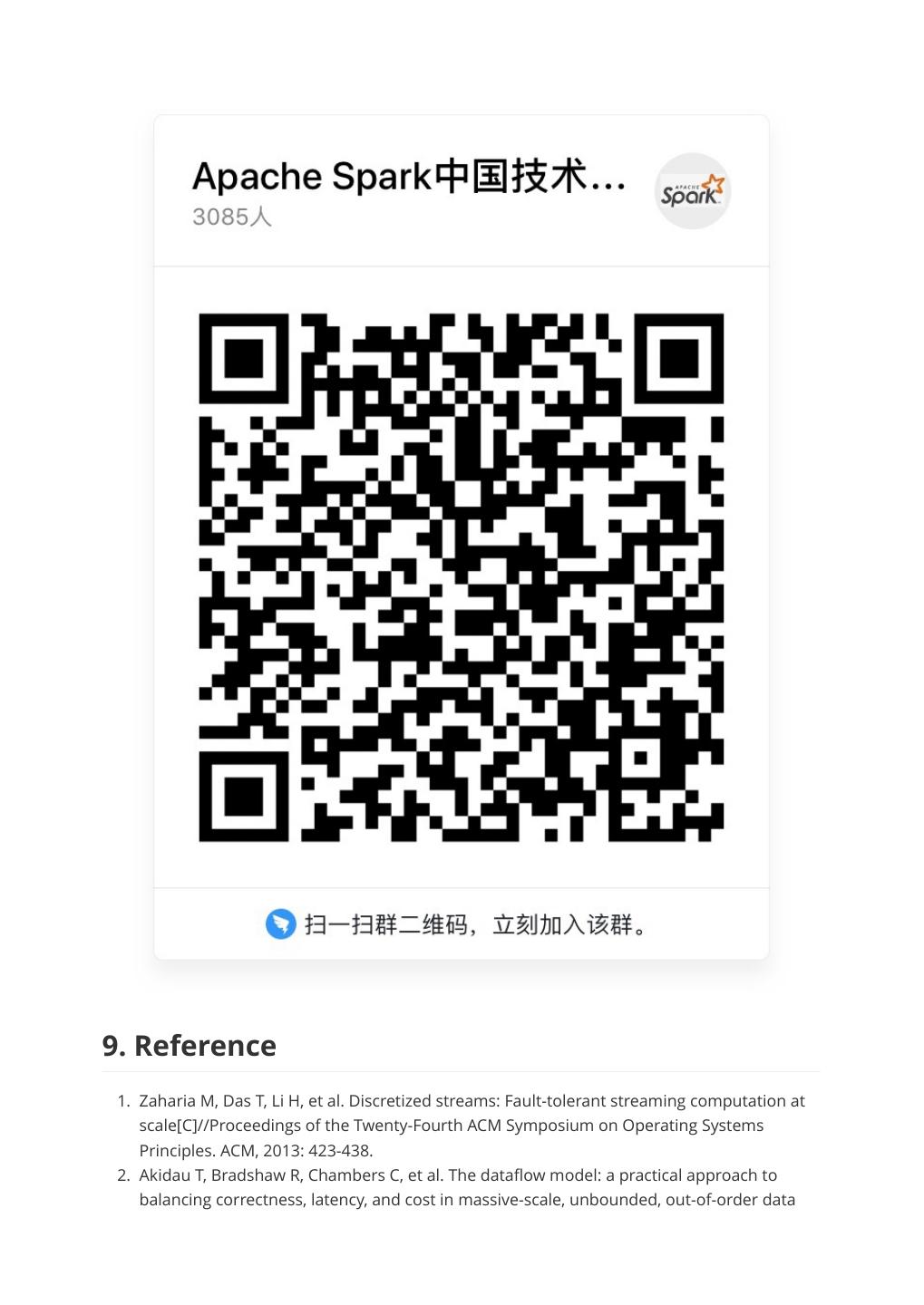 10 .9. Reference 1. Zaharia M, Das T, Li H, et al. Discretized streams: Fault-tolerant streaming computation at scale[C]//Proceedings of the Twenty-Fourth ACM Symposium on Operating Systems Principles. ACM, 2013: 423-438. 2. Akidau T, Bradshaw R, Chambers C, et al. The dataflow model: a practical approach to balancing correctness, latency, and cost in massive-scale, unbounded, out-of-order data