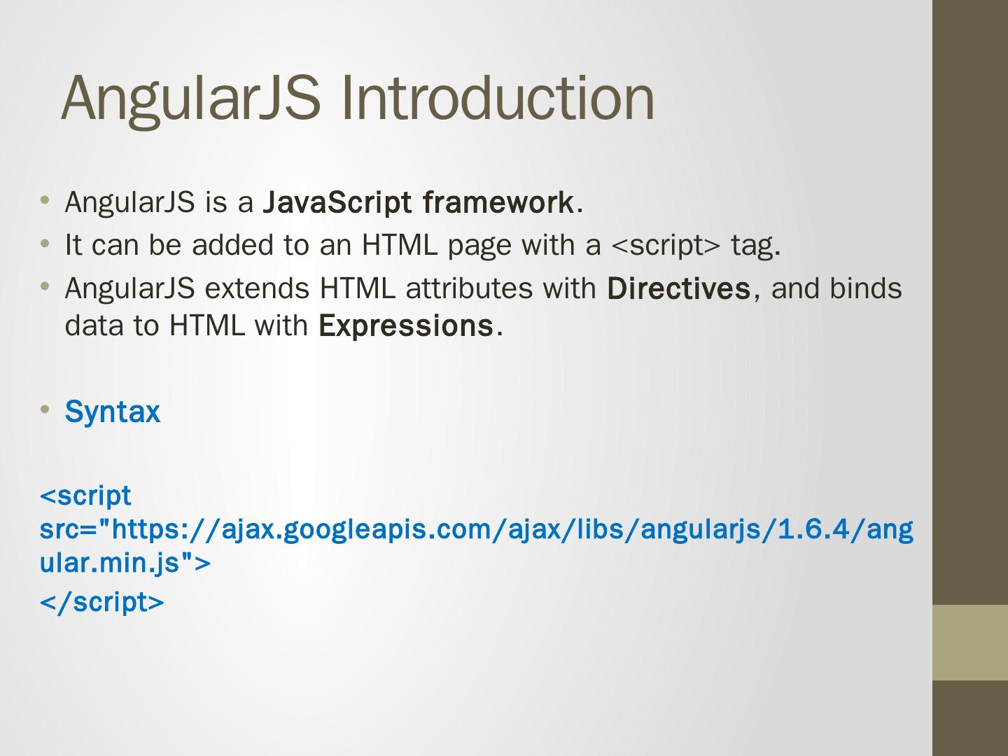 AngularJS is a JavaScript framework. It can be added to an HTML page with a