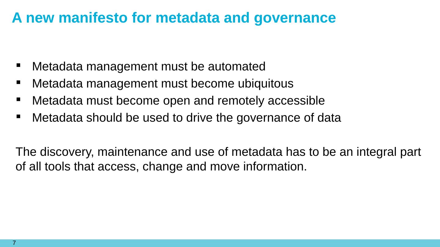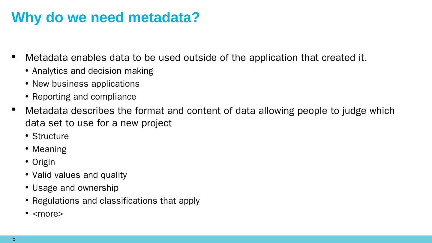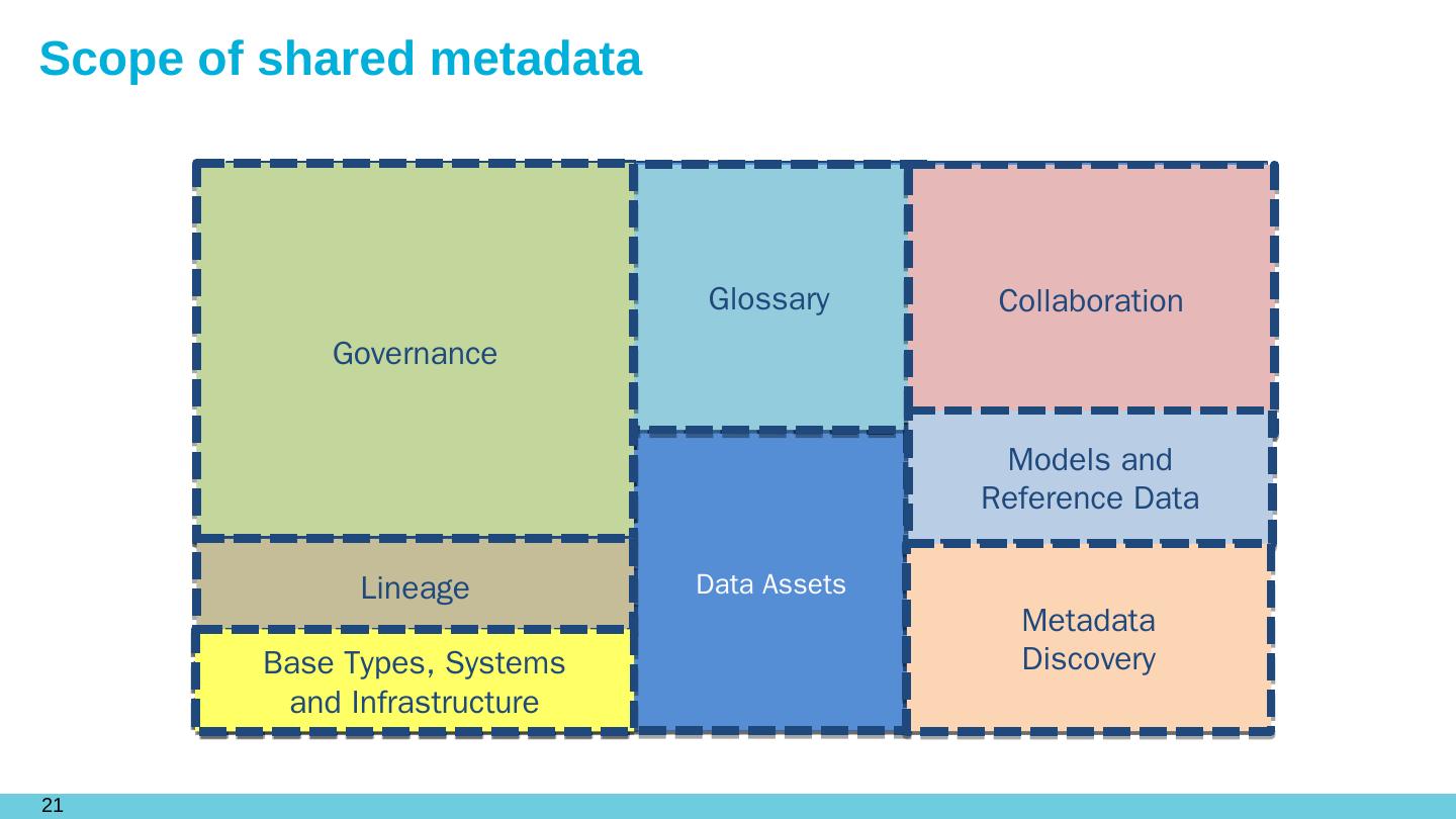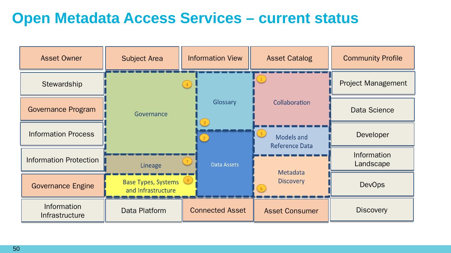 元数据描述了数据的格式,内容,权限,这对于数据的分析和决策,新的应用接入数据具有非常大的意义,它用格式化的语言描述了数据的结构,意义,存访位置,价值,质量,如何使用,谁在维护,保密等级等等。在大型企业和复杂产品中,数据往往以不同的形式,格式分散在不同服务器上,统一的元数据管理和数据治理极大提高企业和产品对于数据的使用效率。Open MetaData解决了数据治理,术语表,协作,数据资产,数据的血统关系,数据基础架构和元数据发现等多个议题。Open MetaData不仅仅提供了方法学,更多也提供了基础架构的实现,需要更多的数据产生方按照它的协议标准API,并定义了若干使用模式,来汇报数据相关信息。