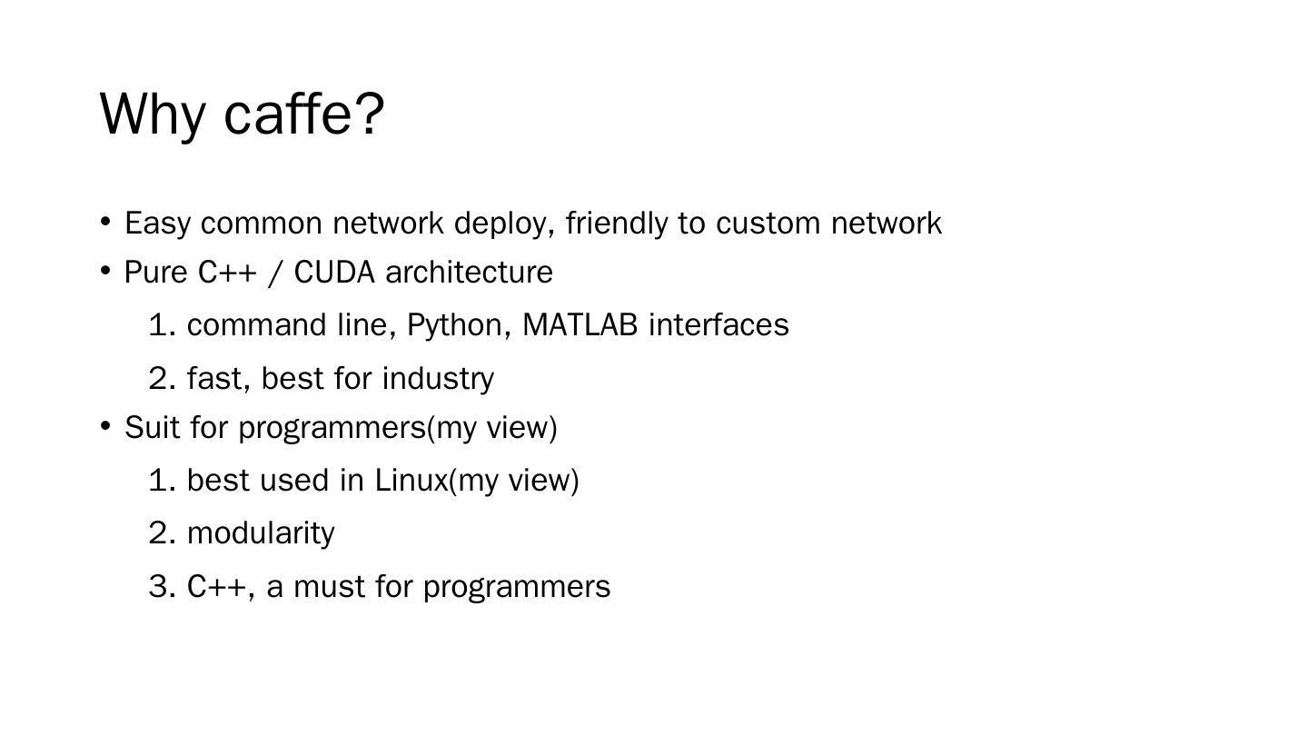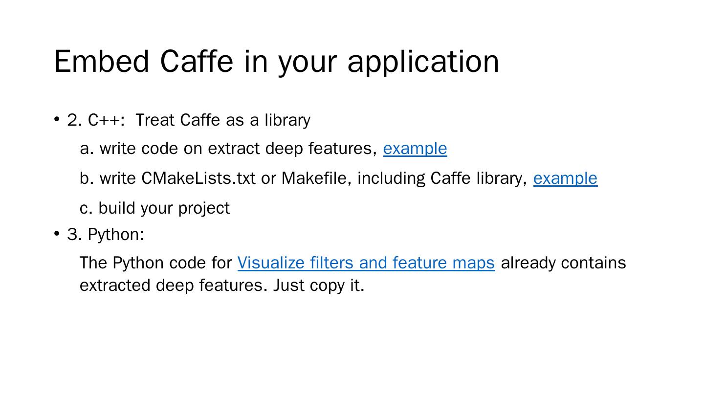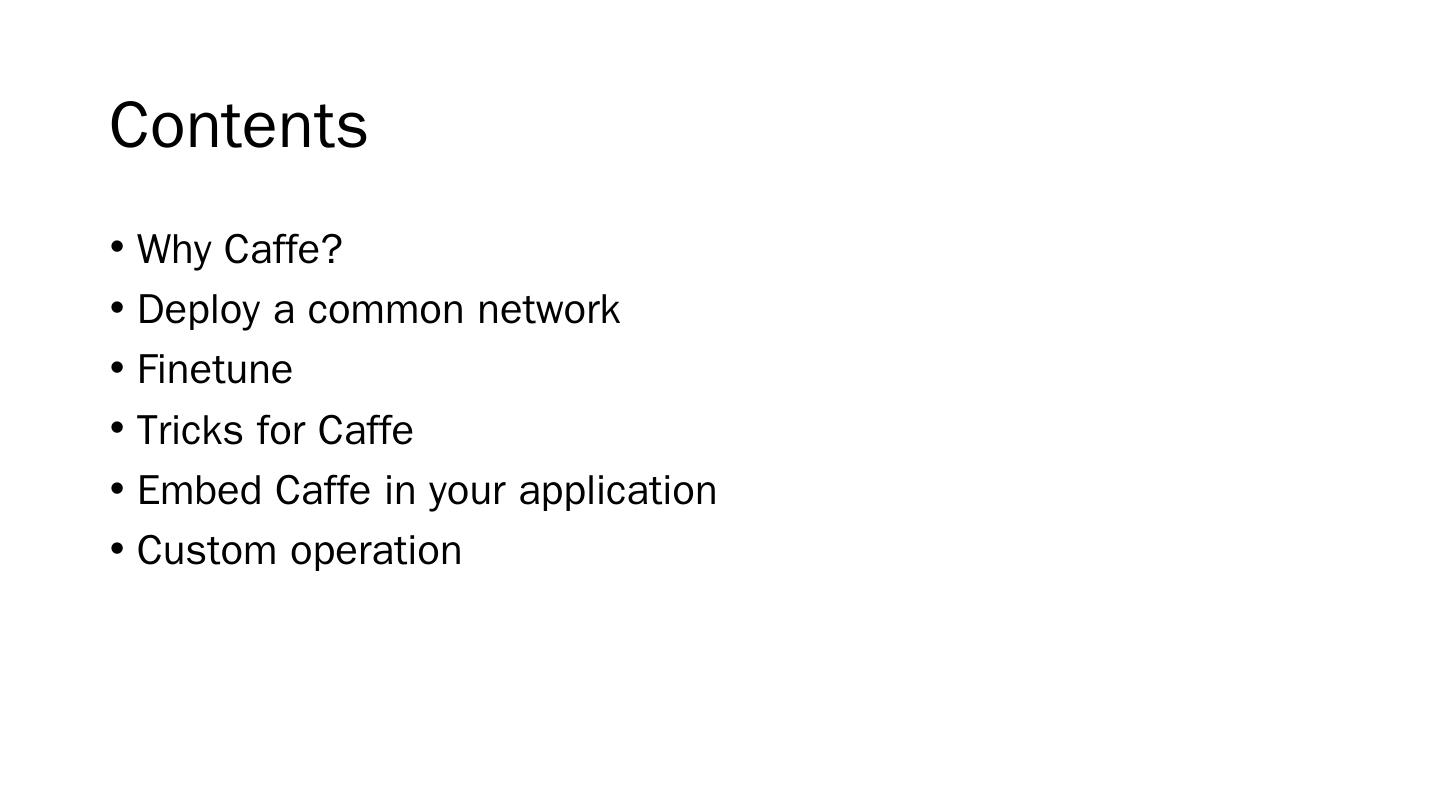 CAFFE. Brewing Deep Networks With Caffe. Contents. Why Caffe? Deploy a common network; Finetune; Tricks for Caffe; Embed Caffe in your application ...