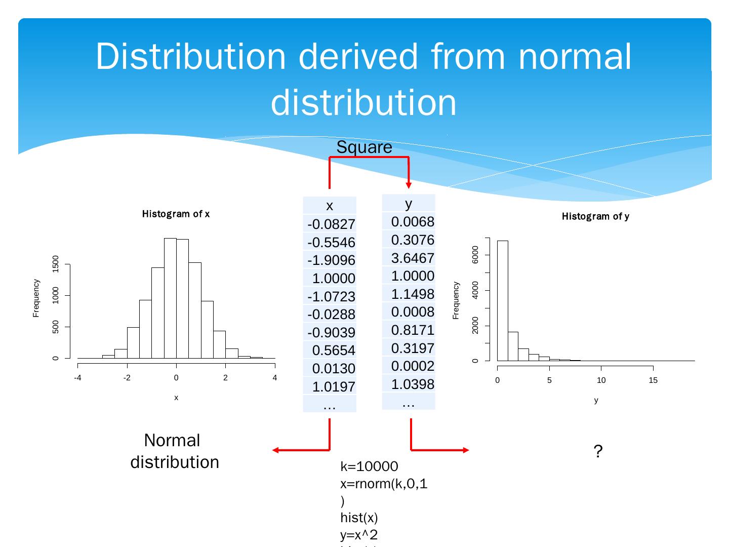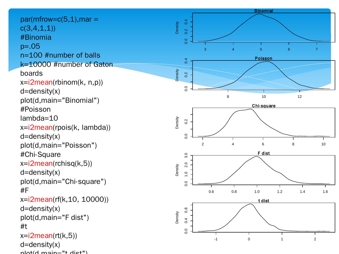 x=rnorm(k, mean=mean,sd=sqrt(var)). hist(x). Binomial vs. Normal. x=rbinom(k, n,p). d=density(x). plot(d). mean=n*p. var=n*p*(1-p). x=rnorm(k, mean=mean ...