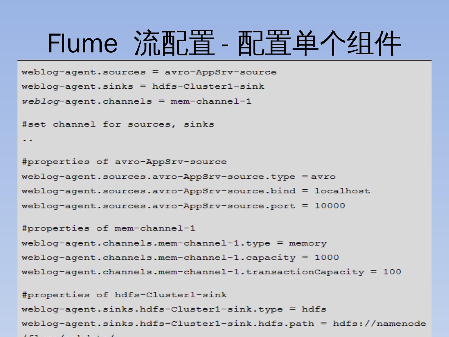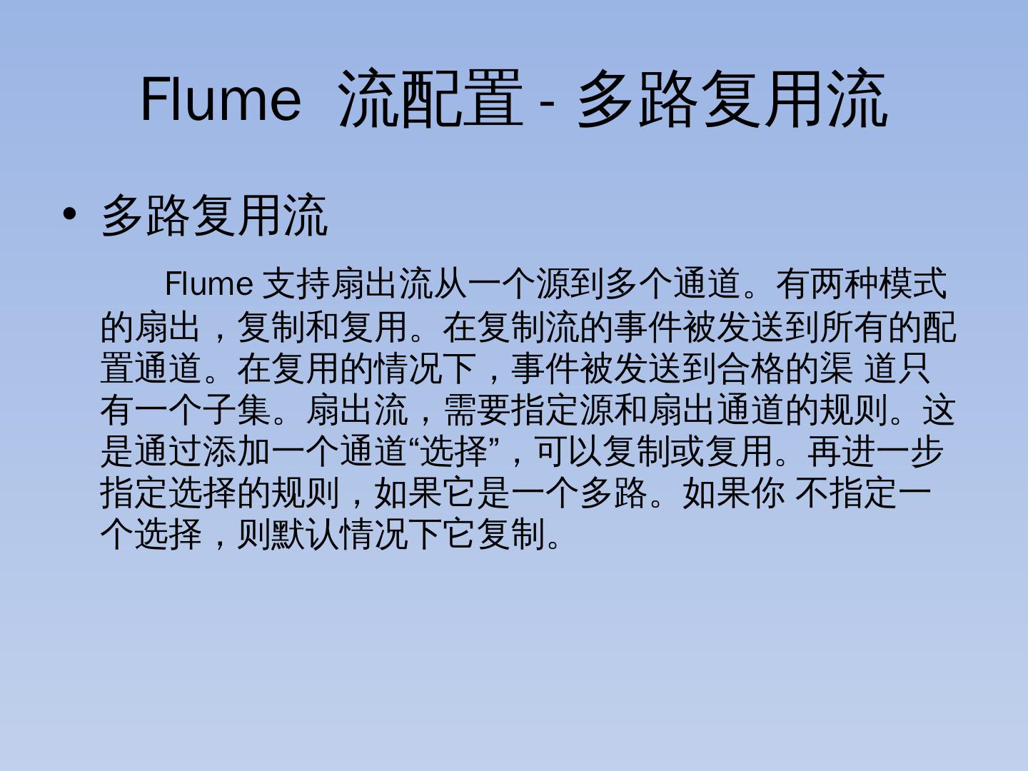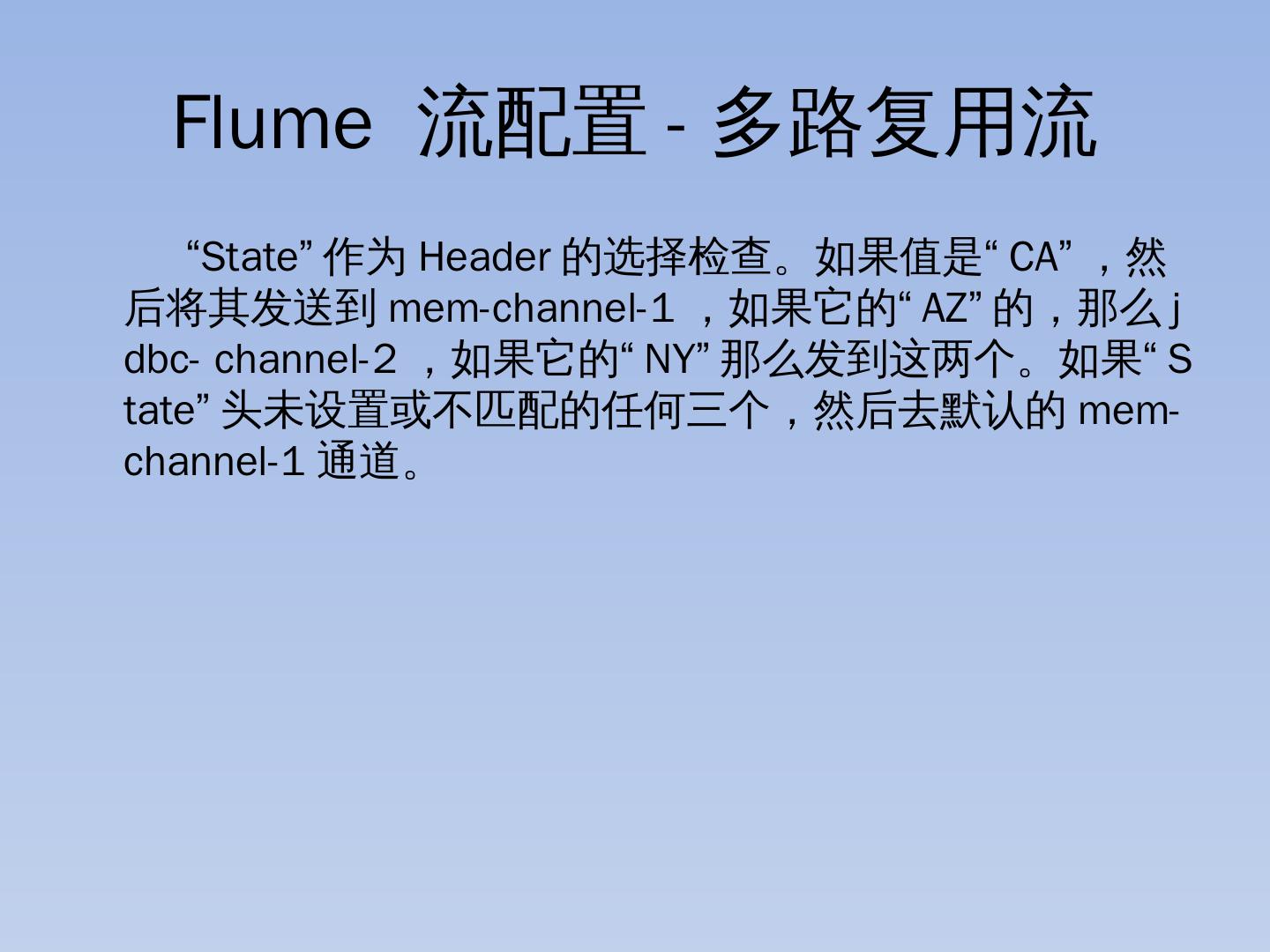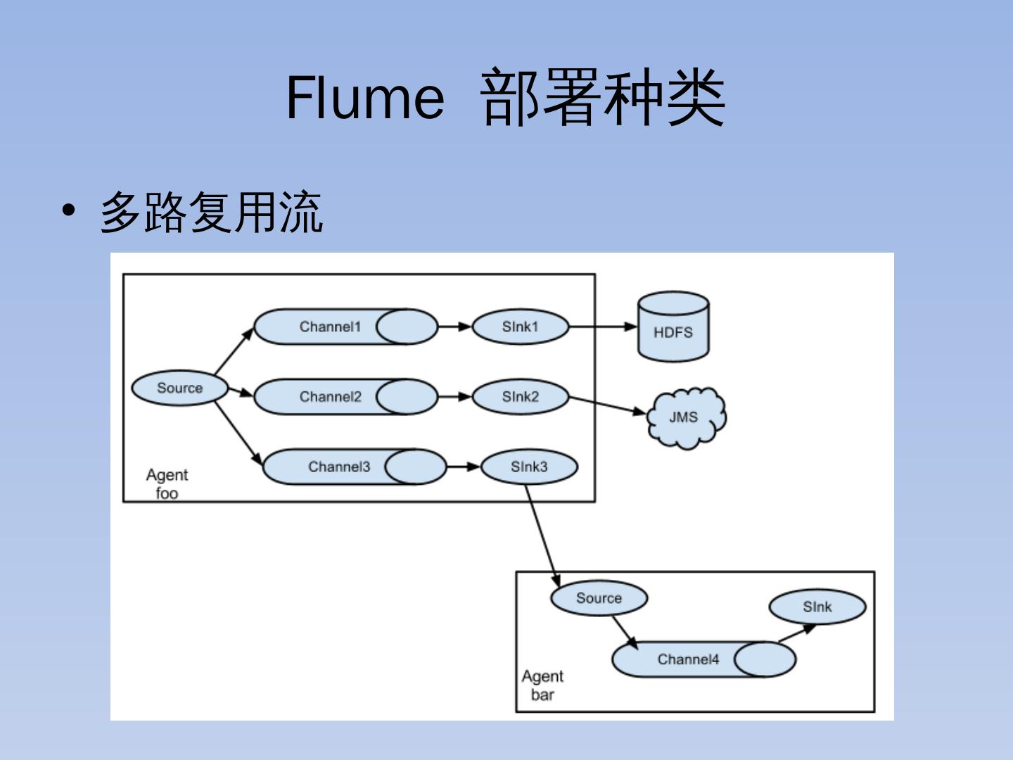Flume支持扇出流从一个源到多个通道。有两种模式的扇出,复制和复用。在复制流的事件被发送到所有的配置通道。在复用的情况下,事件被发送到合格的渠道只有 ...