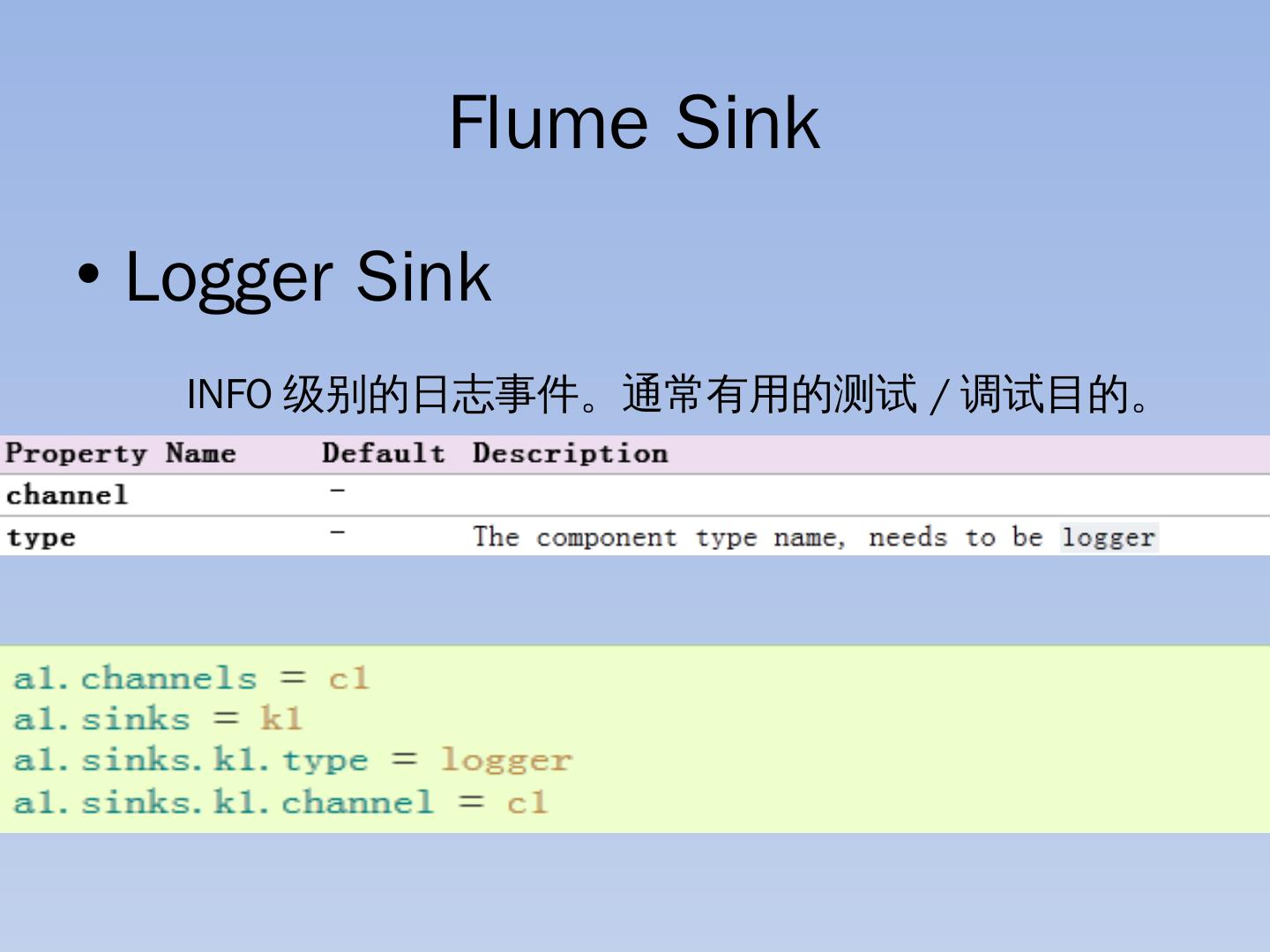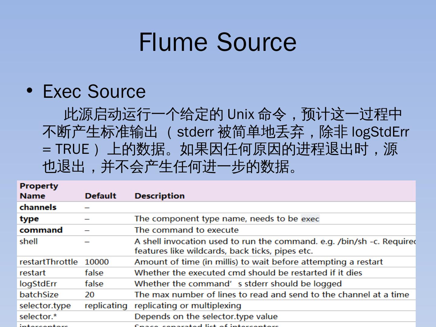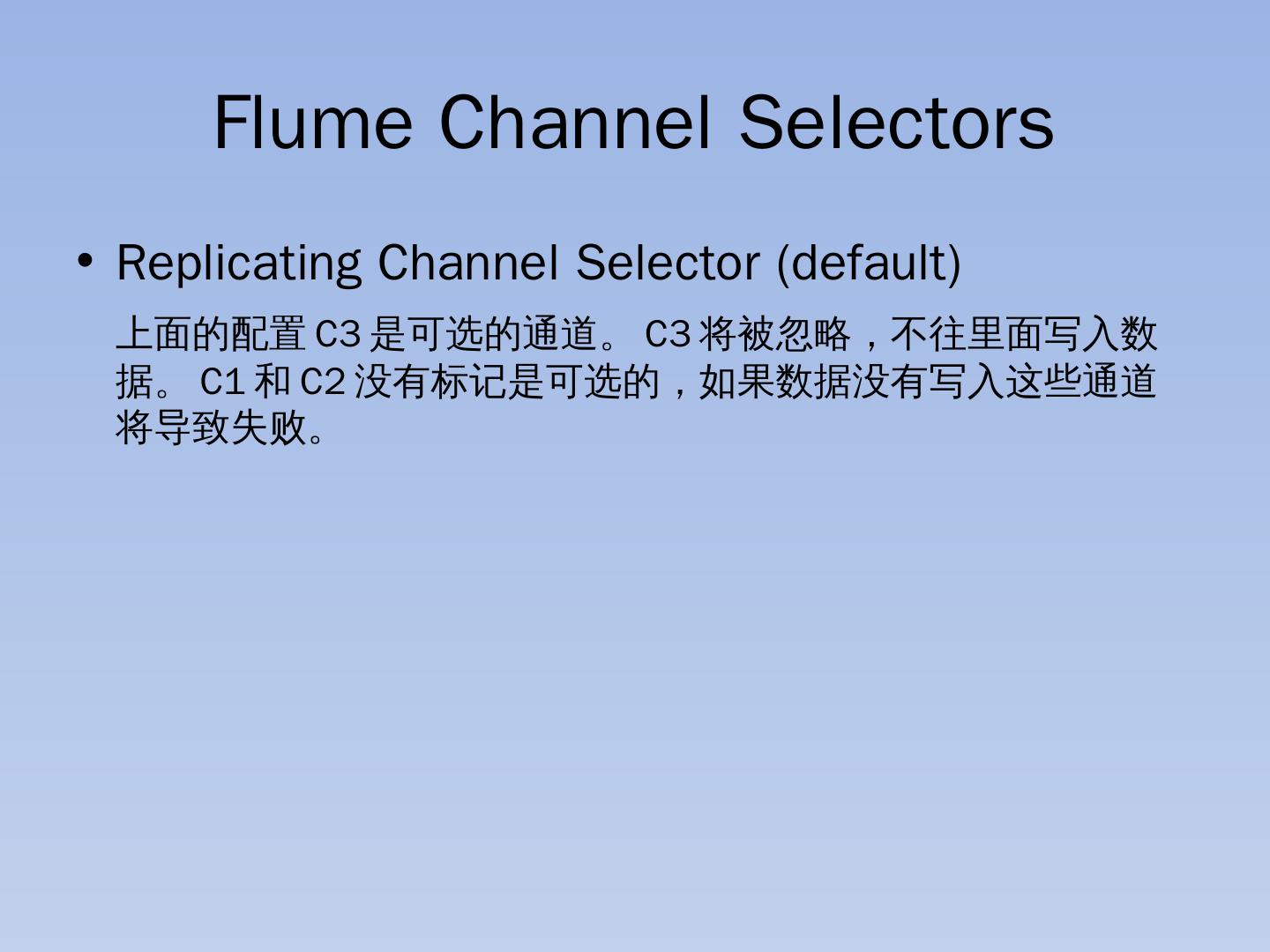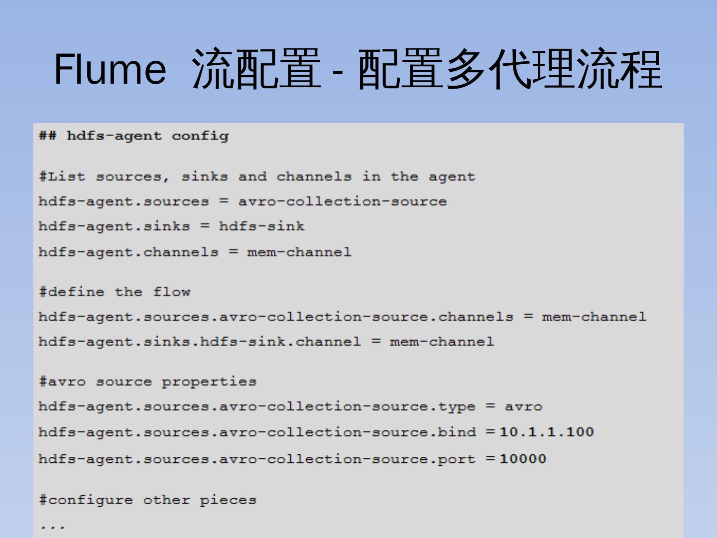 Flume支持扇出流从一个源到多个通道。有两种模式的扇出,复制和复用。在复制流的事件被发送到所有的配置通道。在复用的情况下,事件被发送到合格的渠道只有 ...