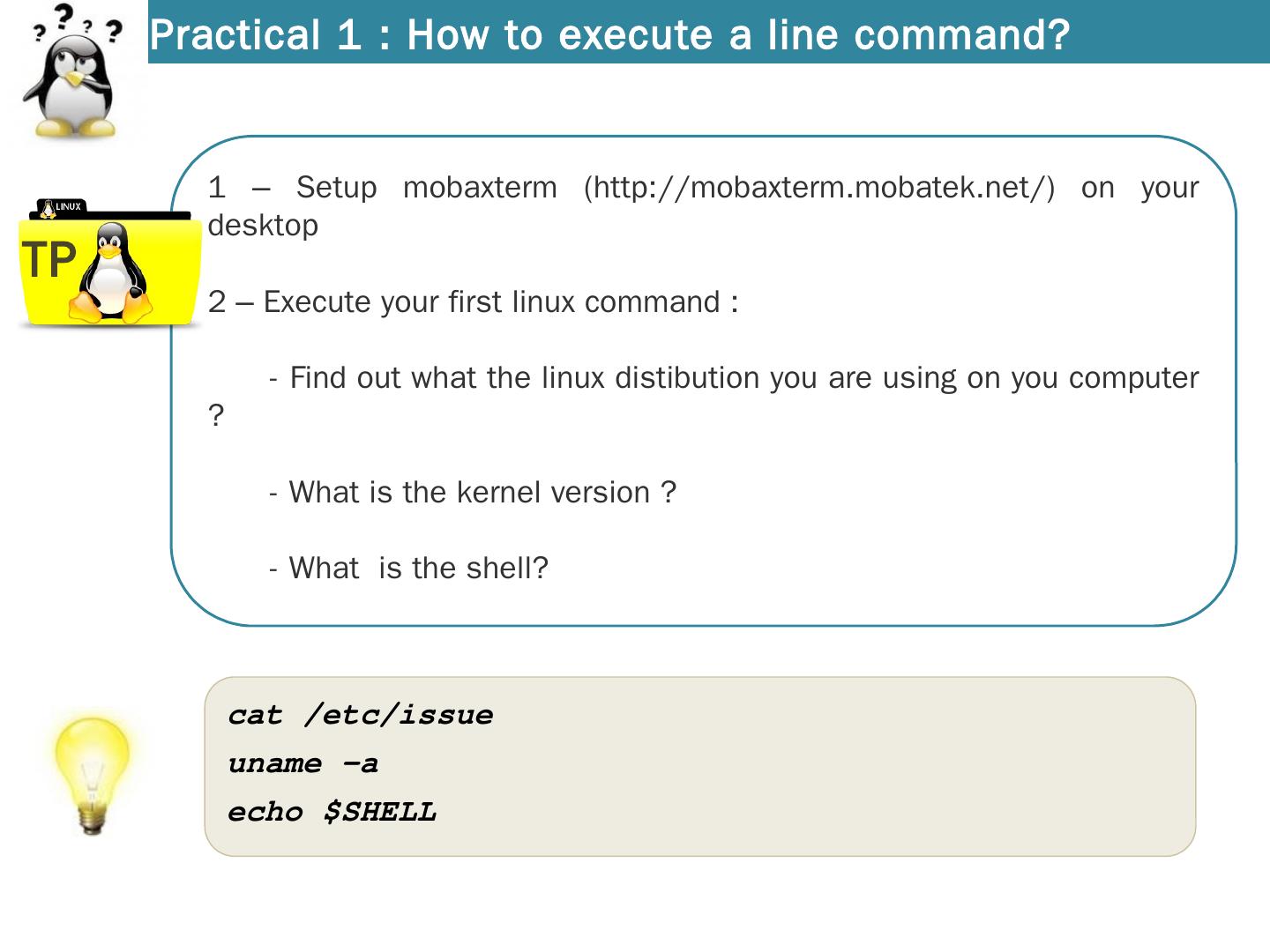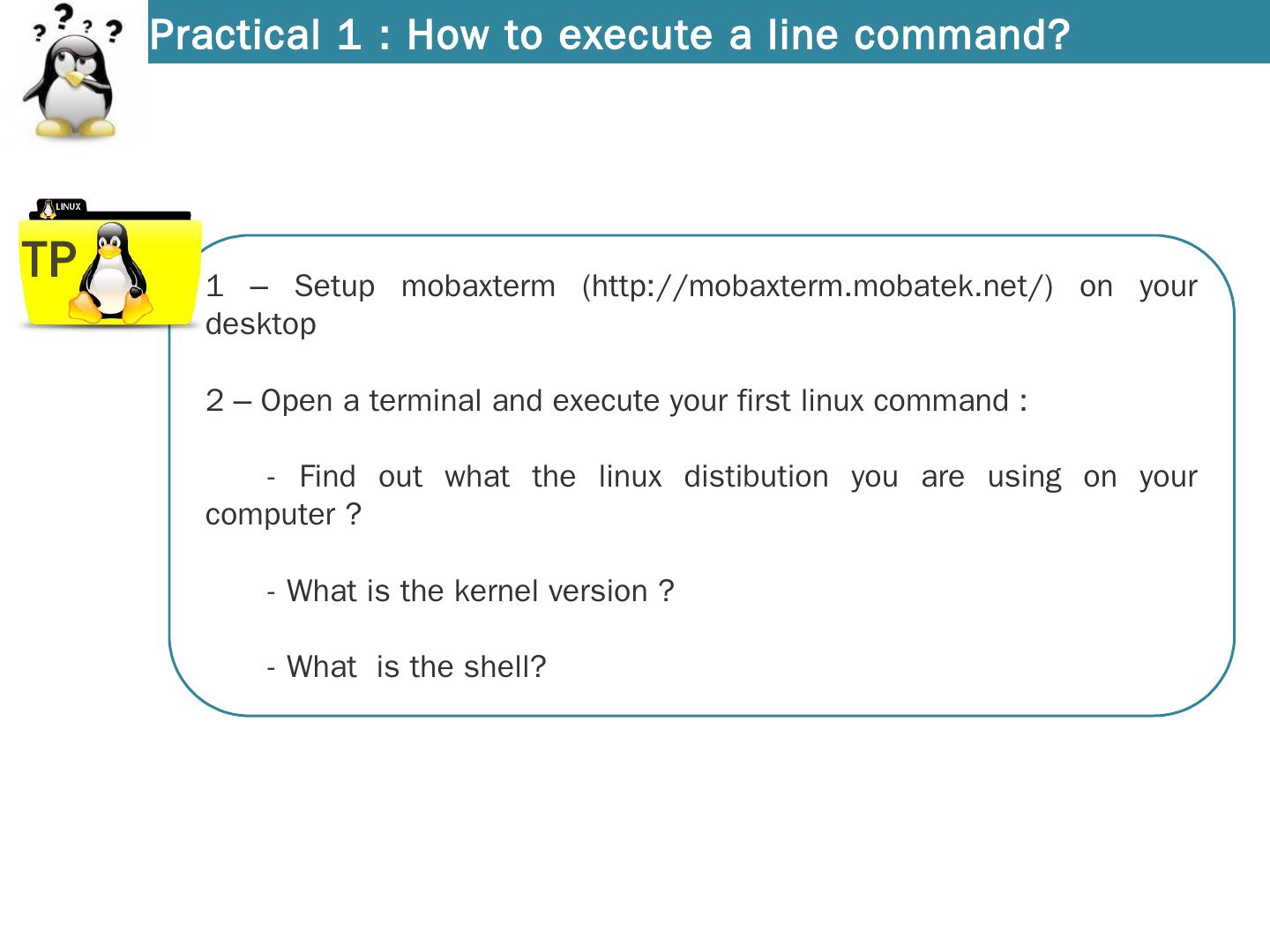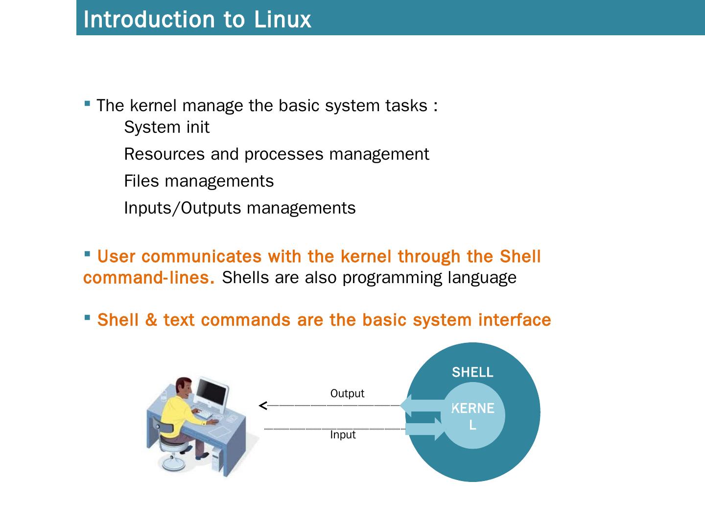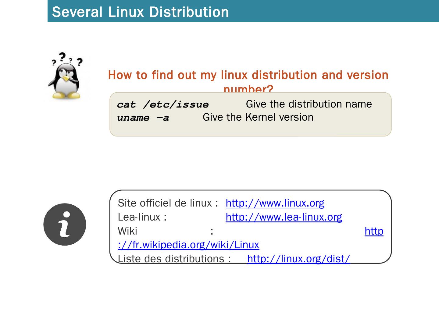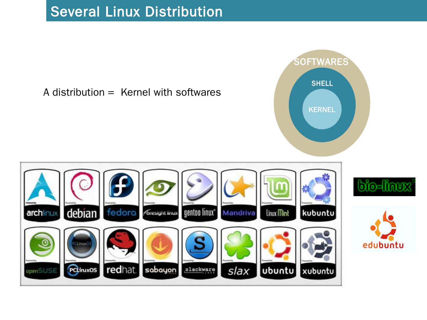 Introduction to Linux. A distribution = Kernel with softwares. SHELL. KERNEL. SOFTWARES. Several Linux Distribution. How to find out my linux distribution and ...