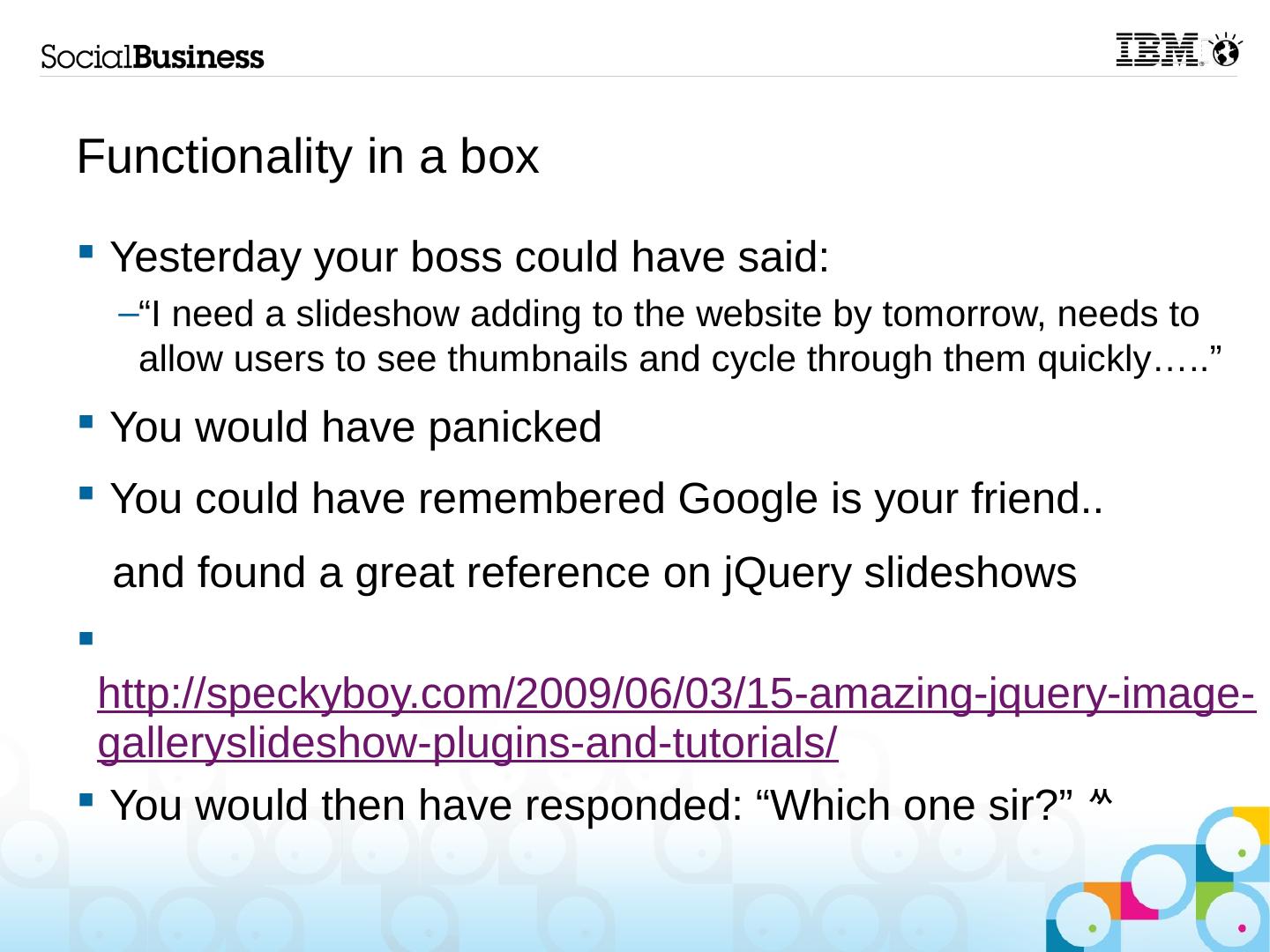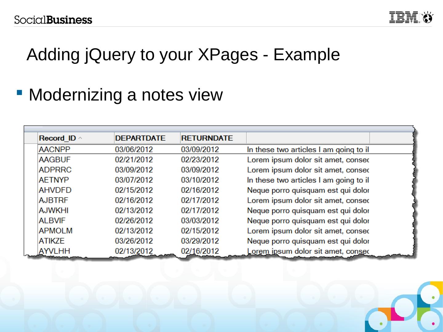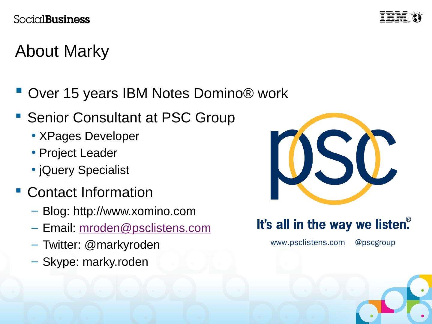 BP103 jQuery - The world's most popular JavaScript library comes to XPages. Dr. Mark Roden. Senior Consultant, PSC Group LLC. About Marky. Over 15 years ...
