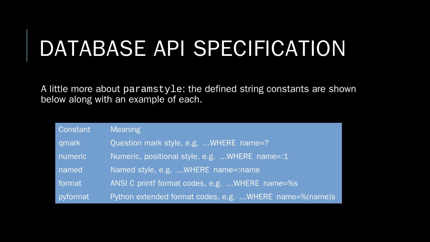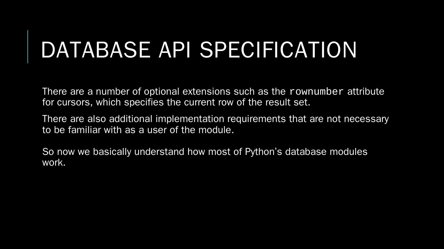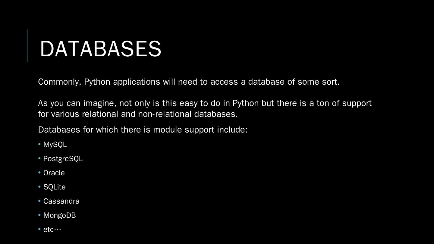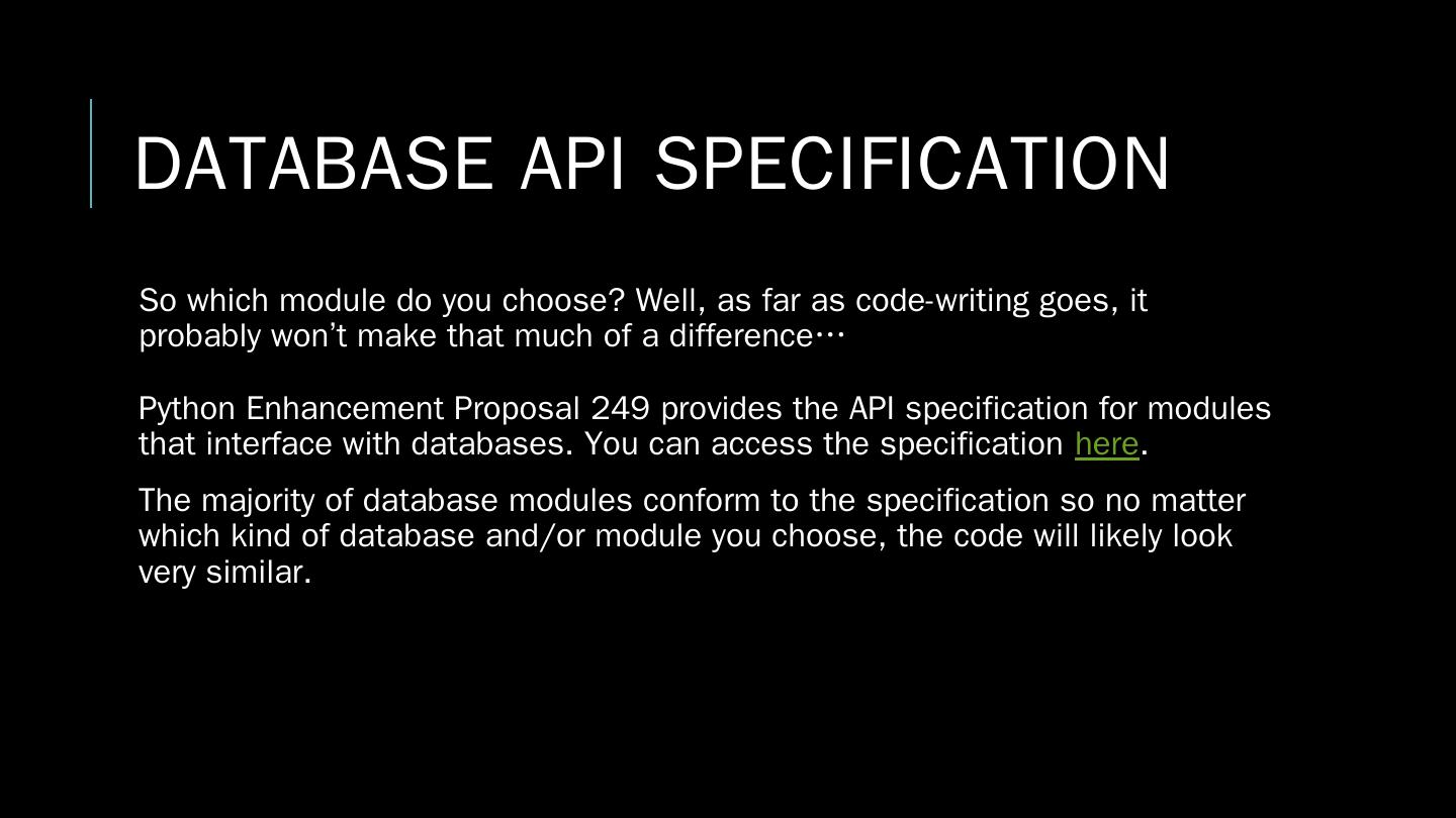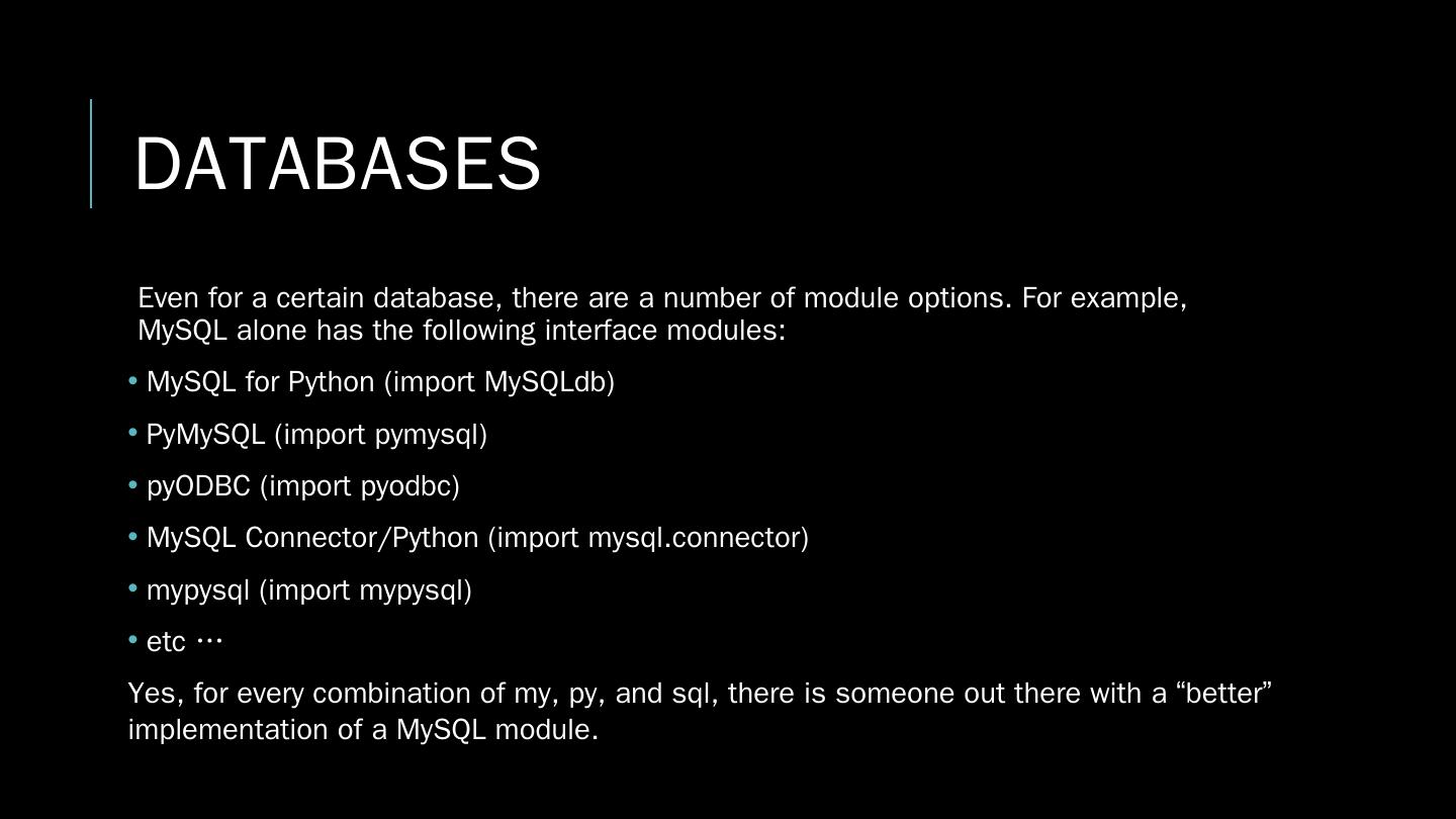 For example, MySQL alone has the following interface modules: MySQL for Python (import MySQLdb); PyMySQL (import pymysql); pyODBC (import pyodbc) ...