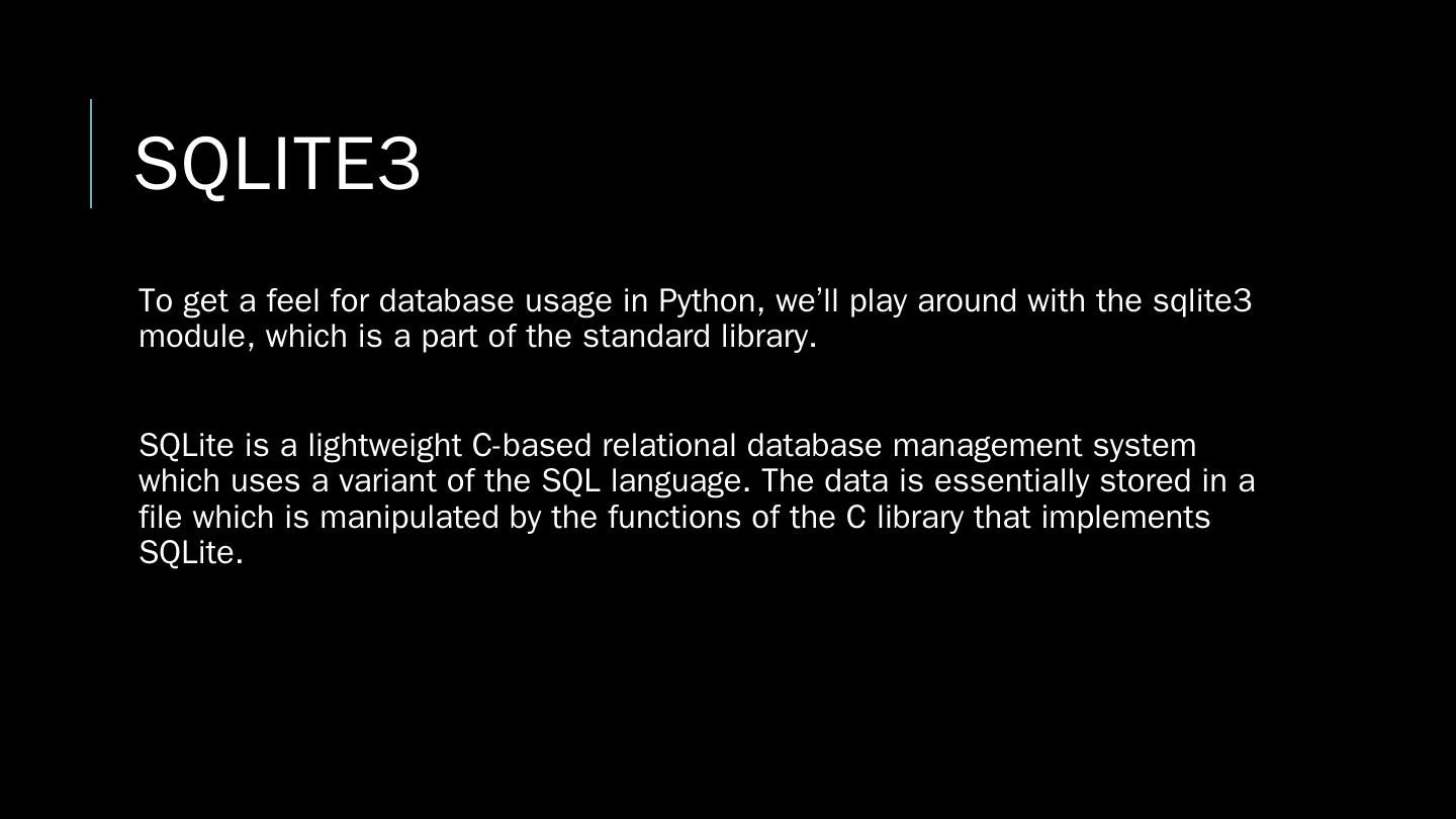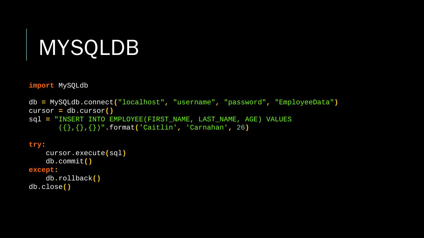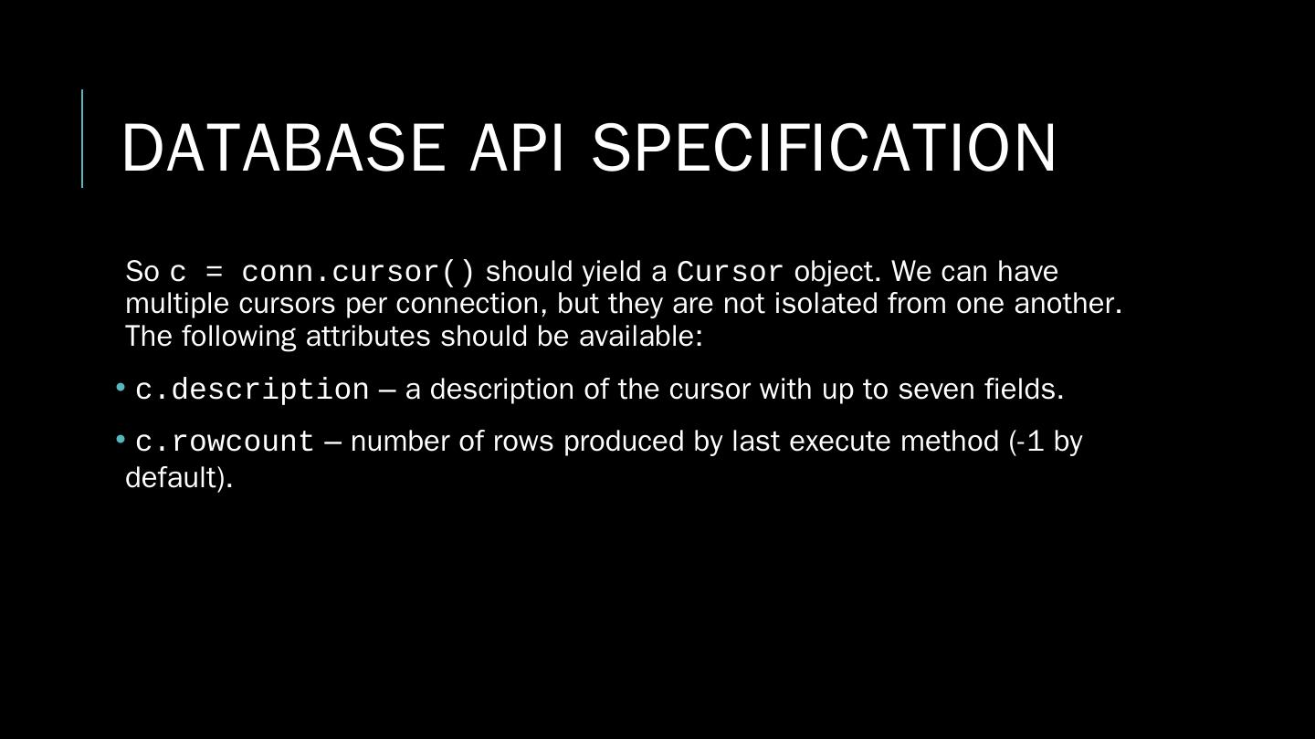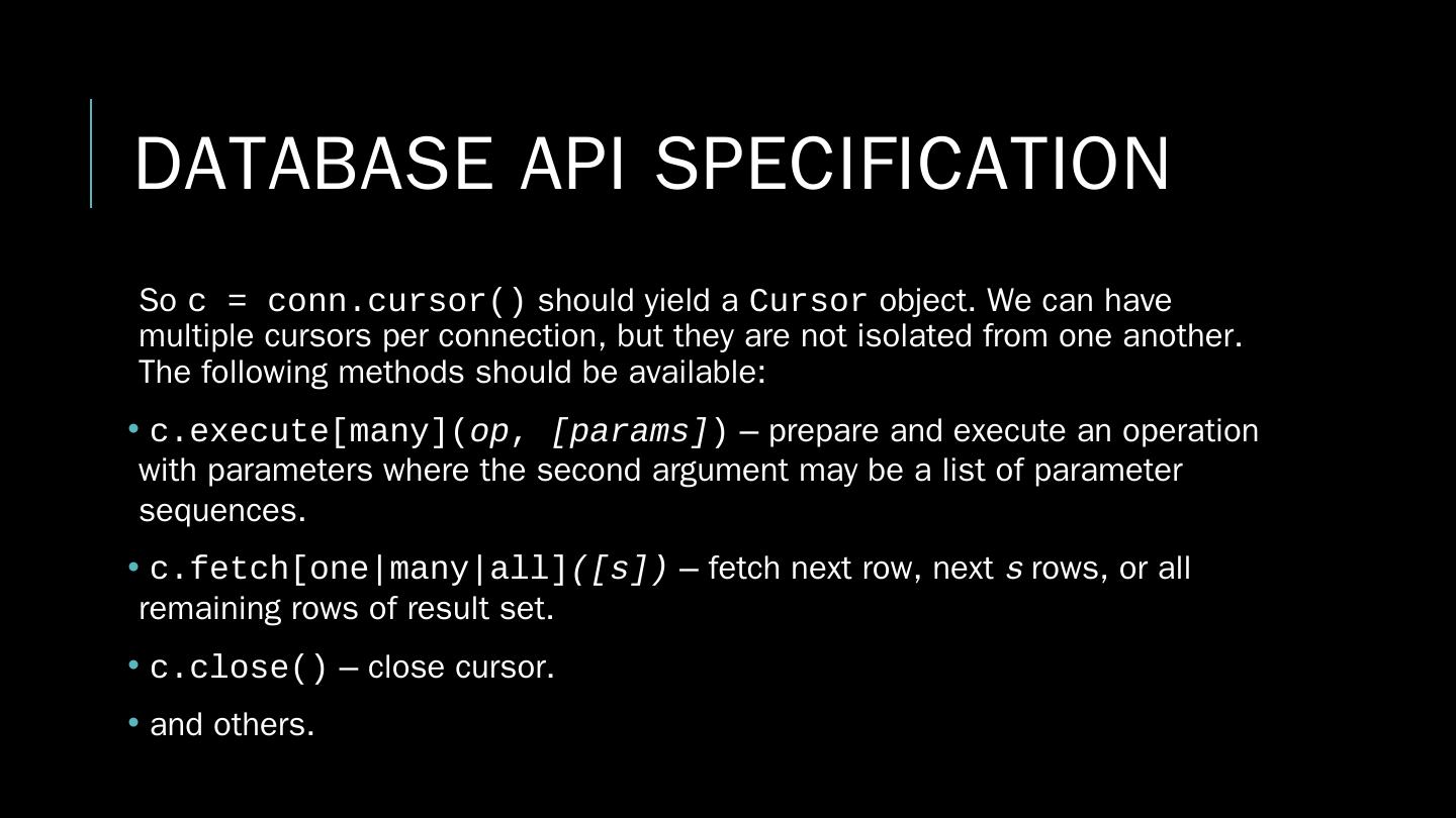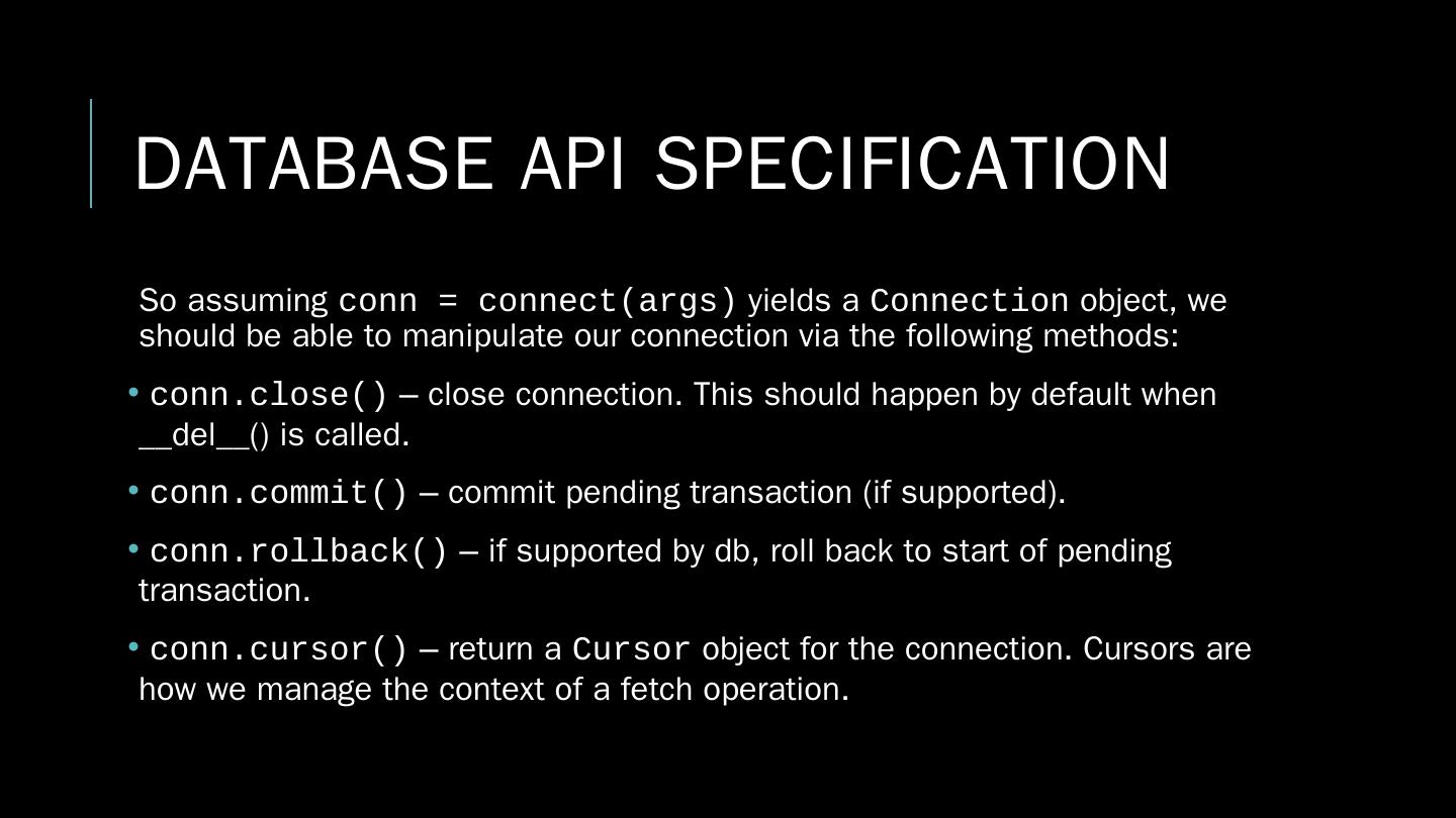 For example, MySQL alone has the following interface modules: MySQL for Python (import MySQLdb); PyMySQL (import pymysql); pyODBC (import pyodbc) ...