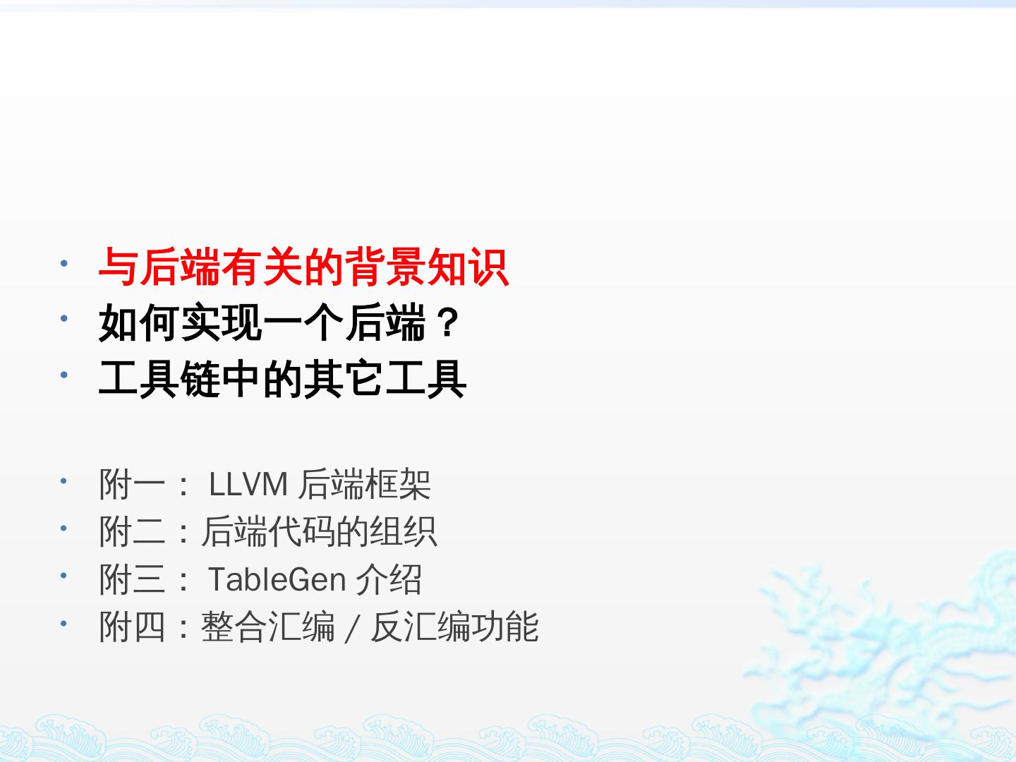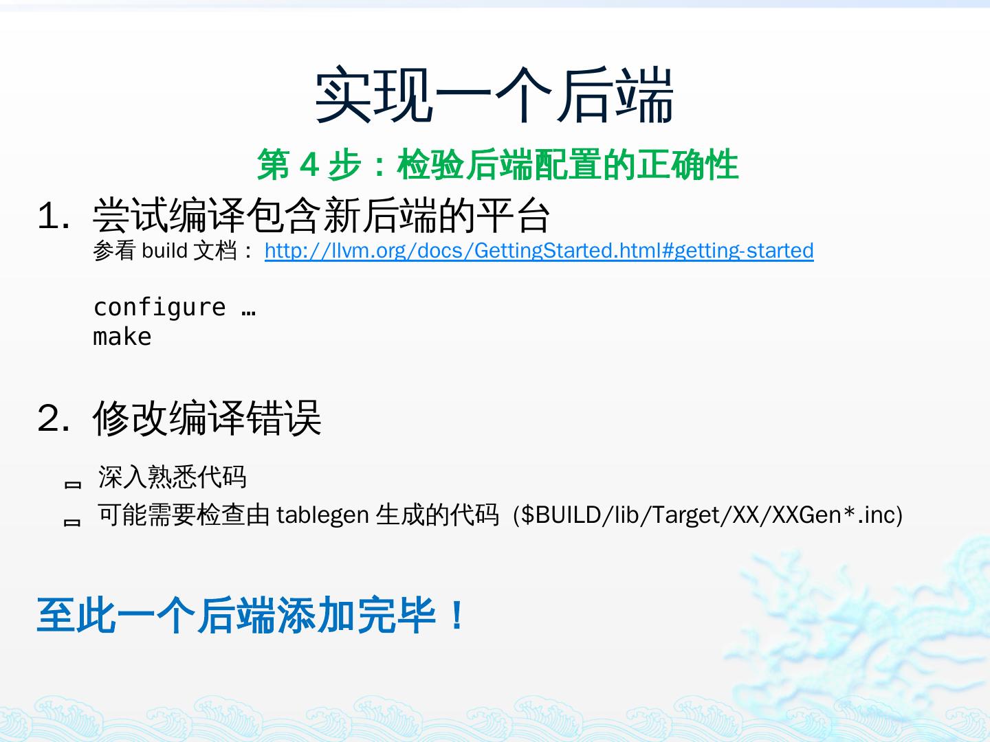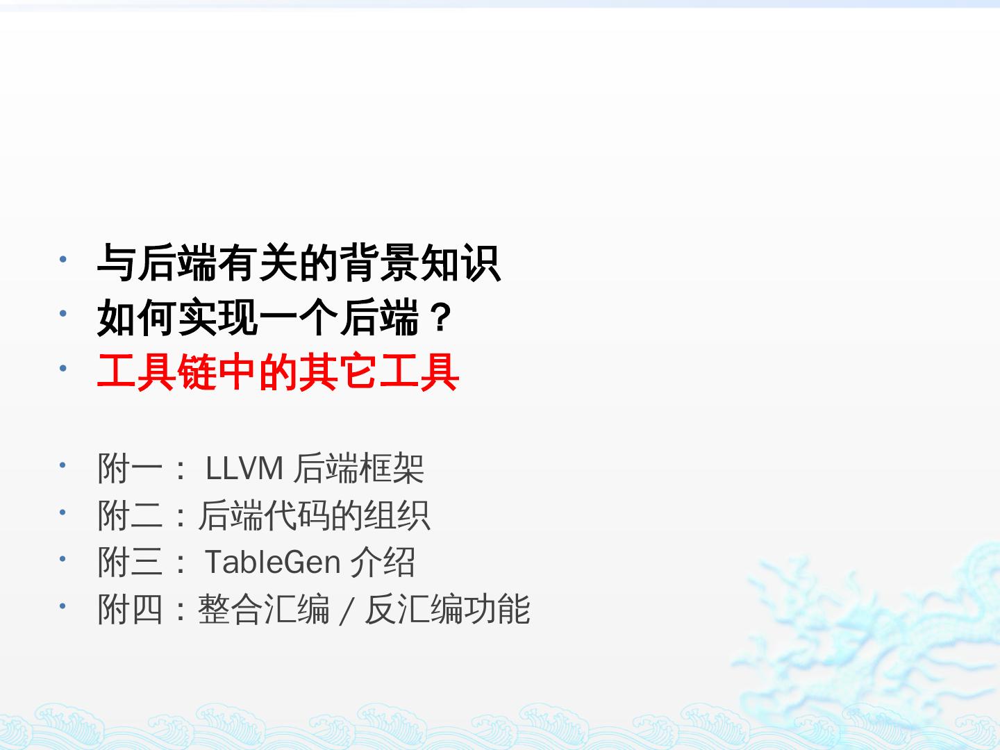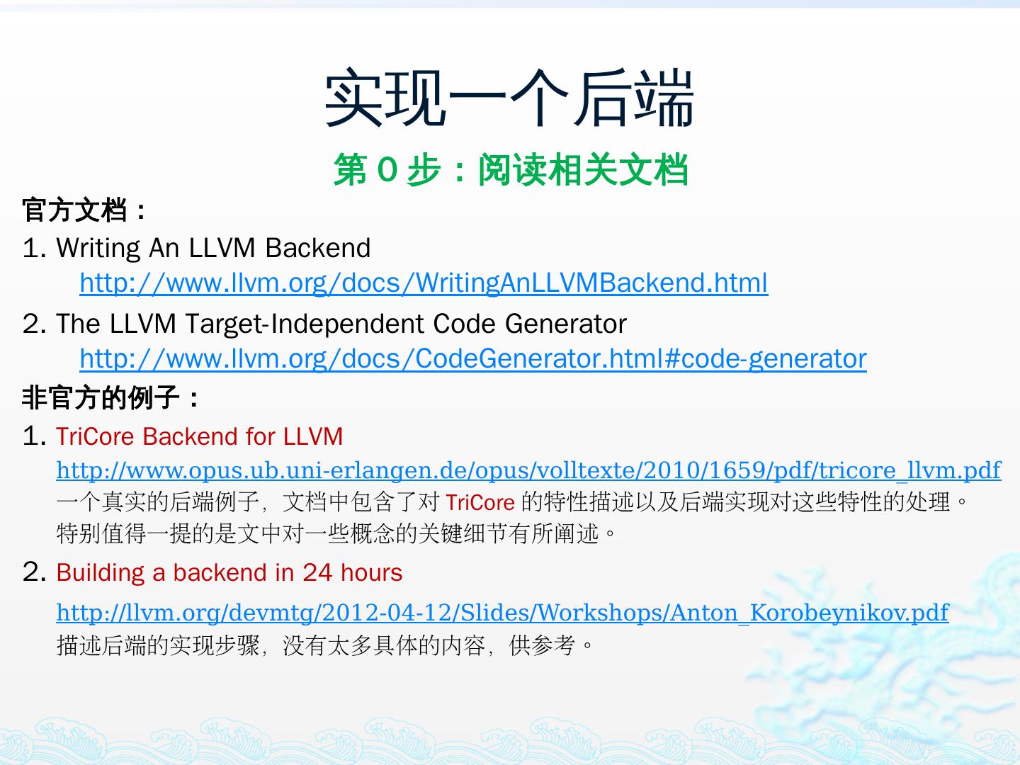 利用LLVM实作了一个编译器后端,把中间语言表示(IR)变成了目标语言二进制代码,并介绍了相关的编译器后端工具链。