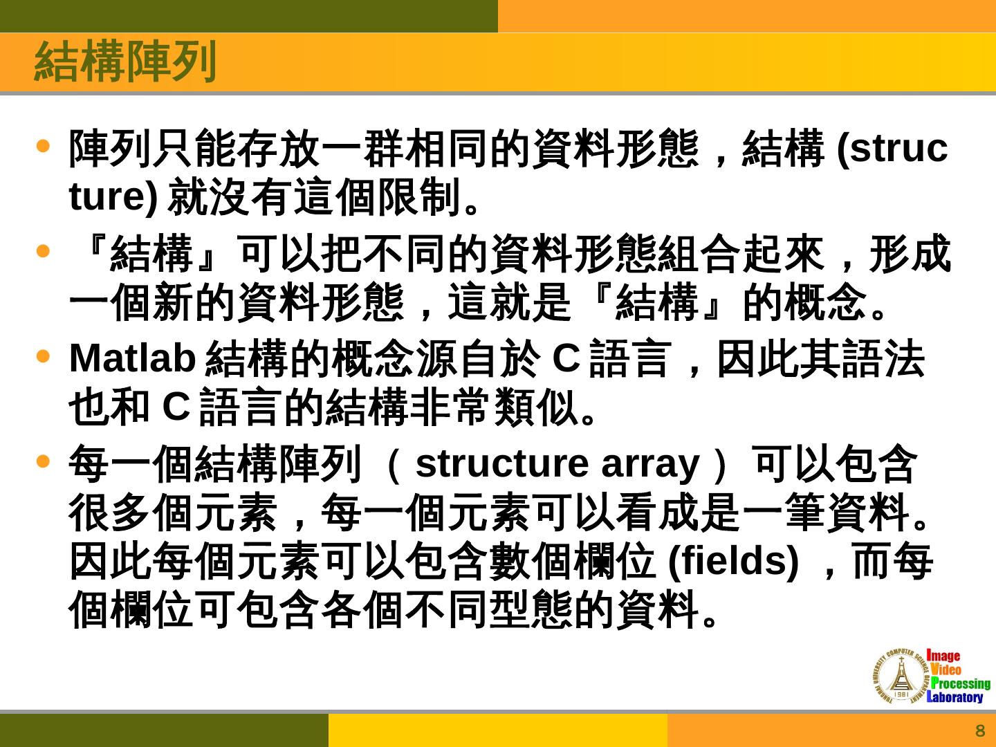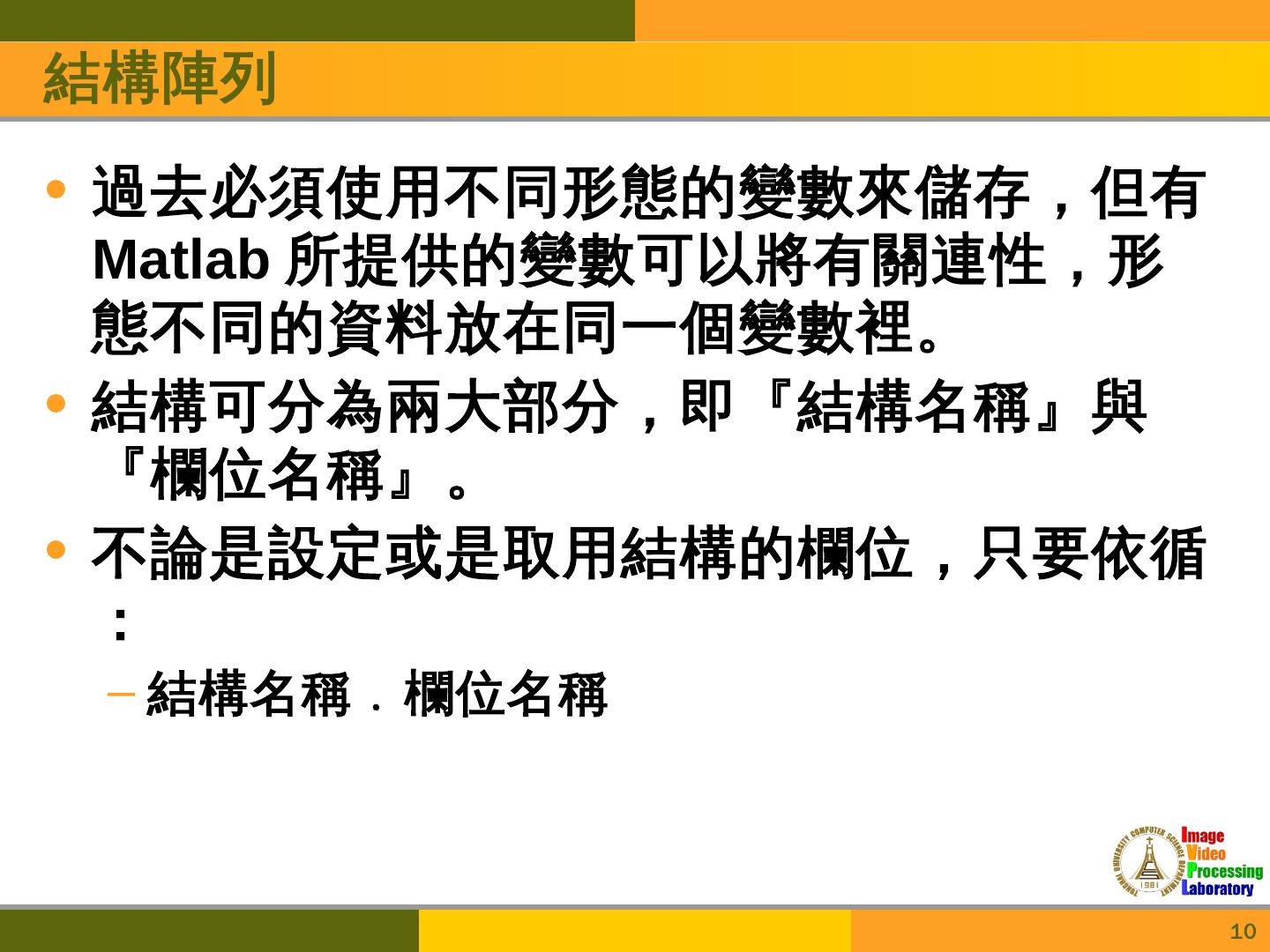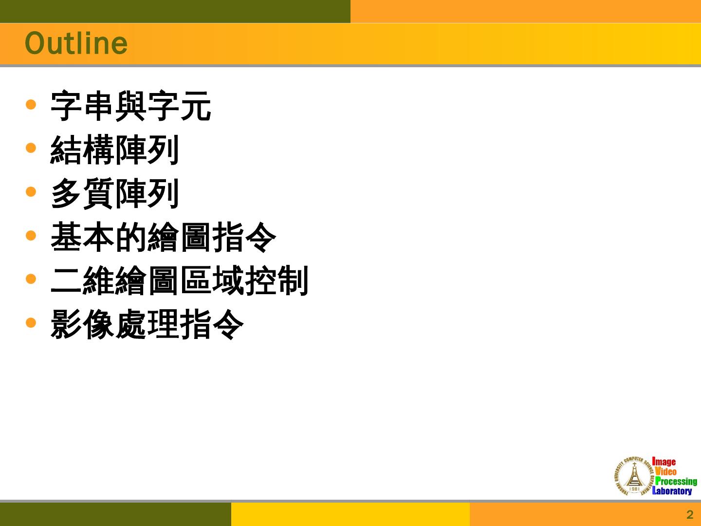 Matlab教學. Speaker:林昱志. Date:2012/10/25. 1. Outline. 字串與字元; 結構陣列; 多質陣列; 基本的繪圖指令; 二維繪圖區域控制; 影像處理指令. 2. 字串與字元.