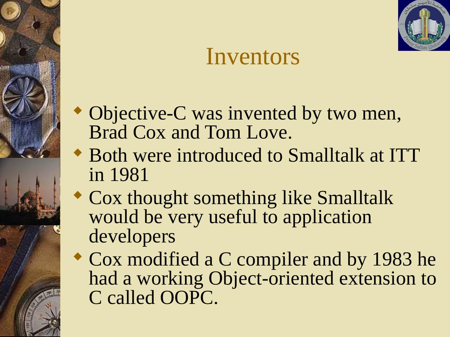 Objective-C was invented by two men, Brad Cox and Tom Love. Both were introduced to Smalltalk at ITT in 1981; Cox thought something like Smalltalk would be ...