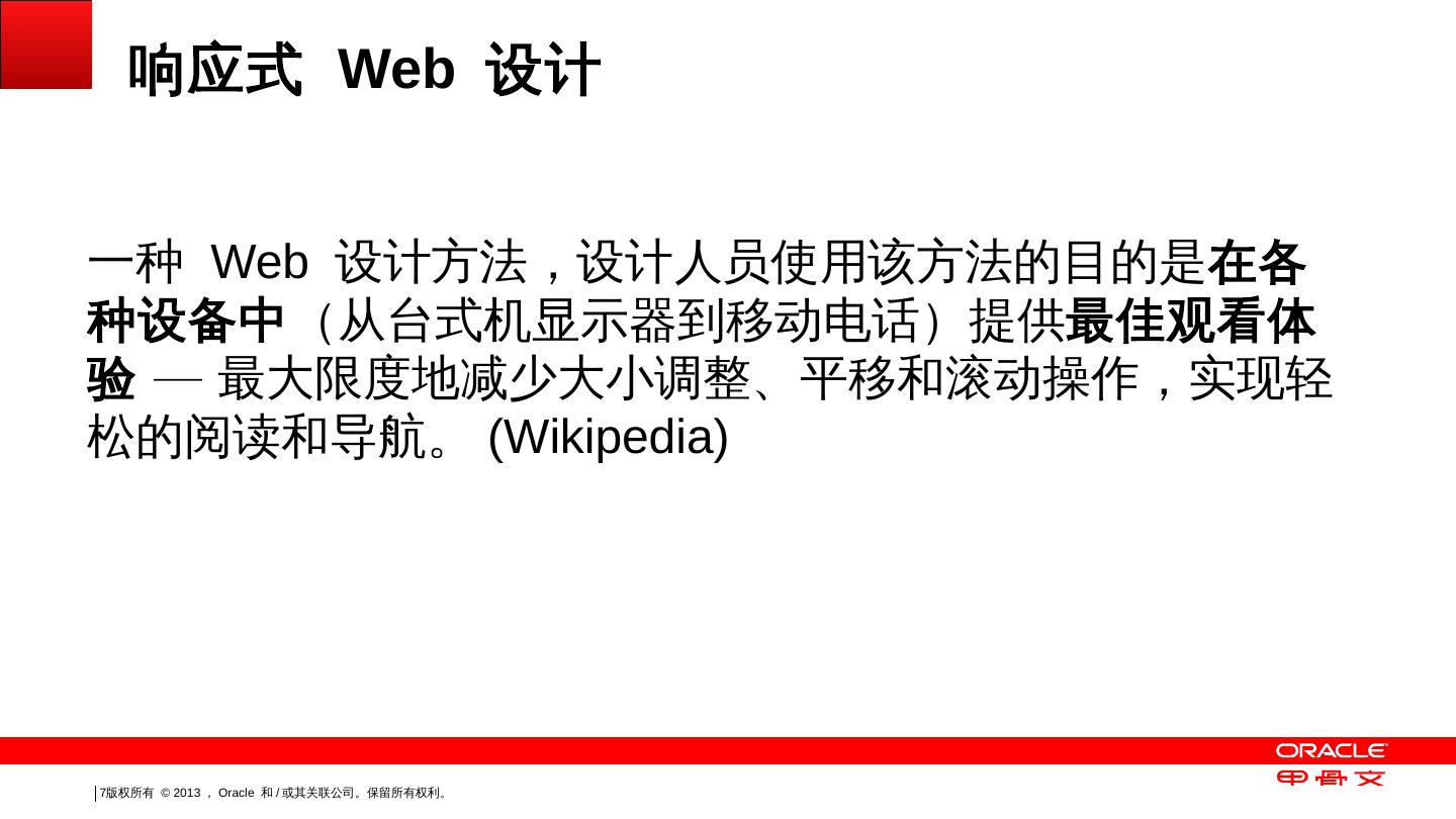 响应式Web 设计. 一种Web 设计方法,设计人员使用该方法的目的是在各种设备中( 从台式机显示器到移动电话)提供最佳观看体验— 最大限度地减少大小调整、平移 ...