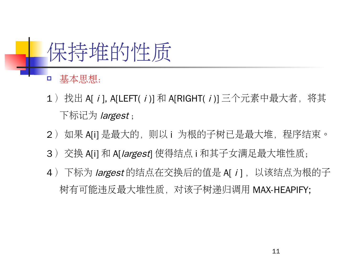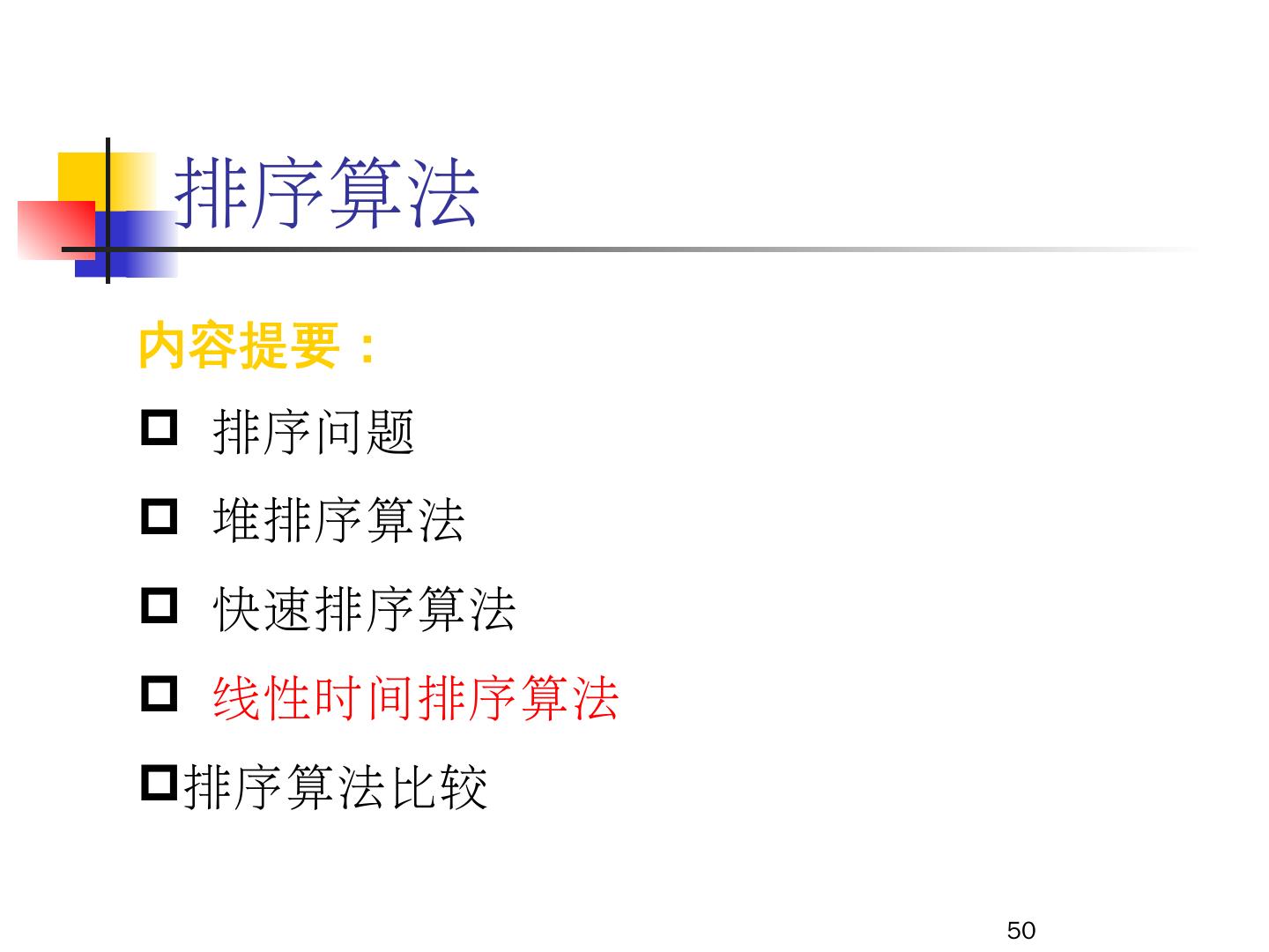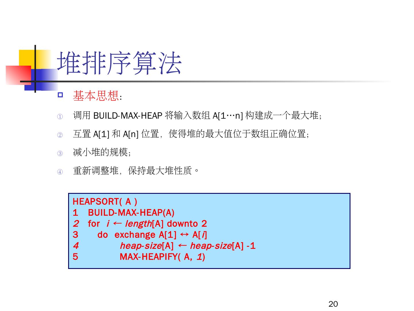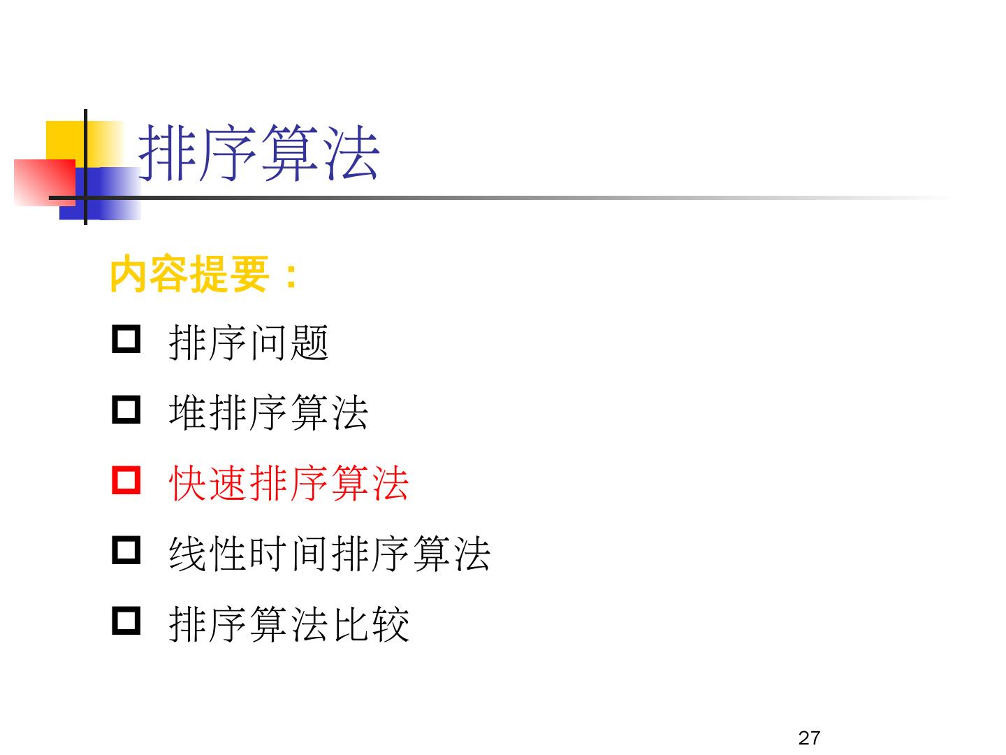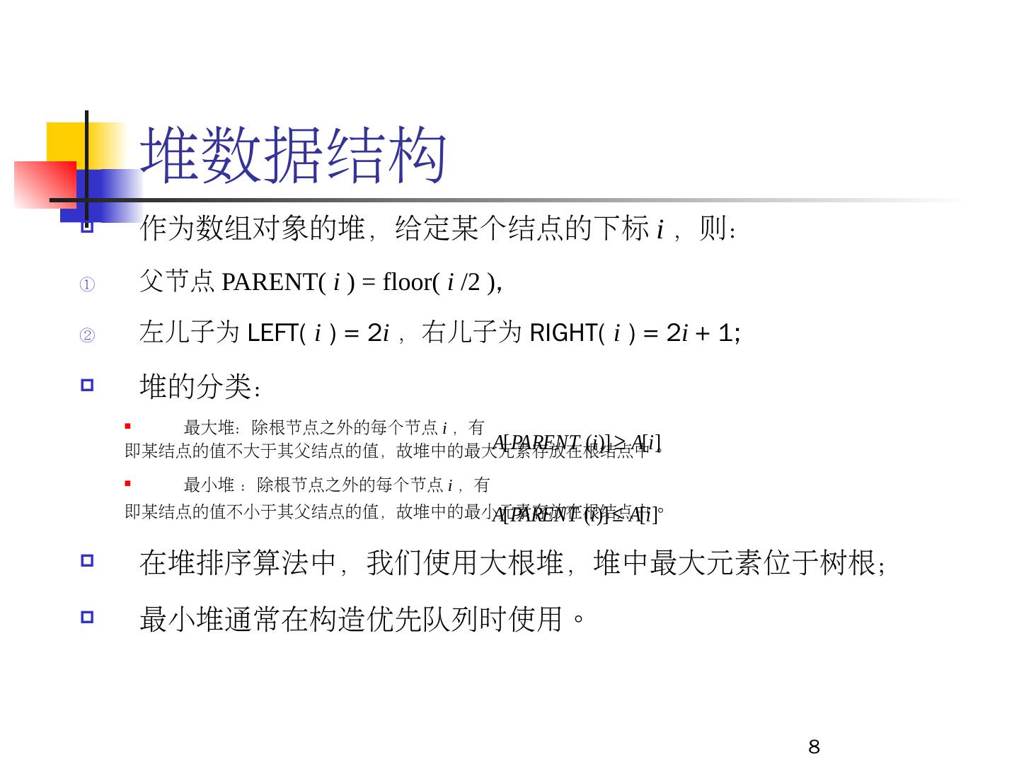 排序问题; 堆排序算法; 快速排序算法; 线性时间排序算法; 排序算法比较. 排序算法. 2 ... 堆数据结构是一种数组对象,可以被视为一棵完全二叉树。树中每个节点与数组 ...